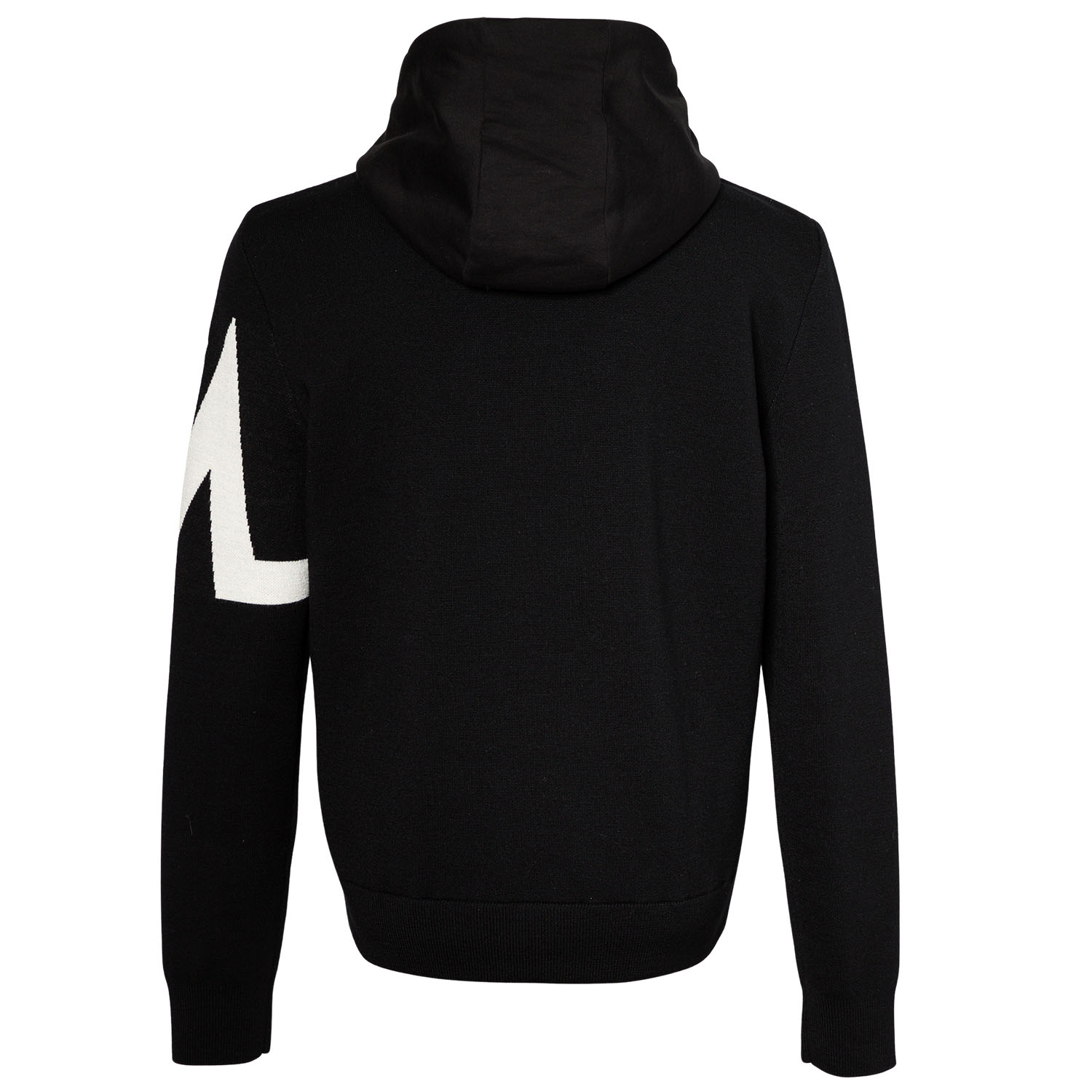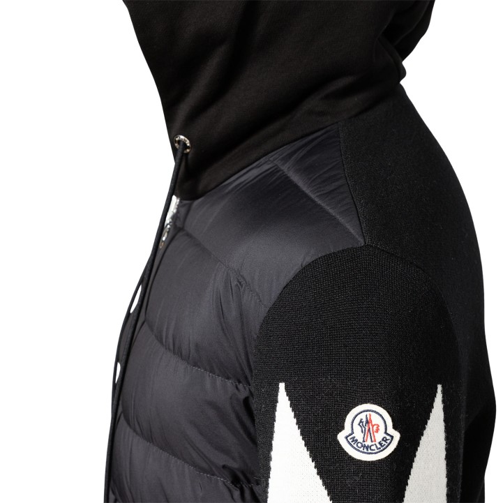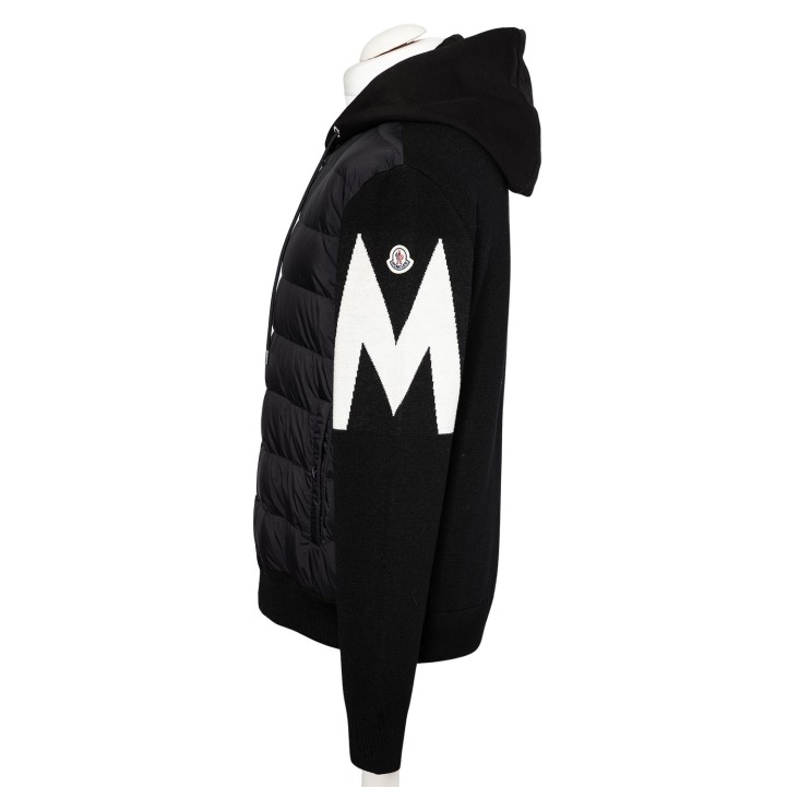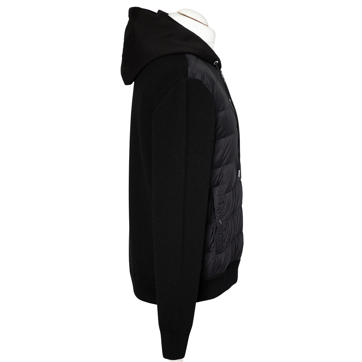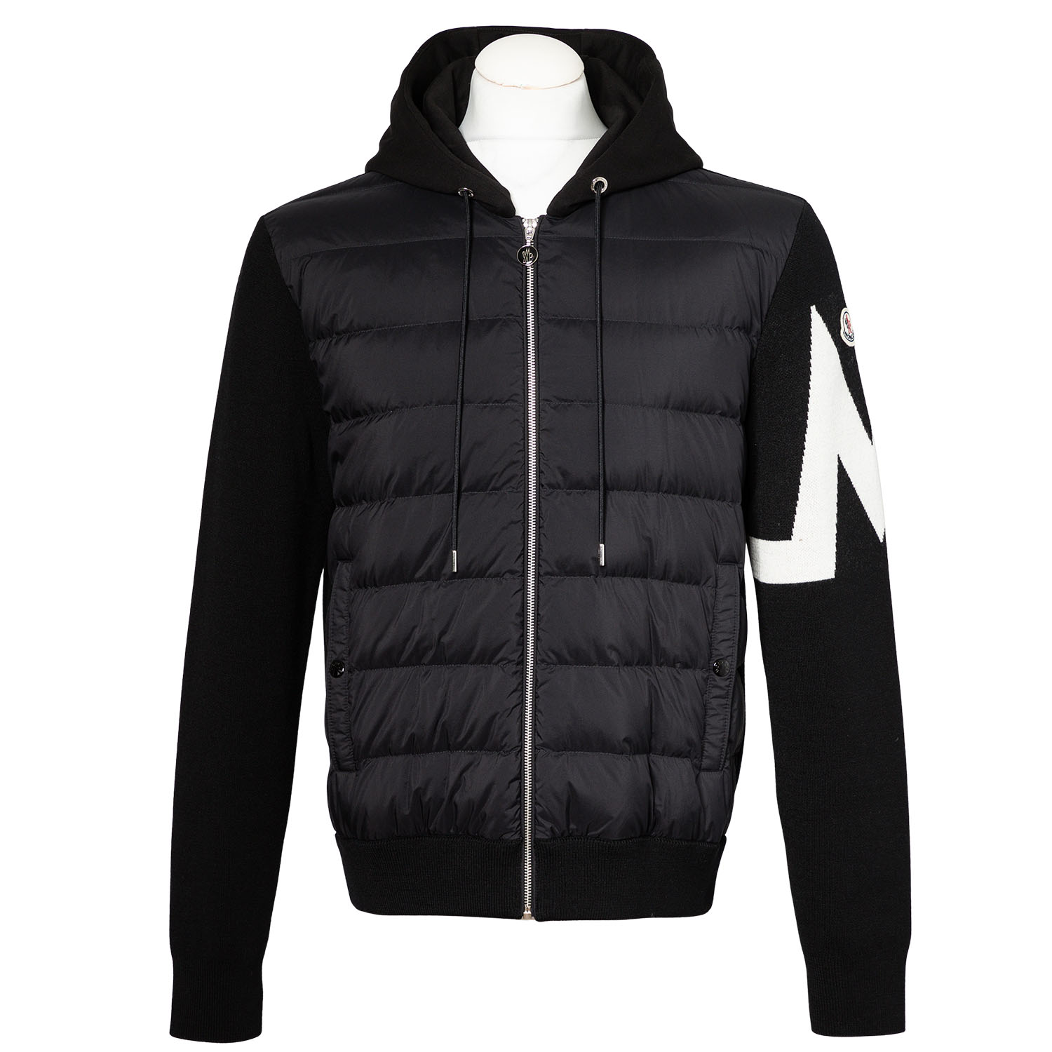 Schwarzes Modell mit weißem Design, Front mit horizontaler Steppung und Daunenfutter, Kapuze, Reißverschluss und Eingrifftaschen. Tragespuren vorhanden.