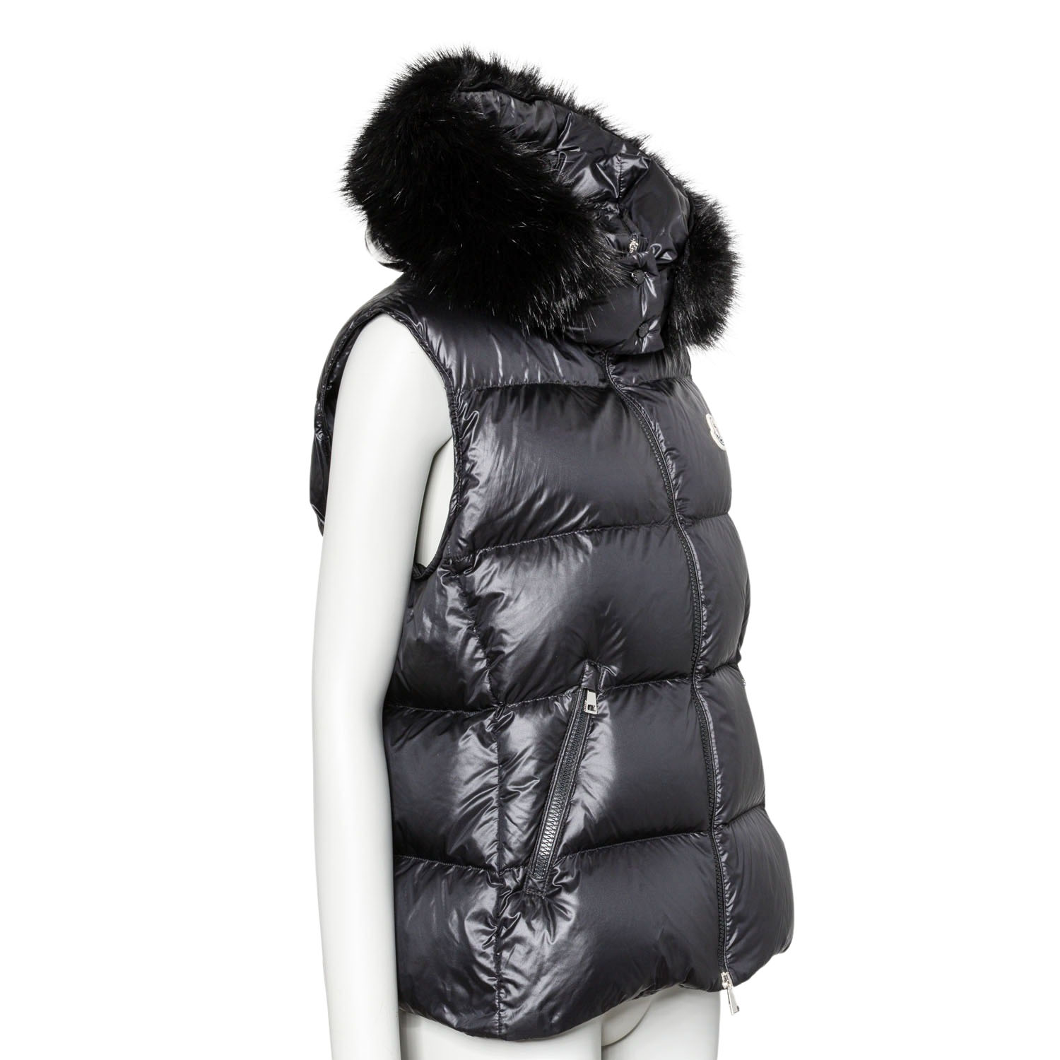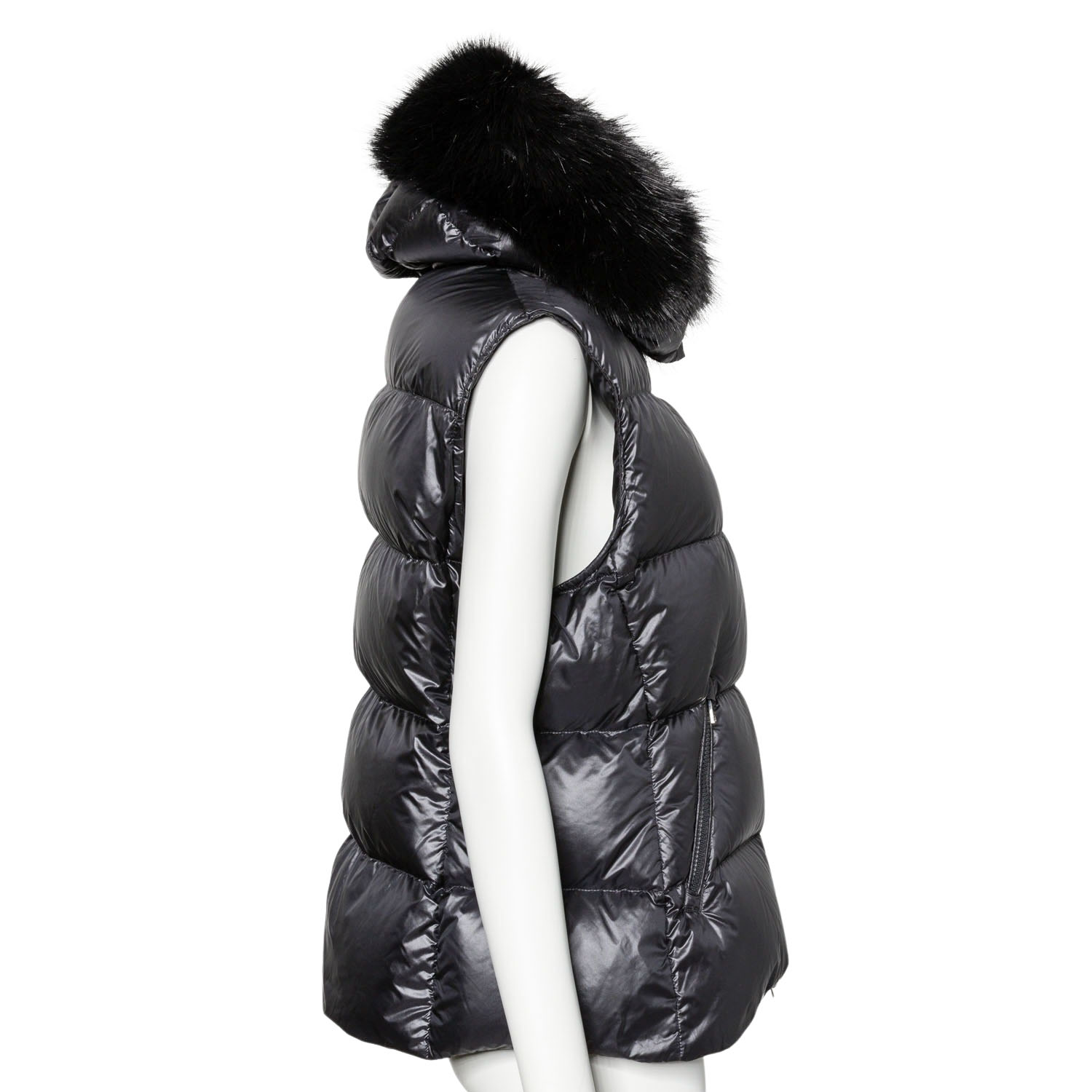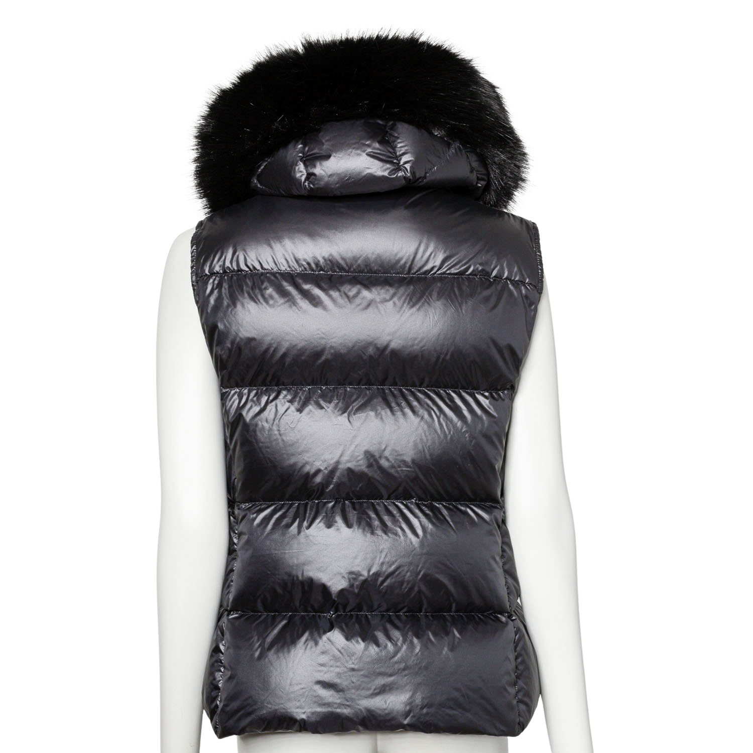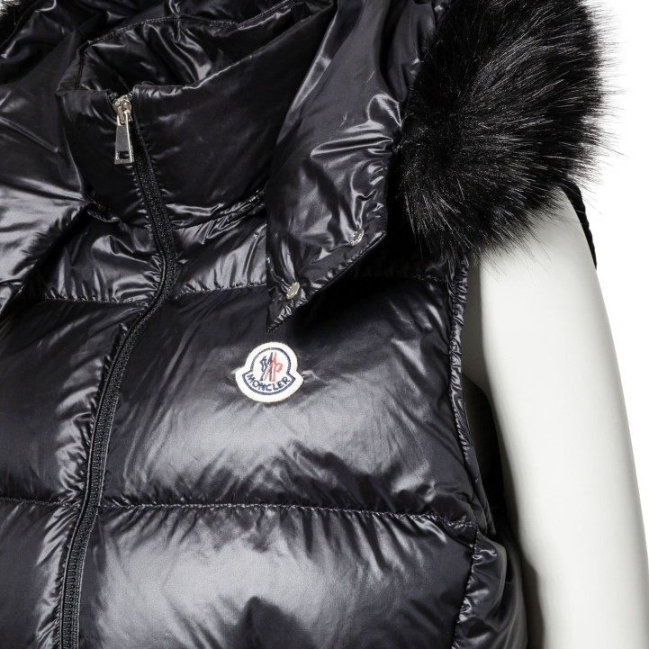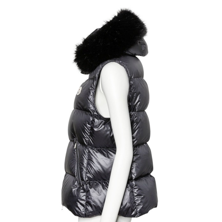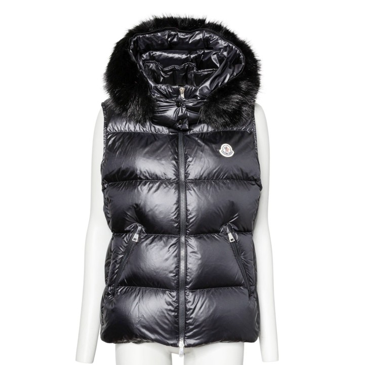 Schwarzes Modell mit horizontaler Steppung, Reißverschluss, Taschen und abnehmbarer Kapuze mit ebenfalls abnehmbarem Kunstpelzbesatz. Guter Zustand.