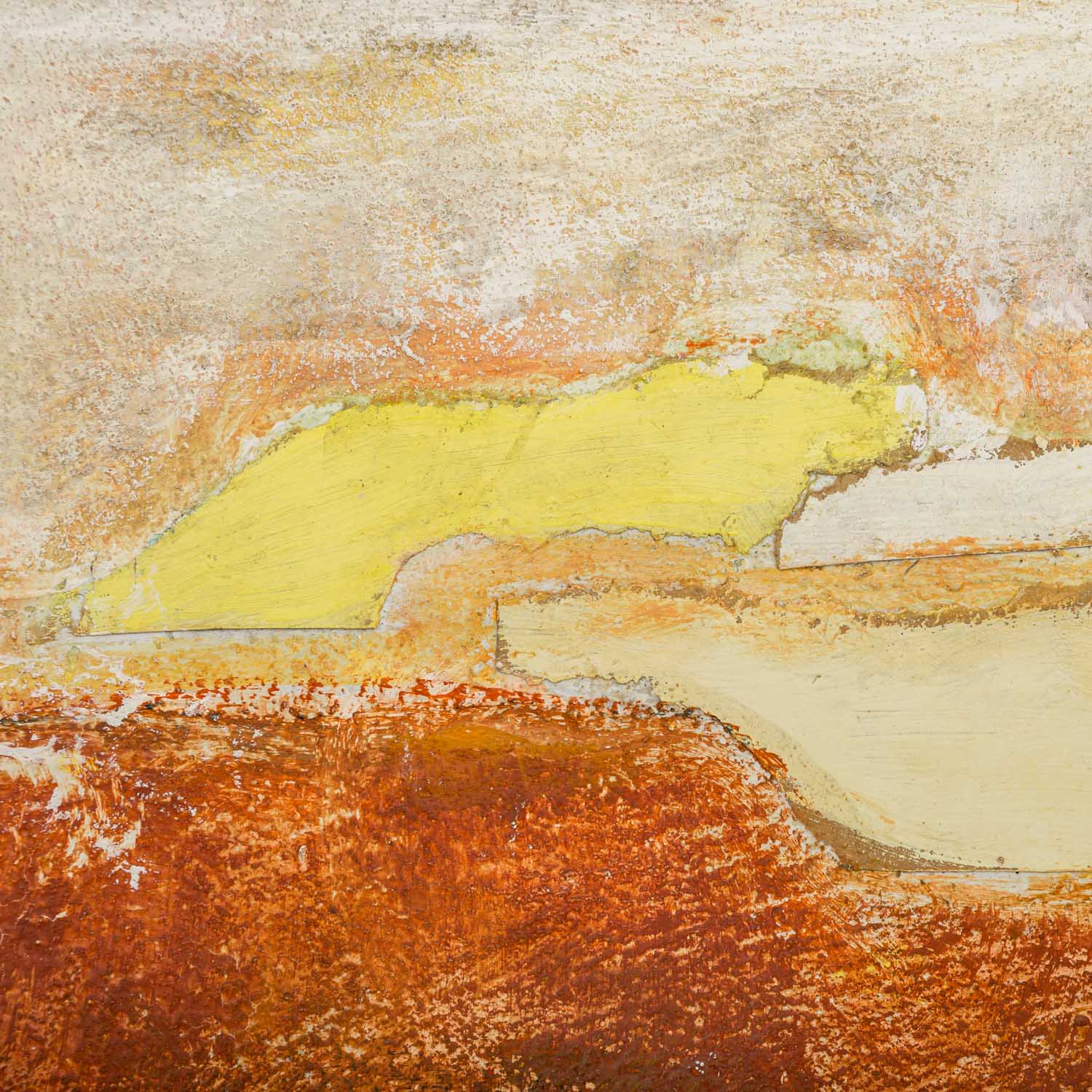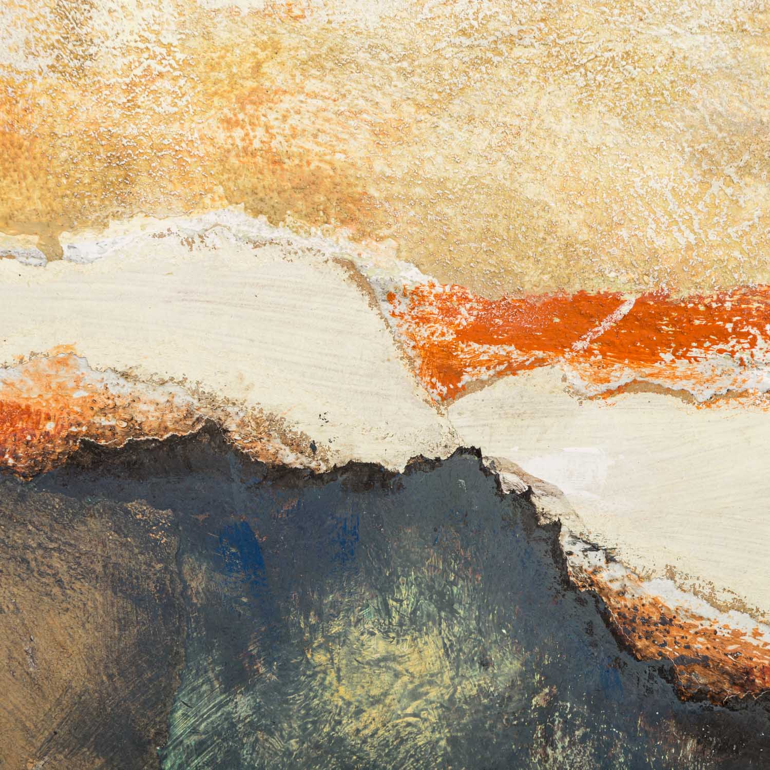 MONOGRAMMIST BR (Künstler/in 20. Jh.), ""Abstrakte Landschaftskomposition"", u.re. monogrammiert und datiert (19)87, Mischtechnik tlw. collagiert/Holzfaserplatte, HxB: ca. 70x90 cm (72x92 cm mit Rahmen). Altersspuren, minim. Farbabplatzer. Mit Rahmen.