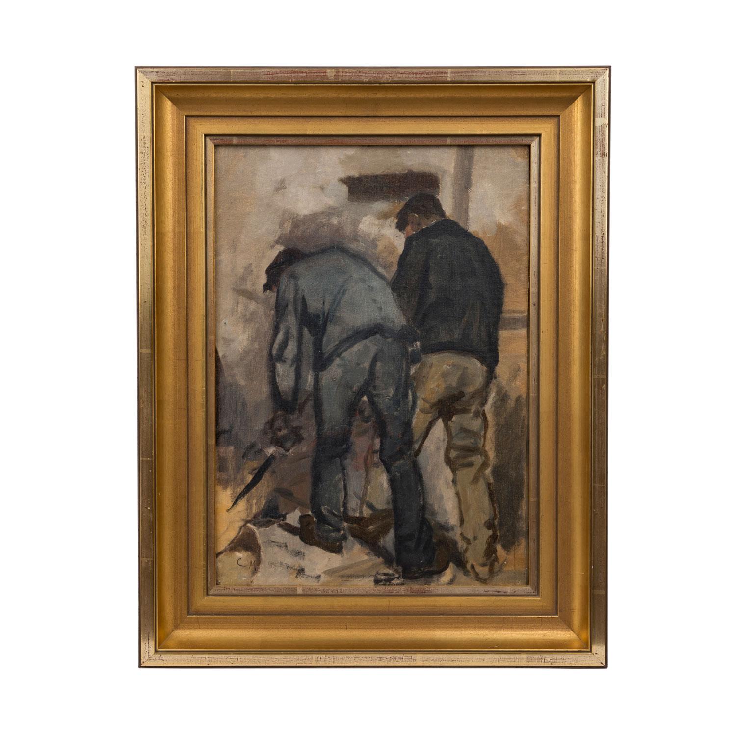 MONOGRAMMIST CM (Maler 19./20. Jh.), ""Zwei Arbeiter am Hochofen"", Studie der Rückenansicht, u.li. monogrammiert, Öl/Leinwand auf Holz aufgezogen, HxB: ca. 41x28,5 cm (52x41 cm mit Rahmen). Rest.. Mit Rahmen. Min. Altersspuren.