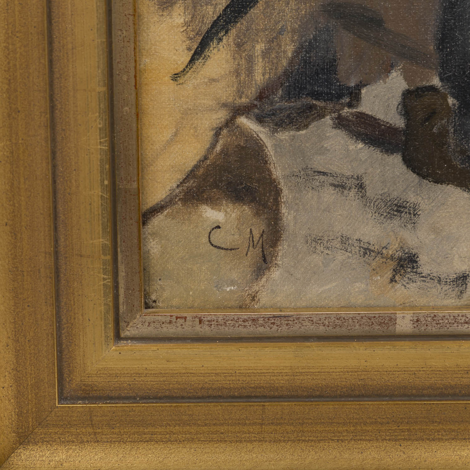 MONOGRAMMIST CM (painter 19th / 20th century), ""Two workers at the furnace"", Study of the back view, monogrammed, oil / canvas mounted on wood, hxw: approx. 41x28,5 cm (52x41 cm with frame). Restored. With frame. Minimal Signs of age.