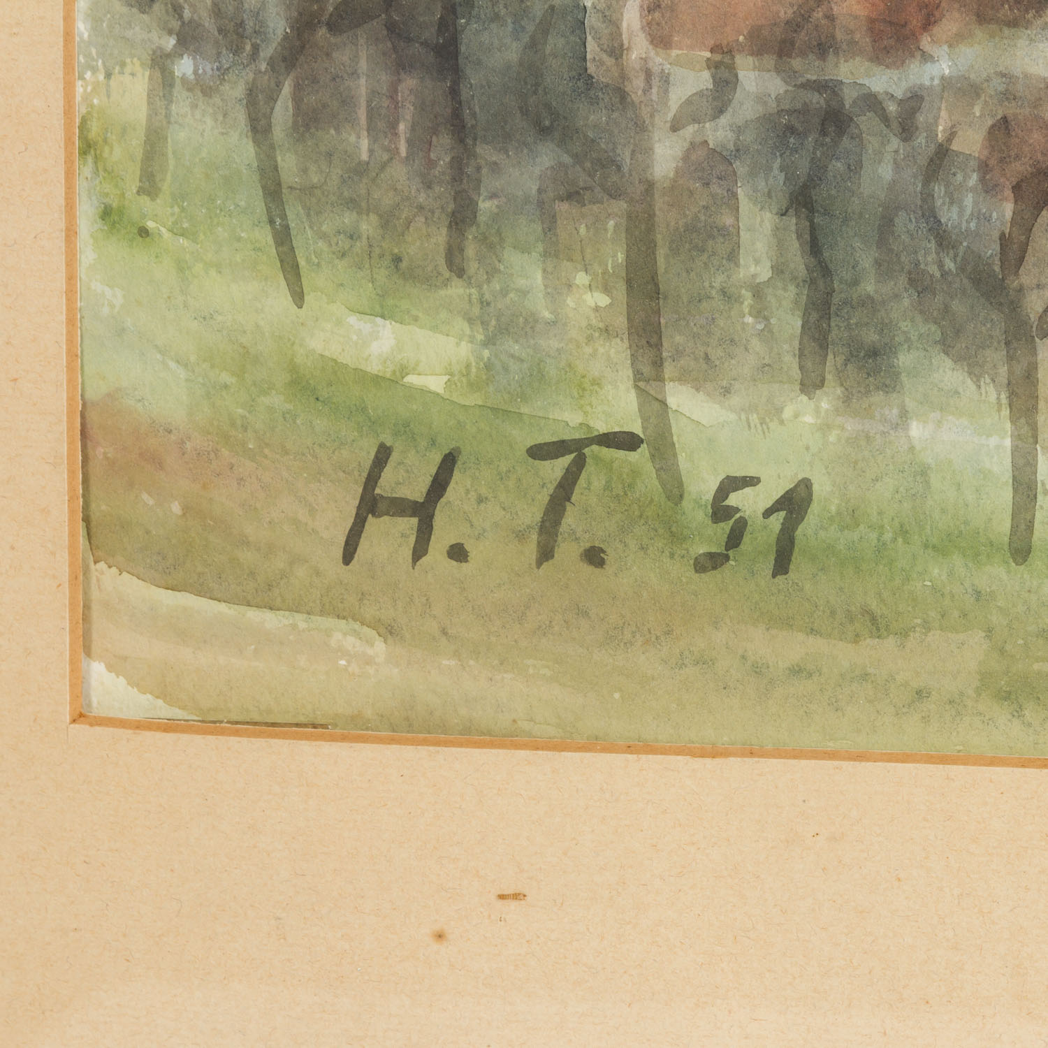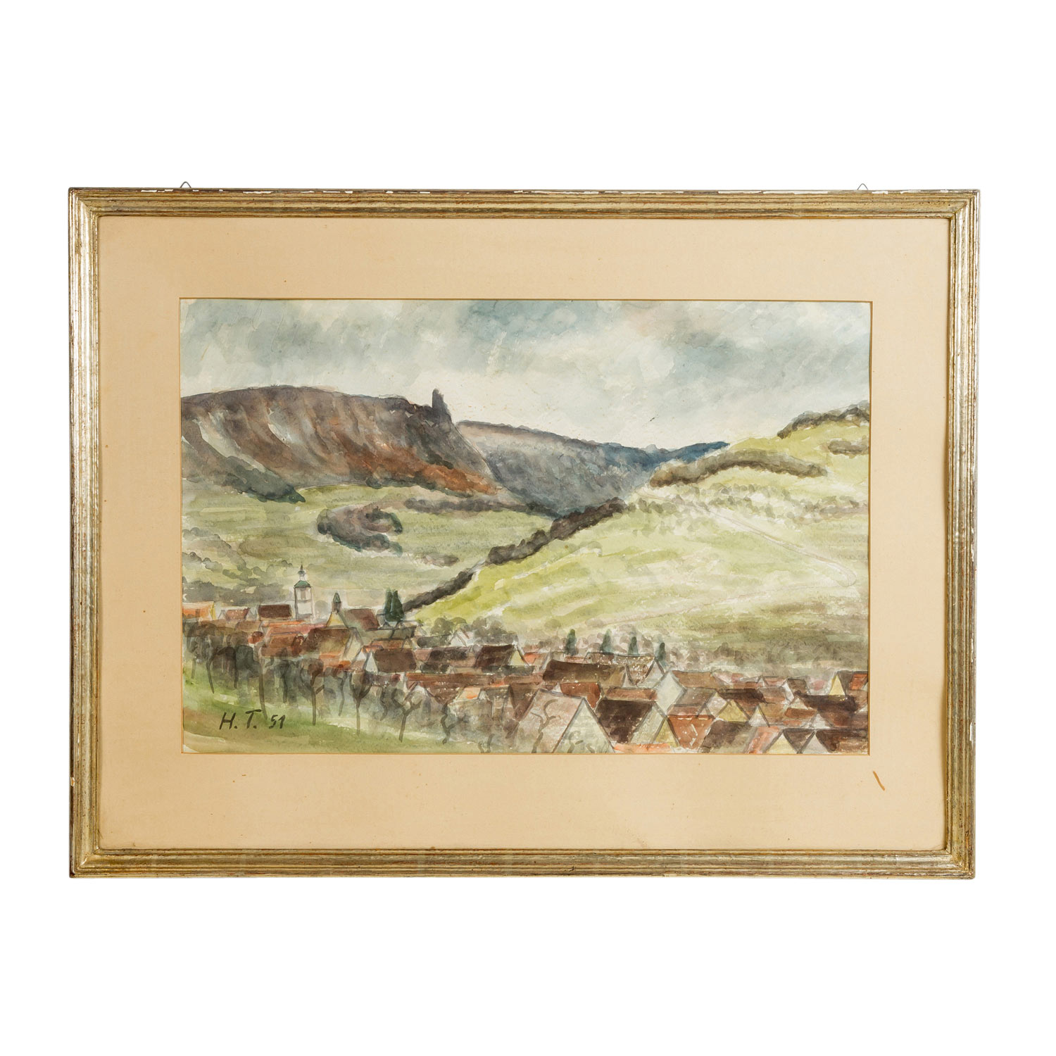 MONOGRAMMIST H. T. (Künstler/in 20. Jh.), ""Blick auf Weilheim"", u.li. monogrammiert und datiert (19)51, Aquarell/Papier, HxB: Passepartoutausschnitt ca. 46x69 cm (70x91 cm mit Rahmen). Leicht gewellt, gebräunt und fleckig. Im Passepartout hinter Glas gerahmt (Rahmenkanten part. beschädigt).