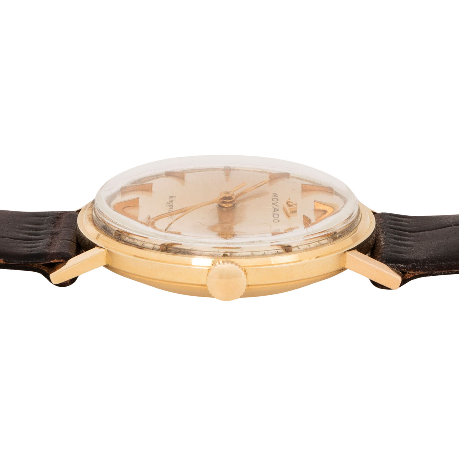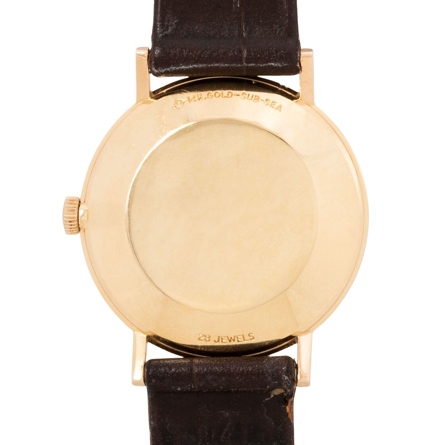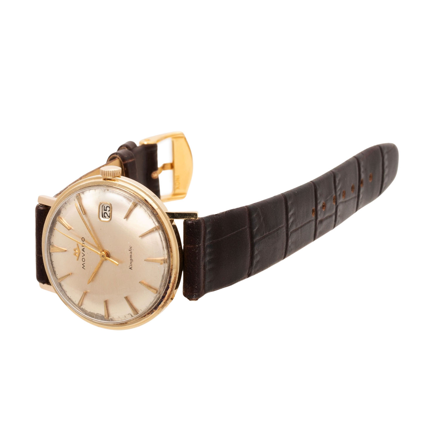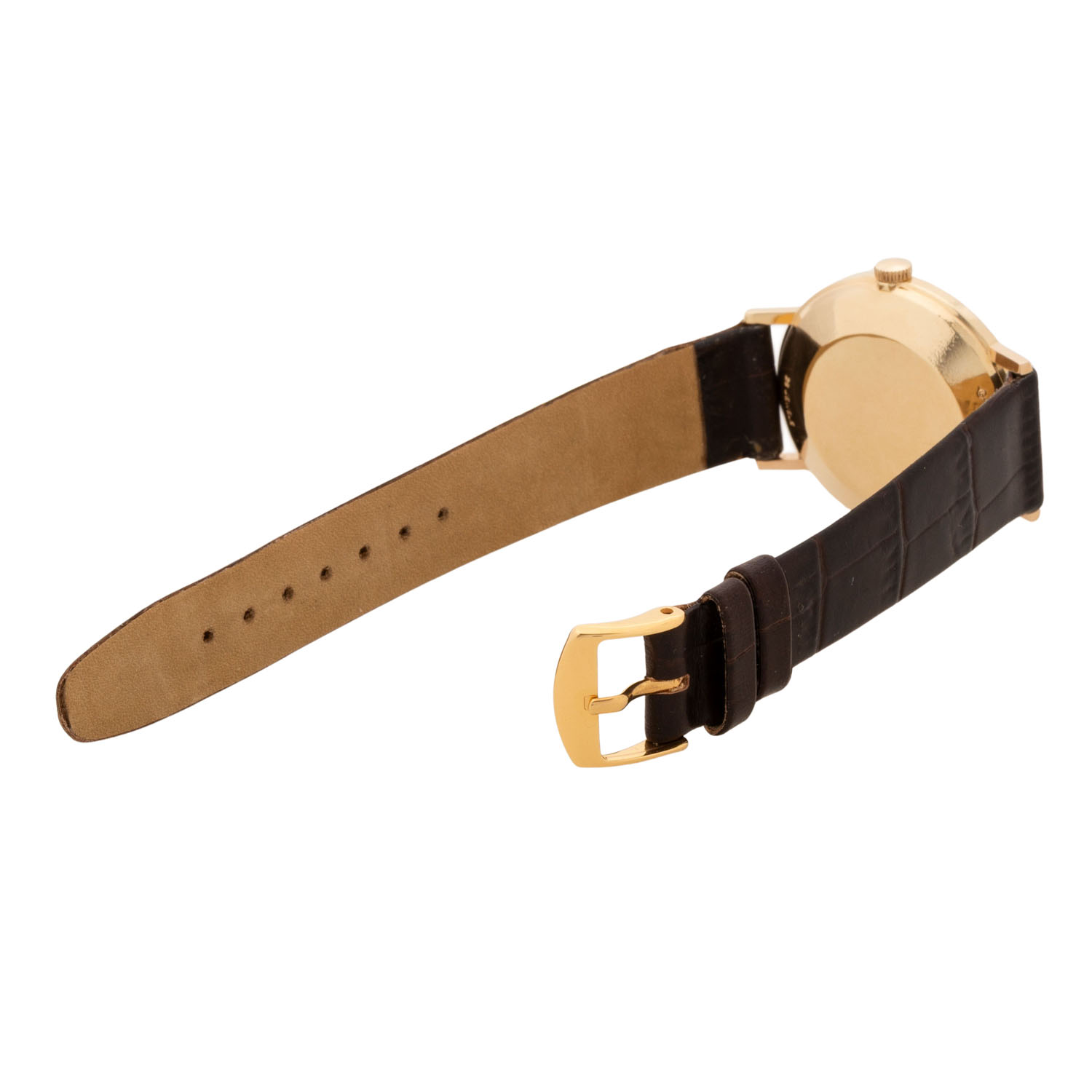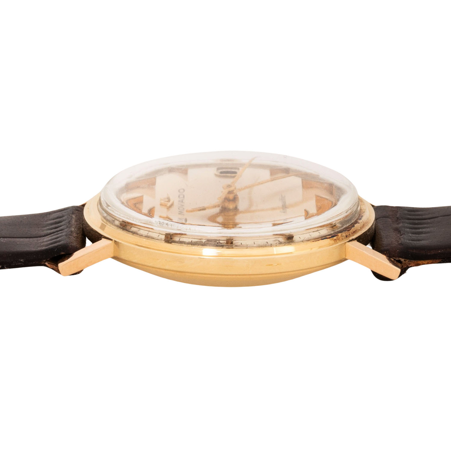 Gelbgold 14K. Automatik-Werk Kal. 538. Gangwerte (+5s/d. 226°). Champagnerfarbenes Zifferblatt mit leichter Patina, Pfeilindizes und Datumsanzeige. Neues Lederband mit vergoldeter Dornschließe. Gebrauchter Zustand mit sichtbaren Tragespuren. Durchmesser ca. 33 mm (gemessen ohne Krone).