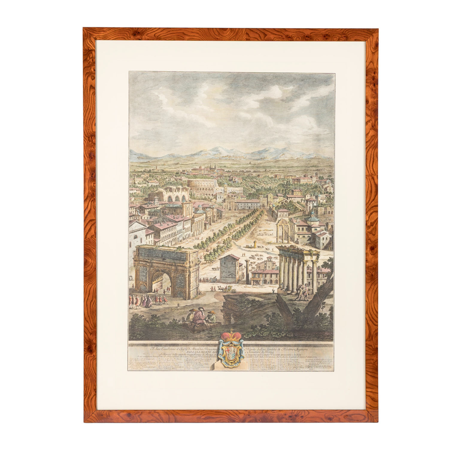 Le Rovine delle antiche magnificenze di Roma che si veggono nel Campo Vaccino presenta e dedica Il suo umilissimo divotissimo, ed obbligatissimo Servitore Giuseppe Vasi Conte Palatino, e Cavaliere dell’ Aula Lateranense, dal medesimo designate ed incise l’anno 1765, HxB: ca. 100/70 cm. Rahmen, HxB: 120/90 cm.