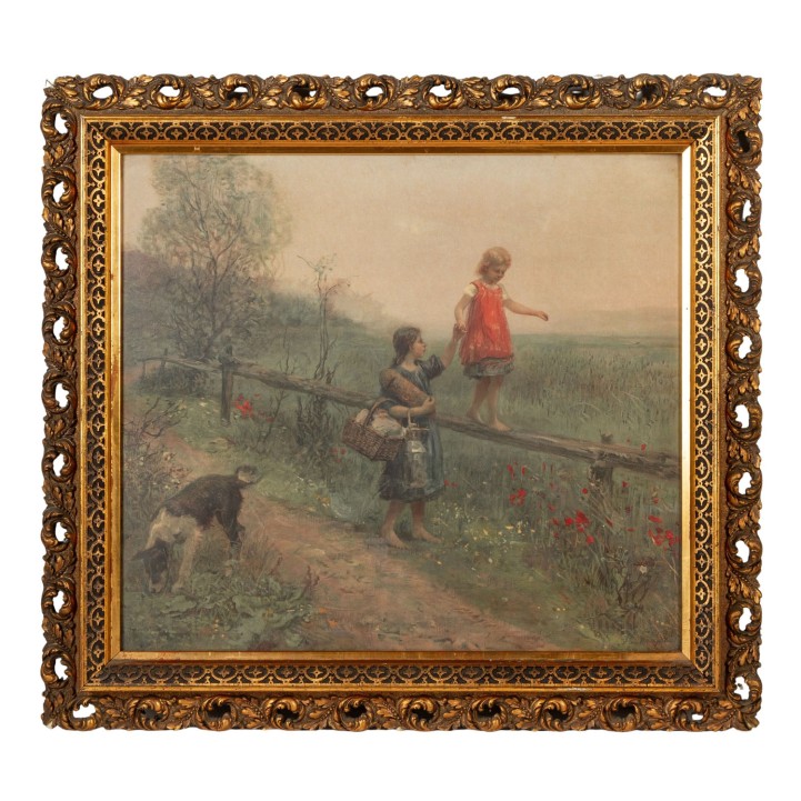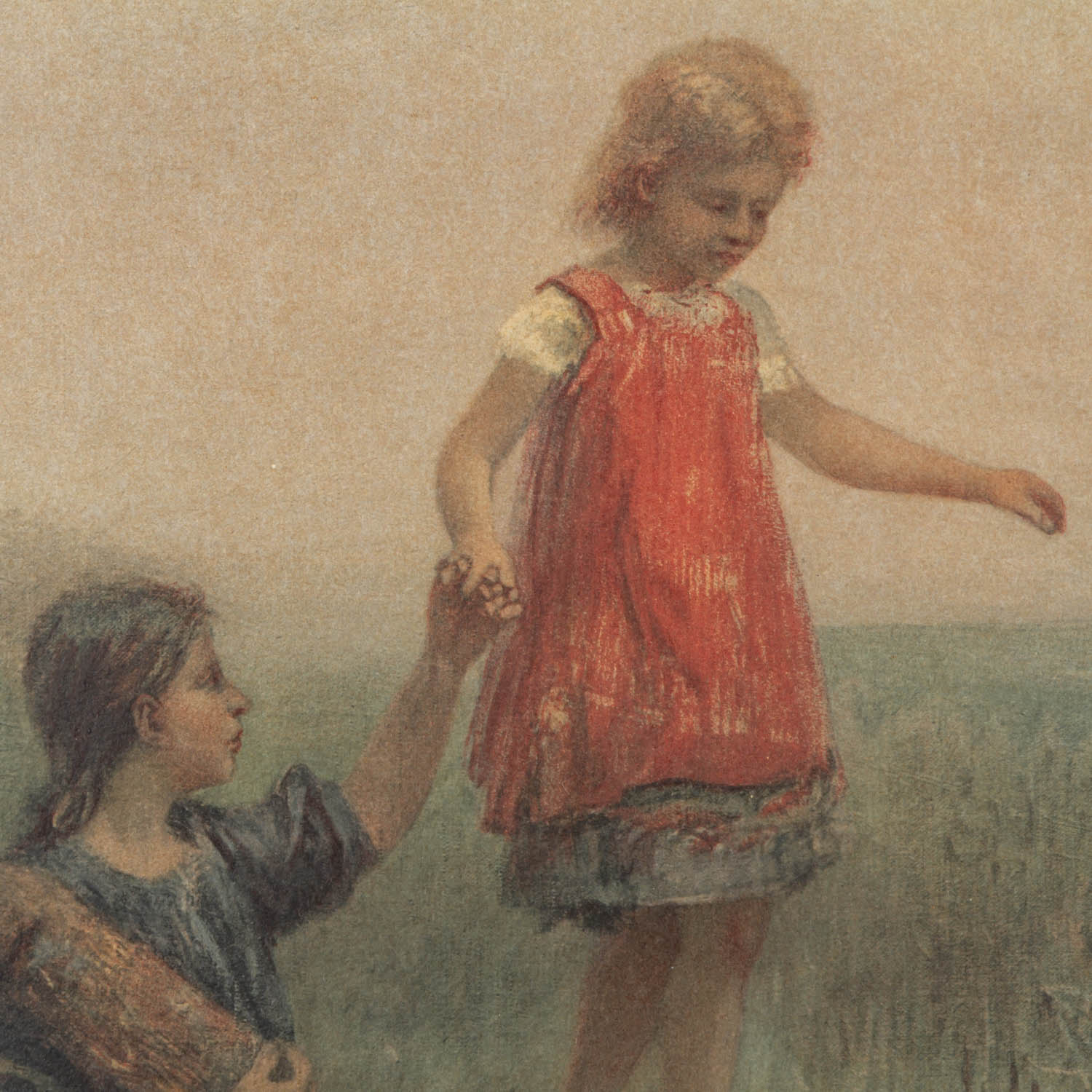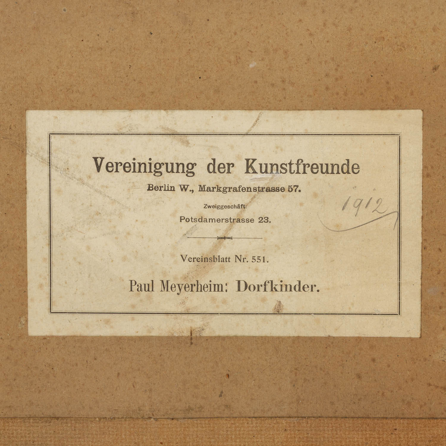 Farblithografie, in der Platte sig., Verso 'Vereinigung der Kunstfreunde, Berlin W., Markgrafonstrasse 57., Potsdamerstrasse 23. 1912, Vereinsblatt Nr. 551., Paul Meyerheim: Dorfkinder' HxB: 56/63 cm. Rahmen, HxB: 72/78 cm.