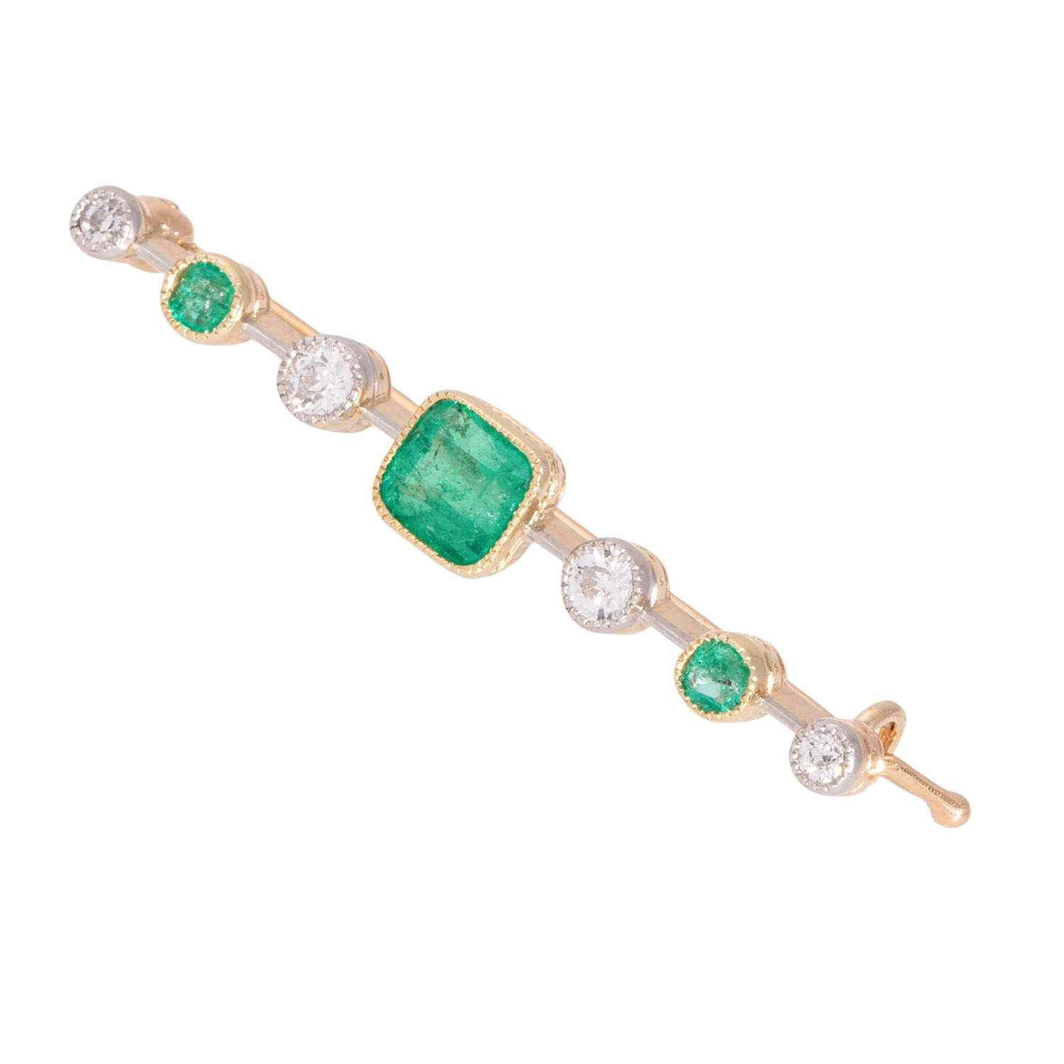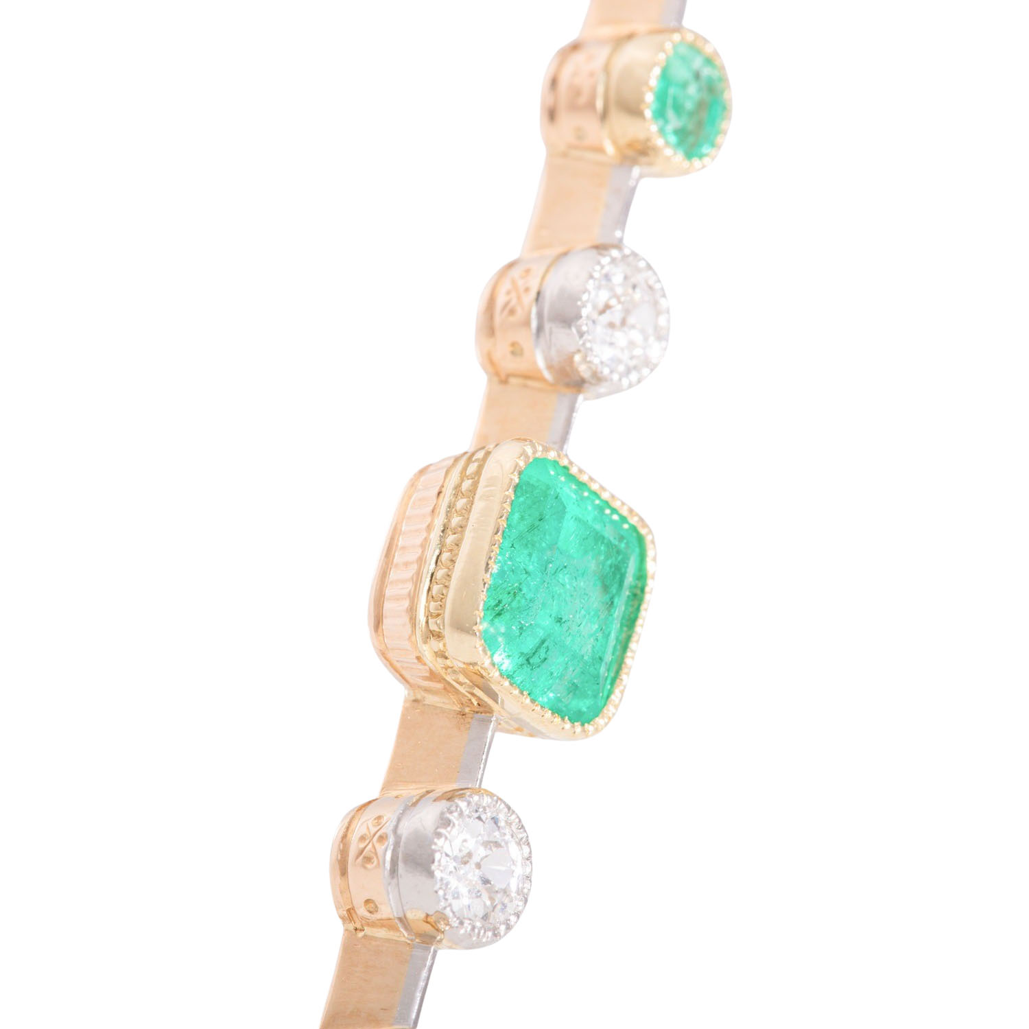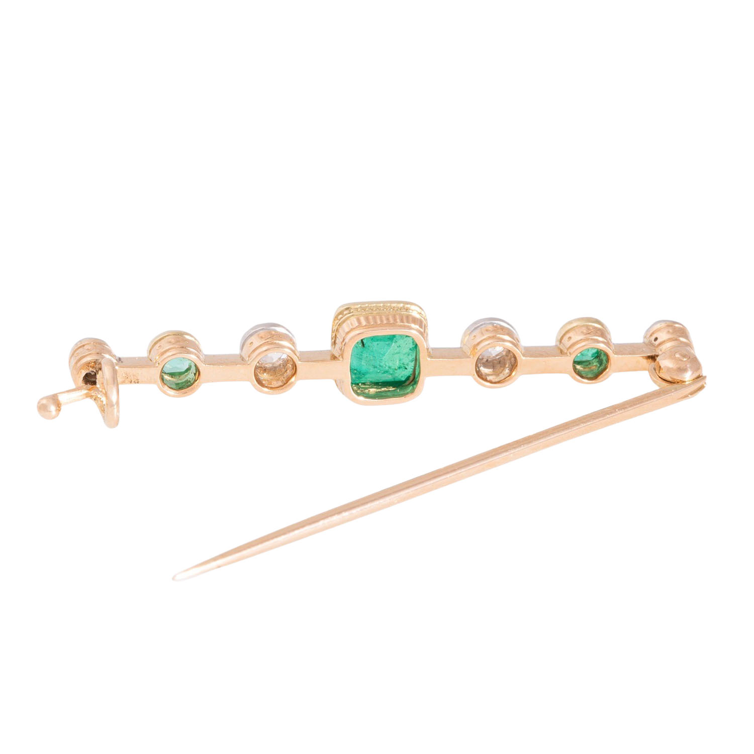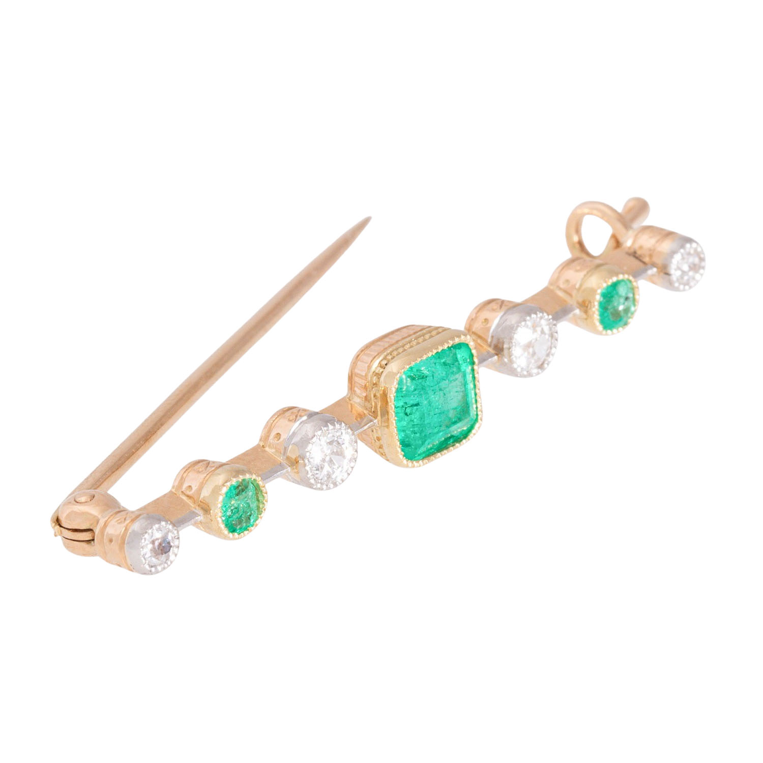 zus. ca. 0,26 ct, ca. FW-WEISS (G-H)/SI, mittig Smaragd im Antikschliff ca. 0,8 ct, 2 kleine runde Smaragde zus. ca. 0,1 ct, bestoßen, GG 14K und Platin, 3,6 g, L: 4 cm, um 1900, leichte Tragespuren, schöne Handarbeit mit Ziergravuren.