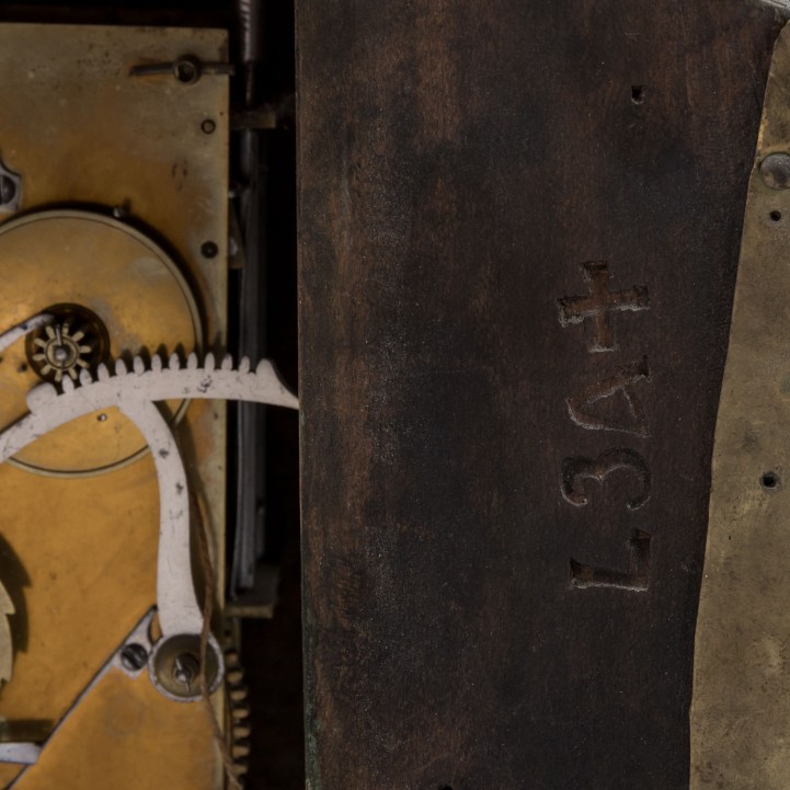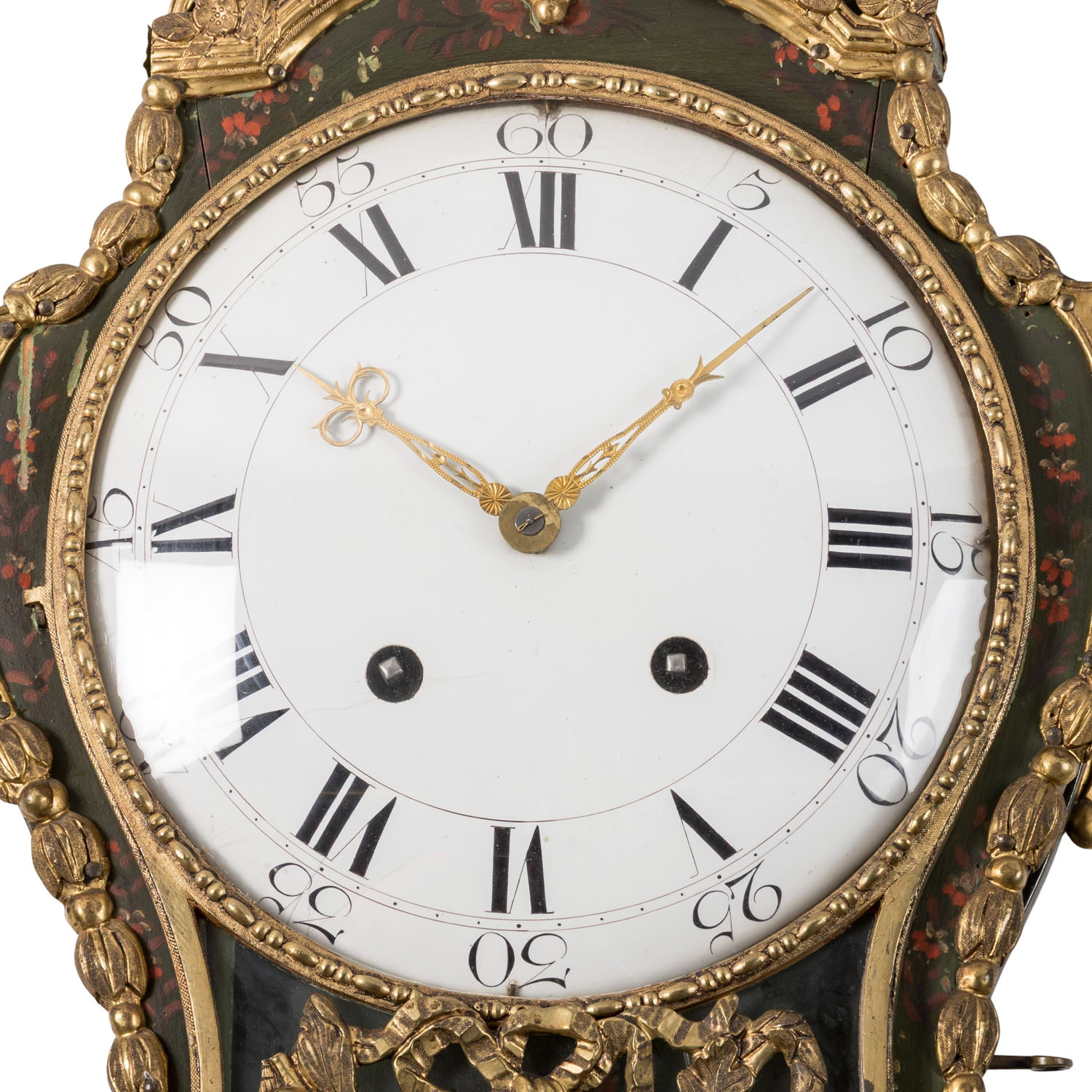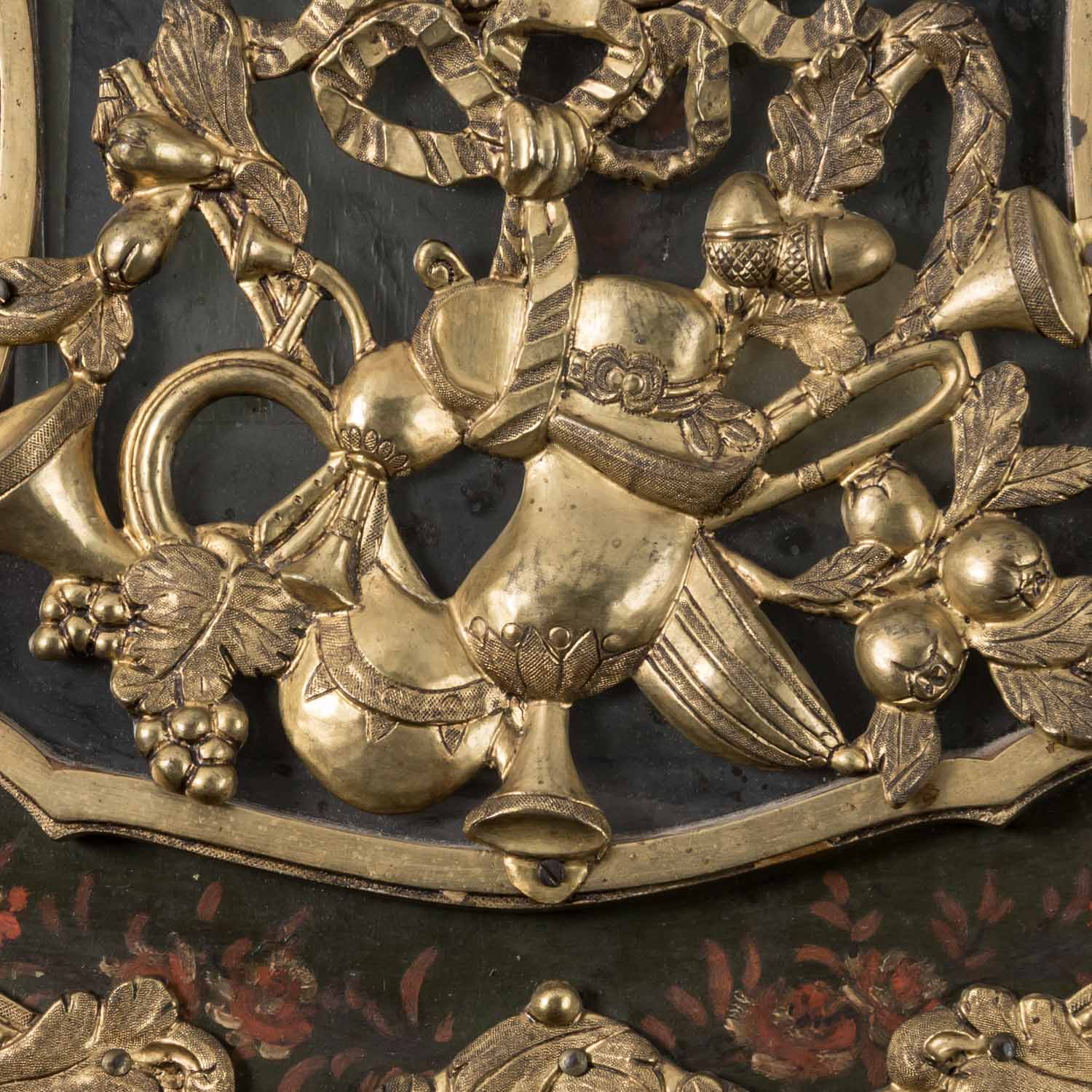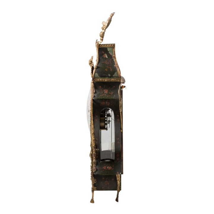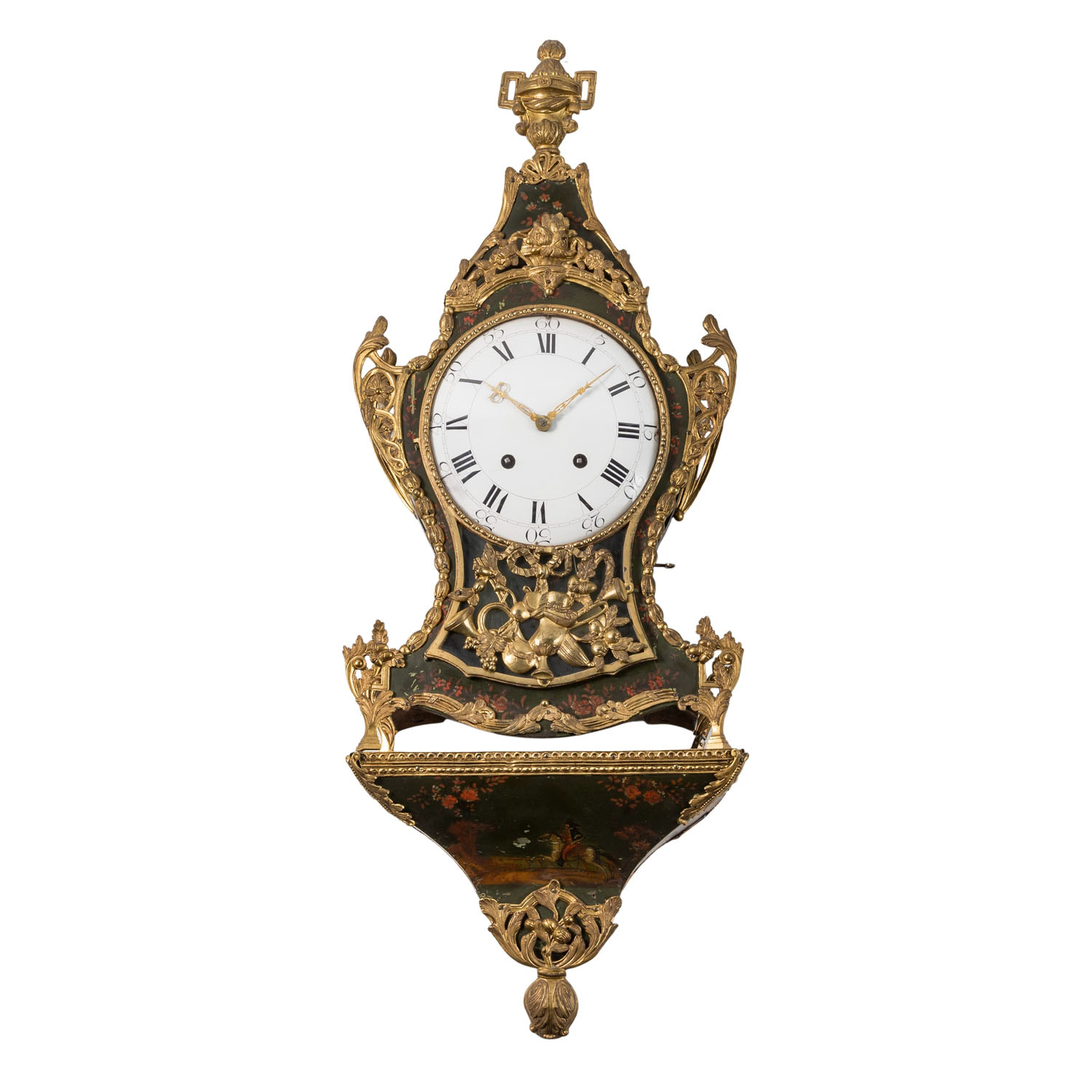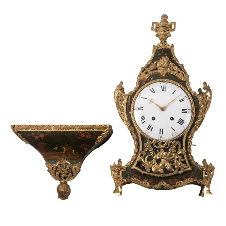 2. Hälfte 18. Jh., zweiteiliges Neuenburger Holzgehäuse mit dunkelgrünen Fond und floraler Bemalung, üppig dekoriert mit geprägten Messingblechapplikationen von Blumengirlanden, patriotischem Eichenlaub und allegorischen Darstellungen, Werk mit Schlag zur Viertelstunde auf zwei obenliegende Glocken, stehend auf passig dekorierter Wandkonsole. HxBxT Uhr: 77/40/14 cm. Alters- und Gebrauchsspuren, im Kurztest funktionstüchtig, Werk part. erg., nicht entschlüsselte Prägemarke im Holz: „L34(Kreuzzeichen)“.