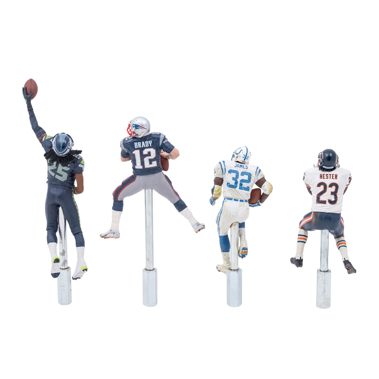 mit Figuren der Spieler Devin Hester, Richard Sherman, Tom Brady und Edgerrin James. Hersteller McFarlane, wohl mit selbst angebrachten Vorrichtungen zum aufschrauben. H: je ca. 16-23 cm (mit Gewinde ca. 19-26cm). Tlw. stark beschädigt, mit Klebespuren, Verfärbungen und Alters- und Lagerspuren.