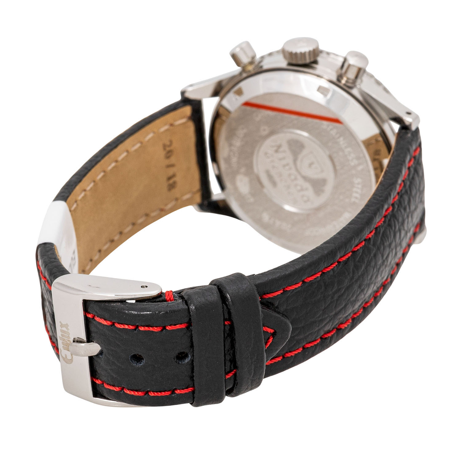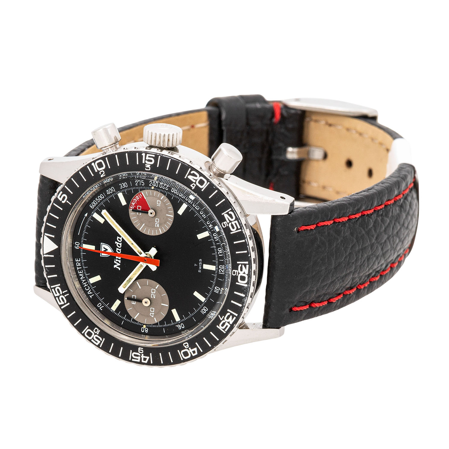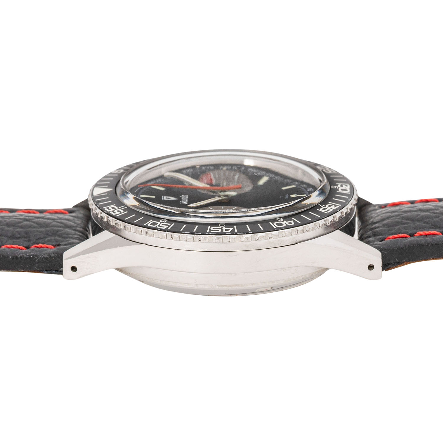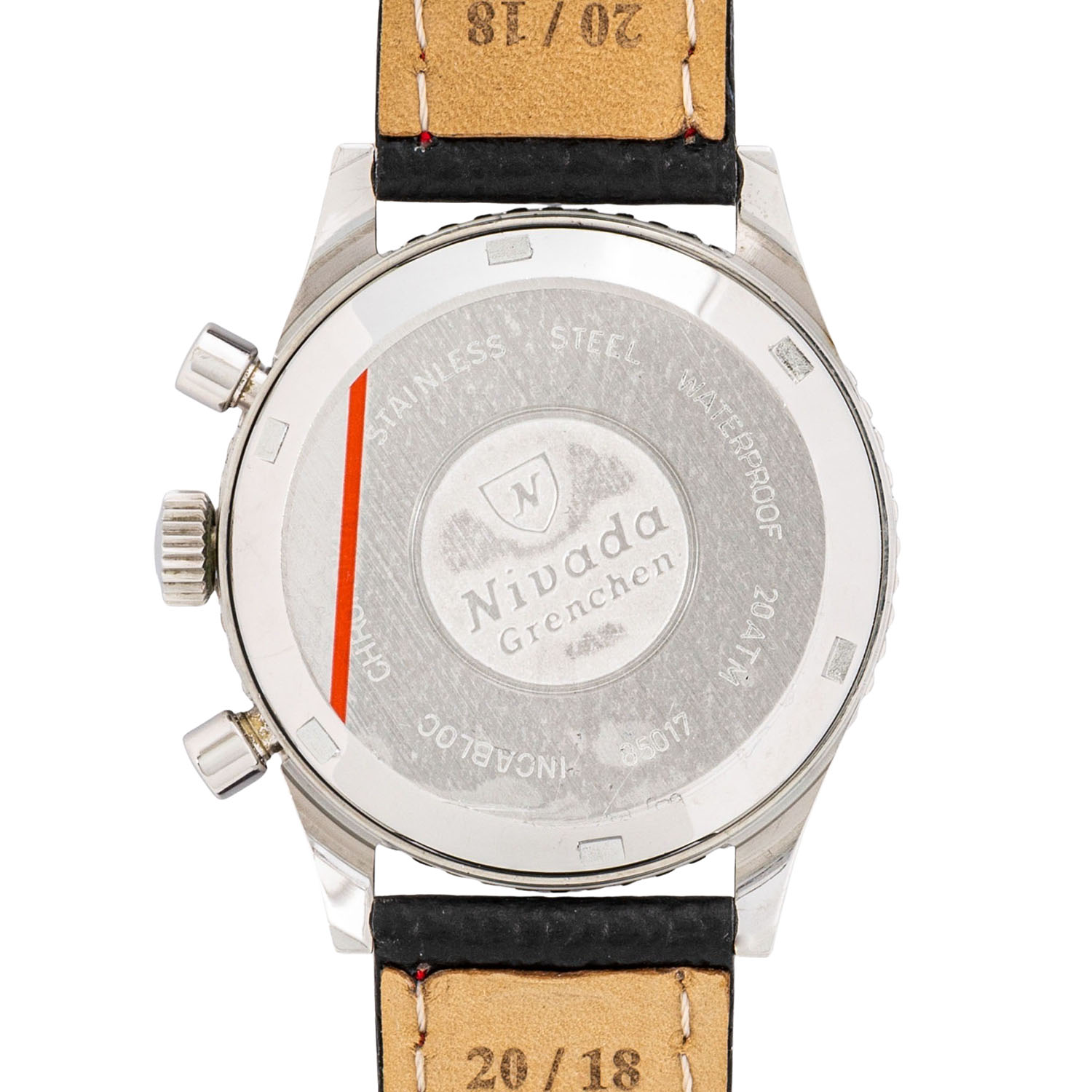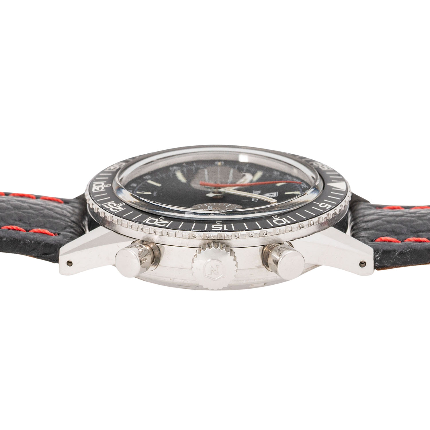 Edelstahl. Handaufzugswerk Kal. Valjoux 23 mit sehr guten Gangwerten (+1s/d. 264°). Schwarzes Tritium Zifferblatt mit 2 Totalisatoren, Tachymeter Skala und Datumsanzeige. Hierbei handelt es sich um die seltene 'No Name' Variante, da es keinen zusätzlichen Text oder Branding bei 6 Uhr gibt, wie es bei den herkömmliche Versionen der Fall ist. Neues Lederband mit Dornschließe. Guter Zustand mit Tragespuren. Am Minutenzeiger ist ein kleines Stück Leuchtmasse ausgebrochen. Gehäusedeckel mit Schutzfolie. Durchmesser ca. 38 mm (gemessen ohne Krone).
