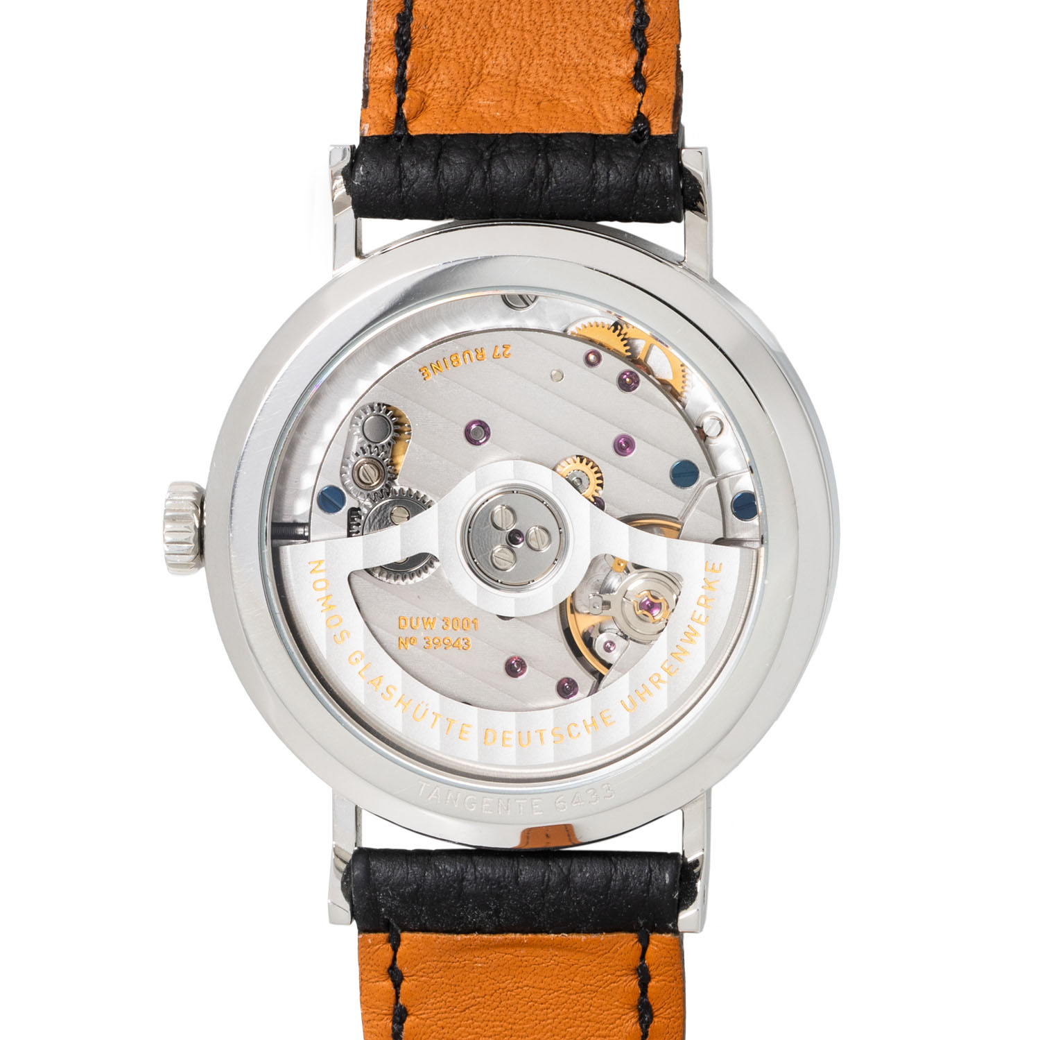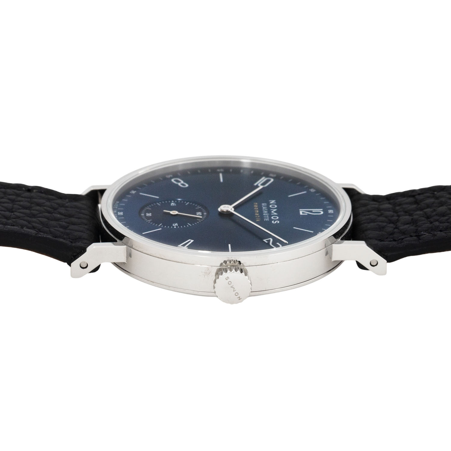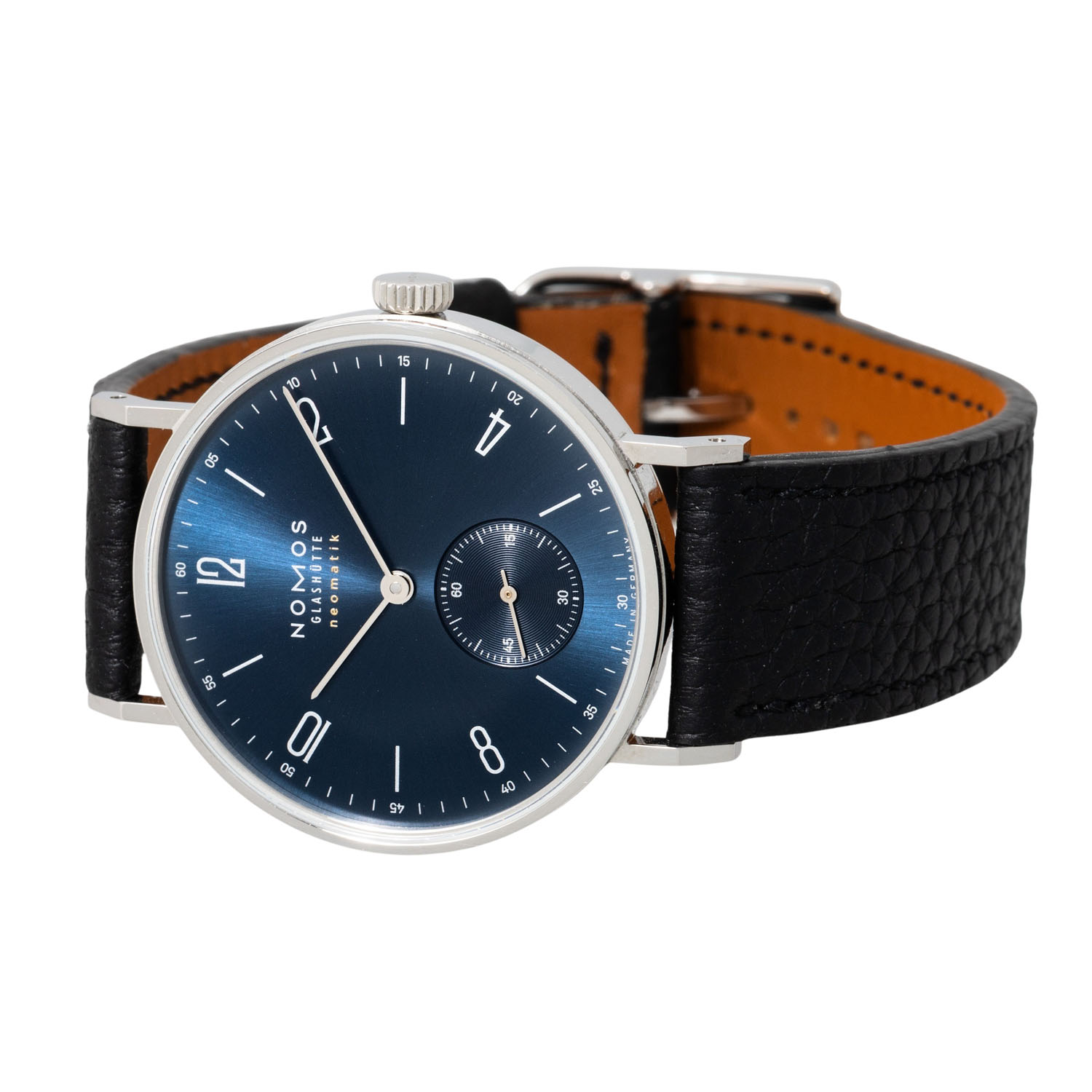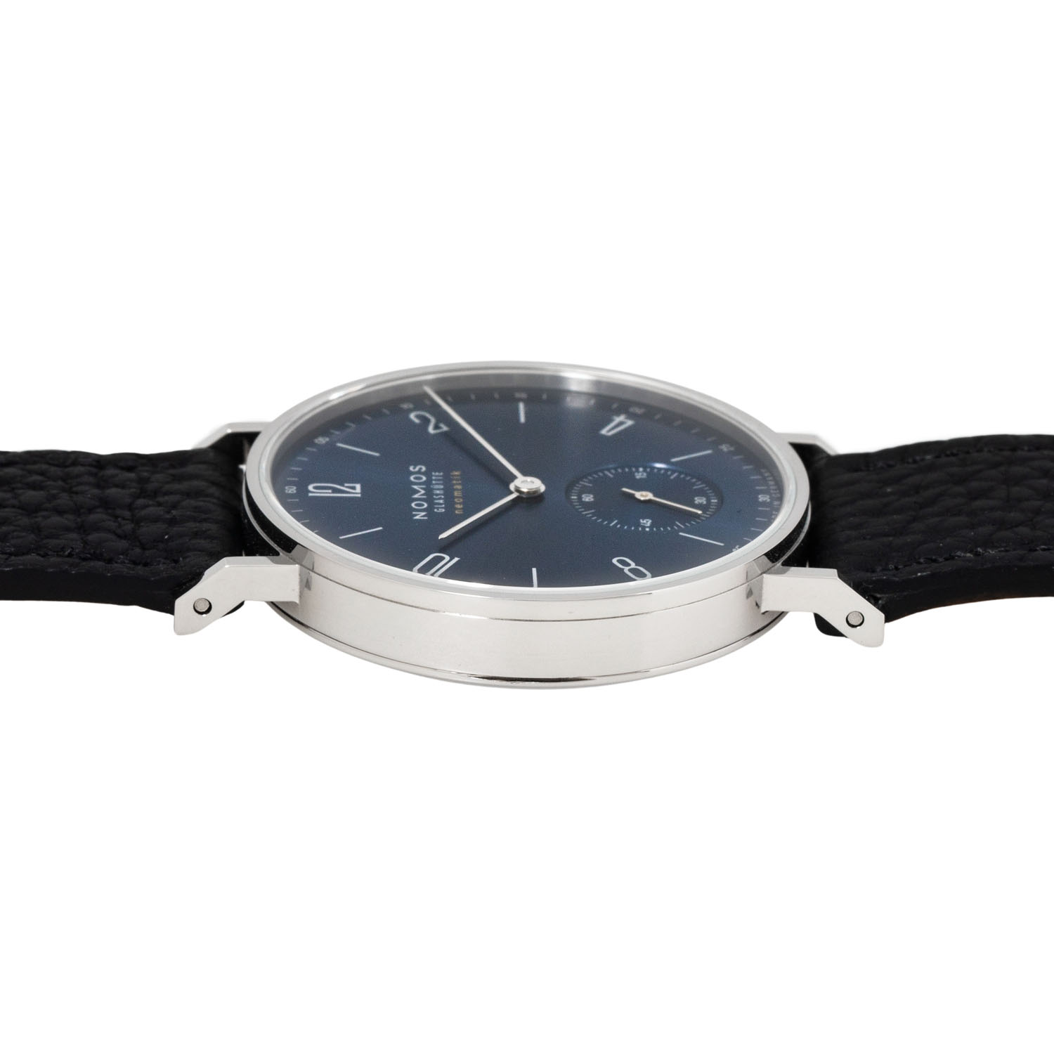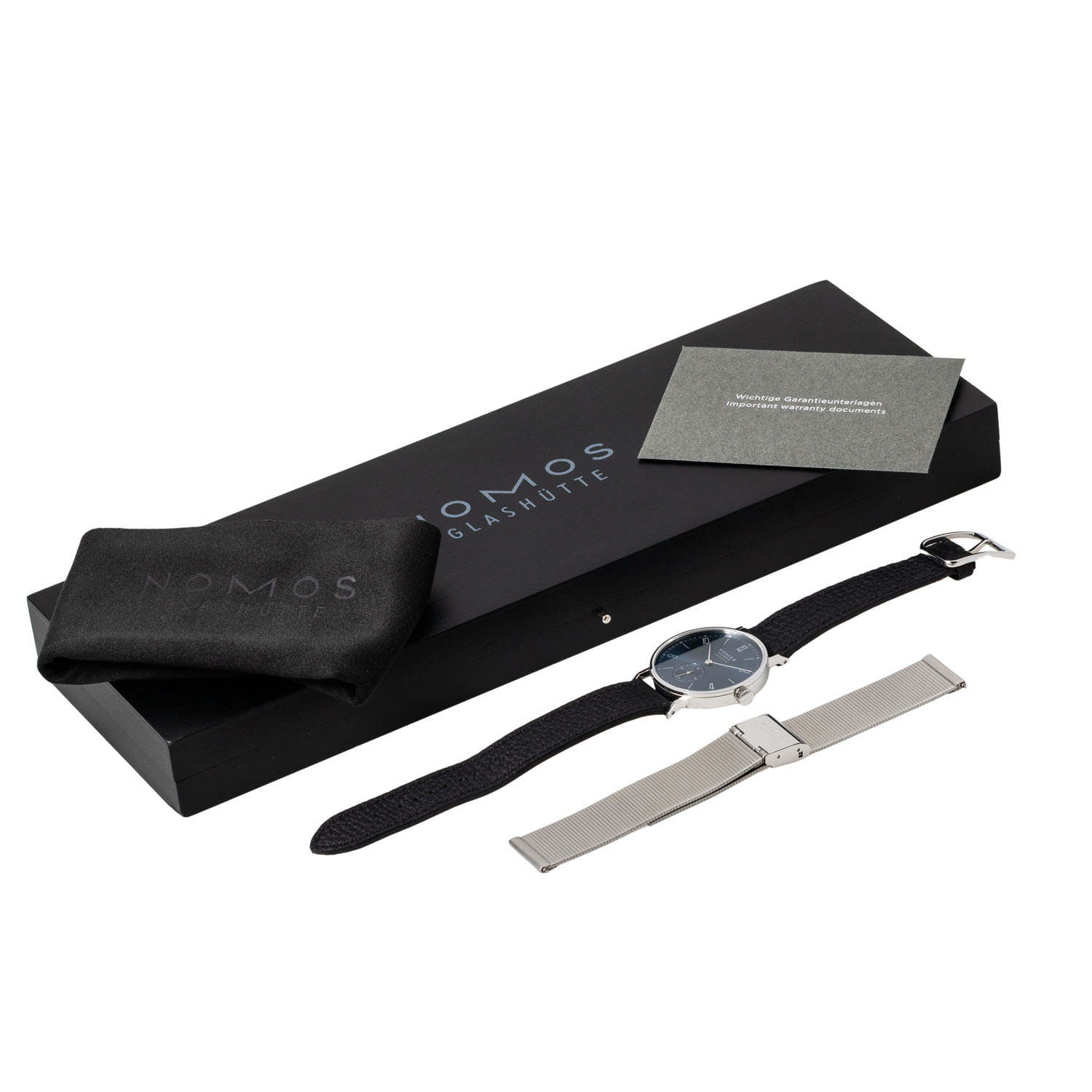 Edelstahl. Glasboden. Gehäusenummer 6433. Automatik-Werk Kal. DUW3001 mit sehr guten Gangwerten (+2 s/d. 279° Amplitude). Blaues Zifferblatt mit arabischen Zifern und kleiner Sekunde. Schwarzes Lederband mit der Original Nomos Dornschließe. Sehr guter Zustand mit minimalen Tragespuren. Original Box, zusätzliches Nomos Metallband mit Faltschließe und Rechnung sowie Garantiekarte anbei. Gekauft im November 2023 in Deutschland. Durchmesser ca. 35 mm (gemessen ohne Krone).