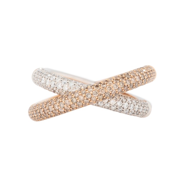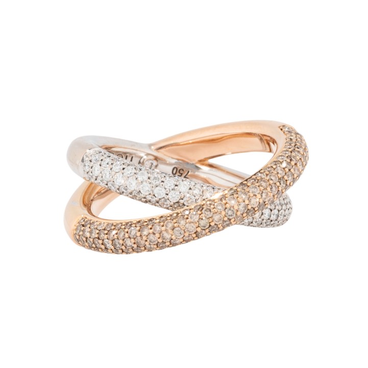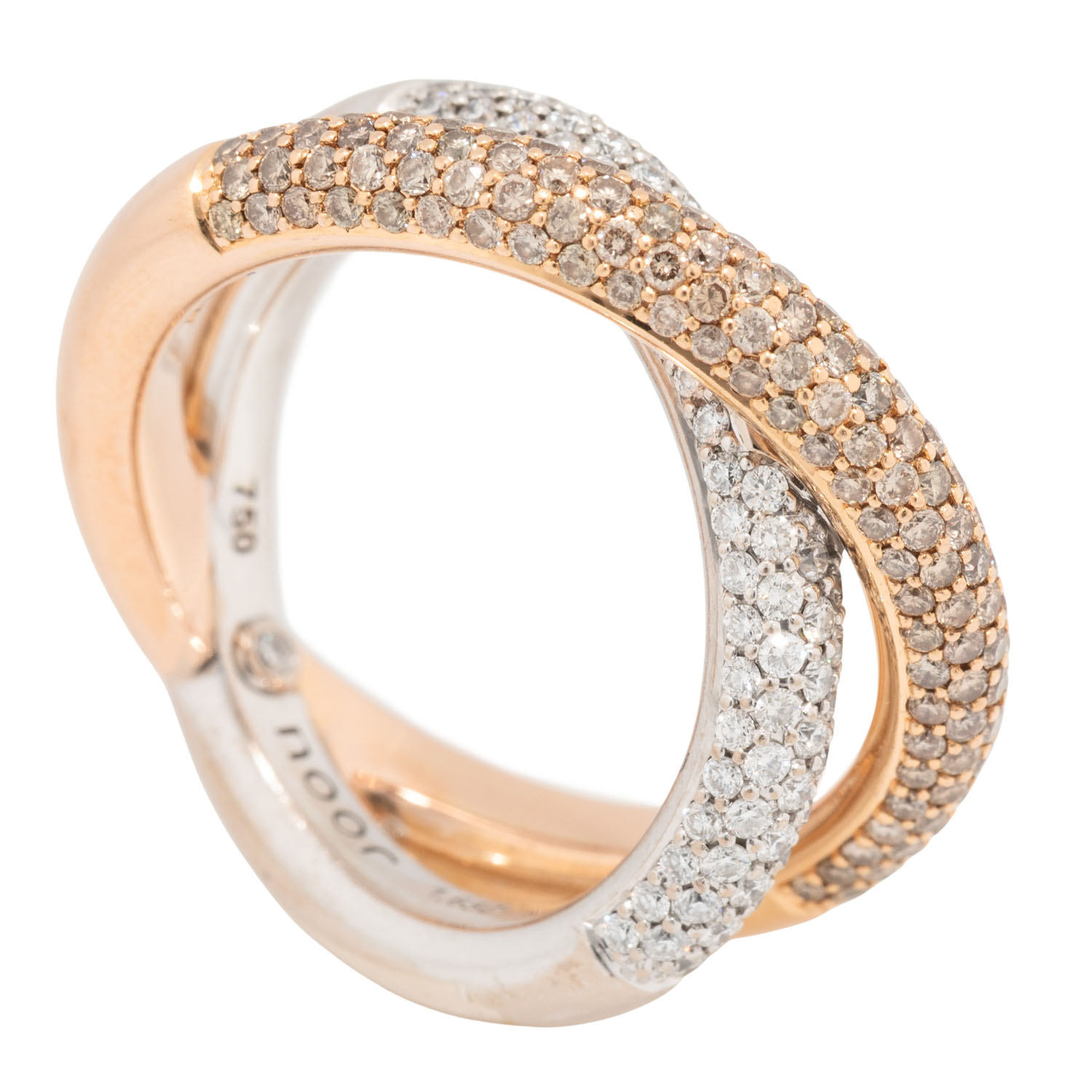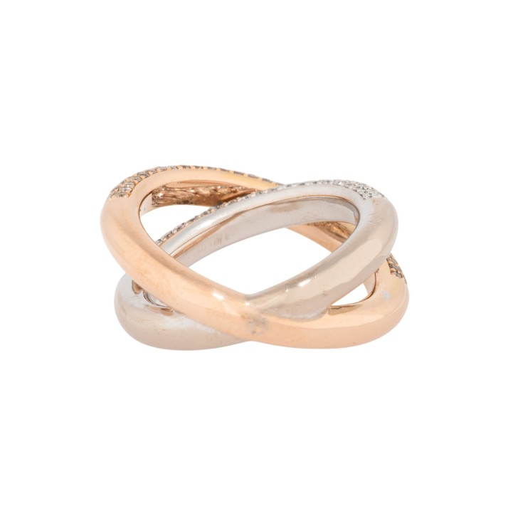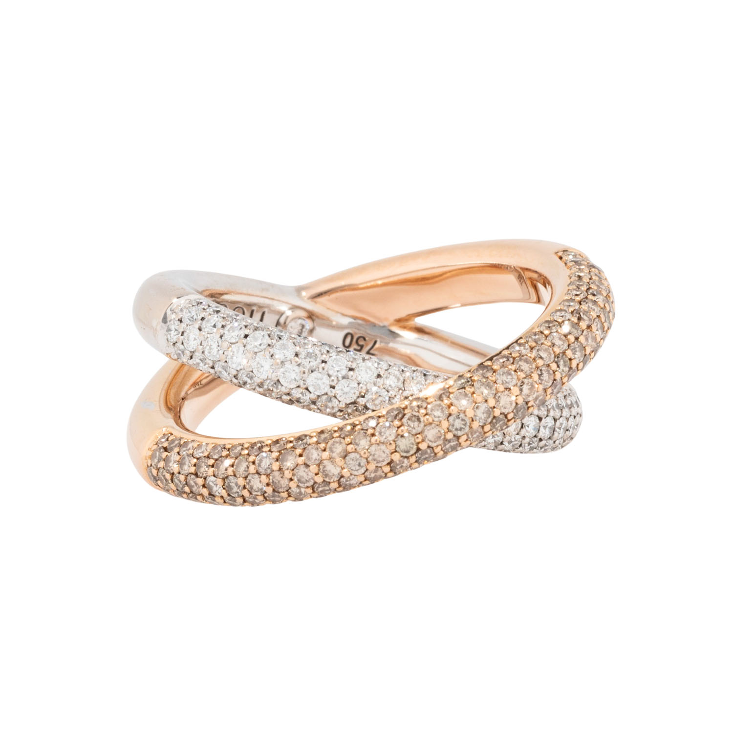 graviert, (0,66 ct, FW (G)/VS und 0,99 ct, FANCY LIGHT BROWN, geschwungene Form, innen mit einem Brillant besetzt, RSG/WG 18 K, 11,3 g, RW: 53, 21. Jh., guter Zustand, Juwelierzertifikat anbei. 'NOOR'.