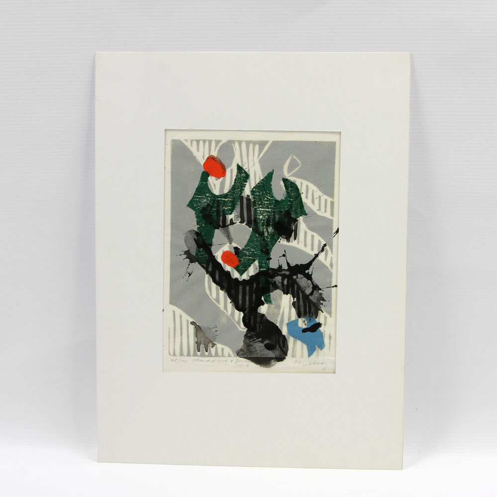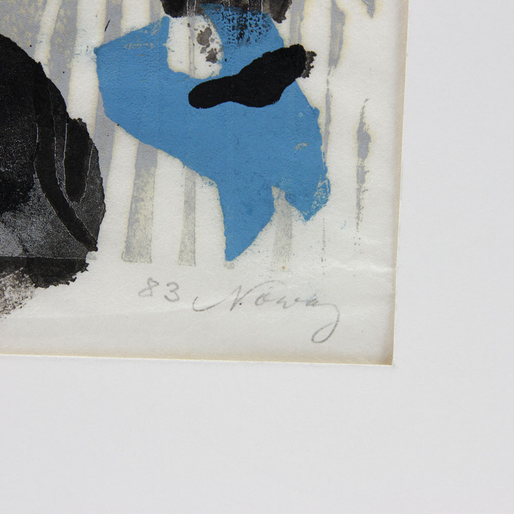 NOWAG, HEINZ (1907-1984): abstrakte Komposition, 1983, Handruck und Gouache auf Papier (?), 23x17 cm, sign. und dat. u.r., bez. und num. u.l., unter Passepartout gerahmt, Altersspuren.