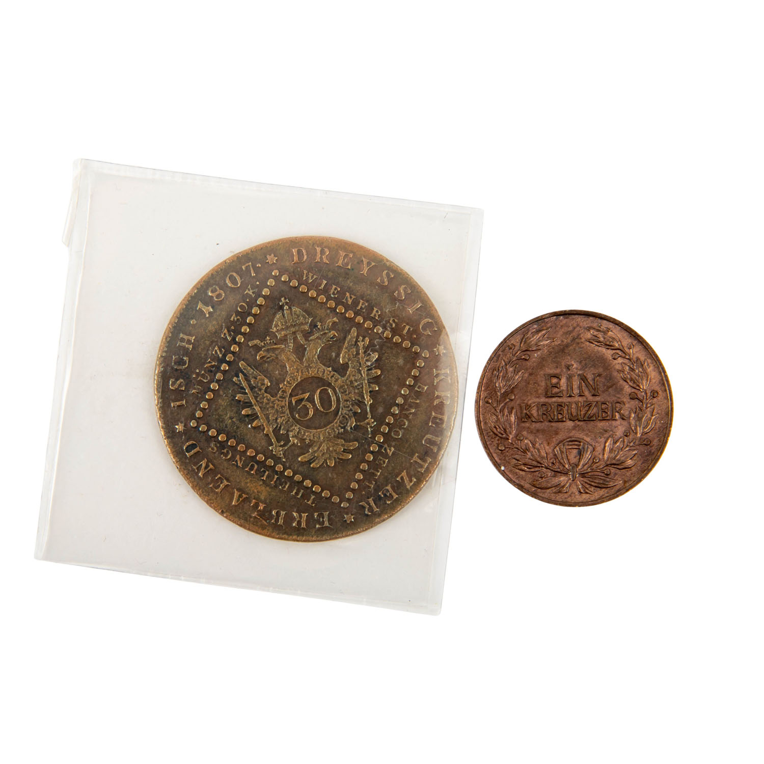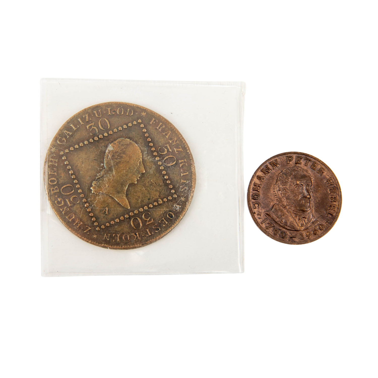 darunter: 1 x 30 Kreuzer Franz II. 1807; 1 x 1 Kreuzer Johann-Peter-Hebel 1960; 1 x Bregenz - Nachprägung des Stadtsiegels Bregenz von 1533 als Ehrengabe für zivile Dienste, in Bronze, 231.3 g rau, im Originaletui. Erhaltungen verschieden, jedeoch zeitgemäß.