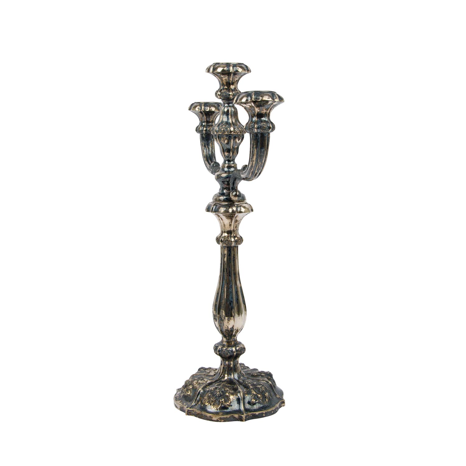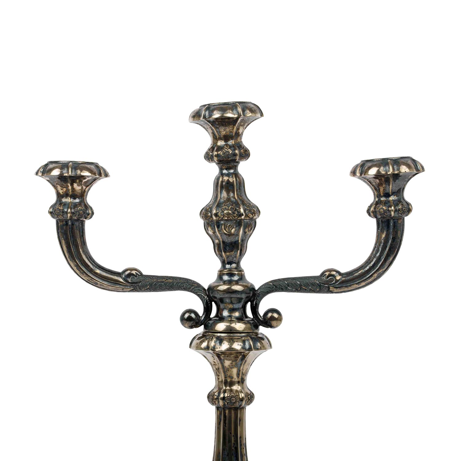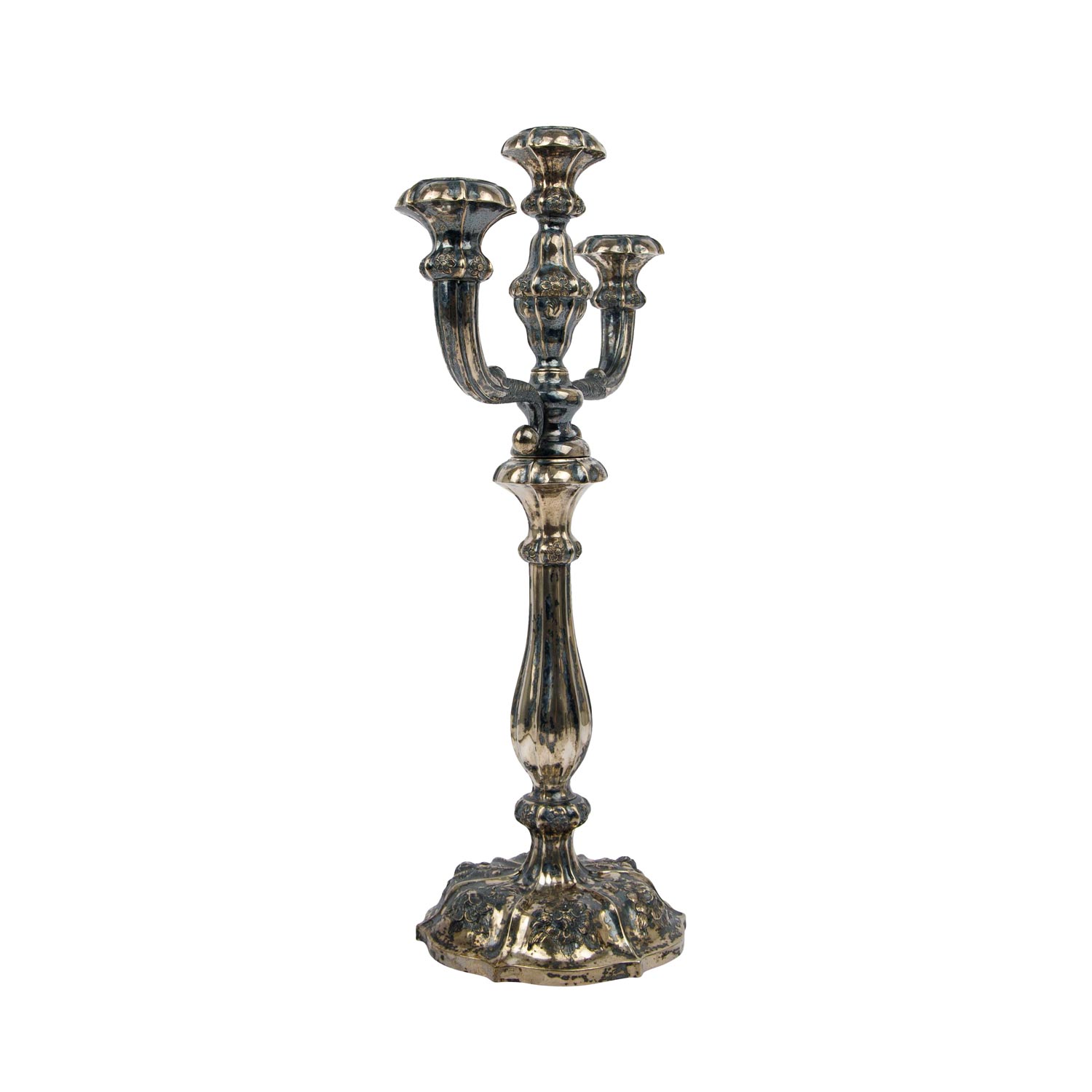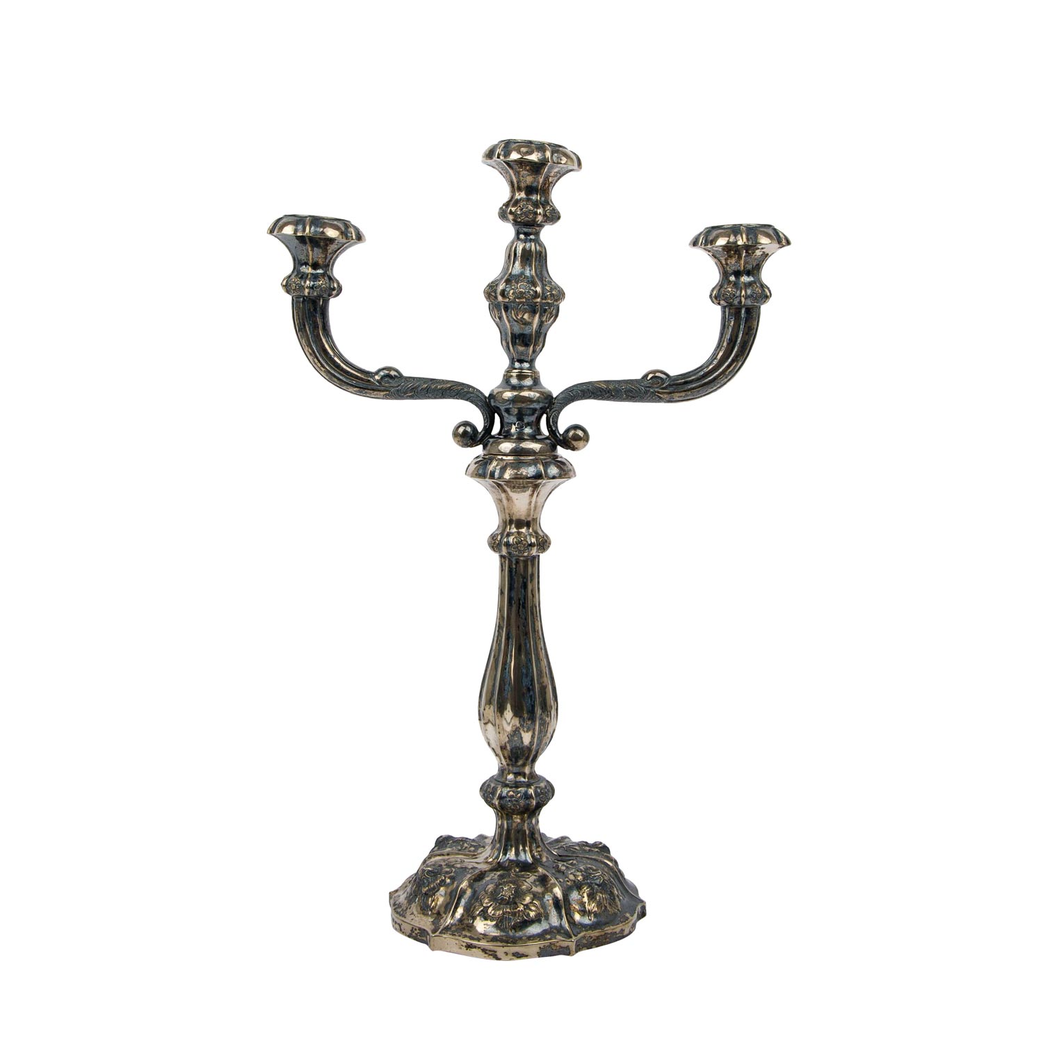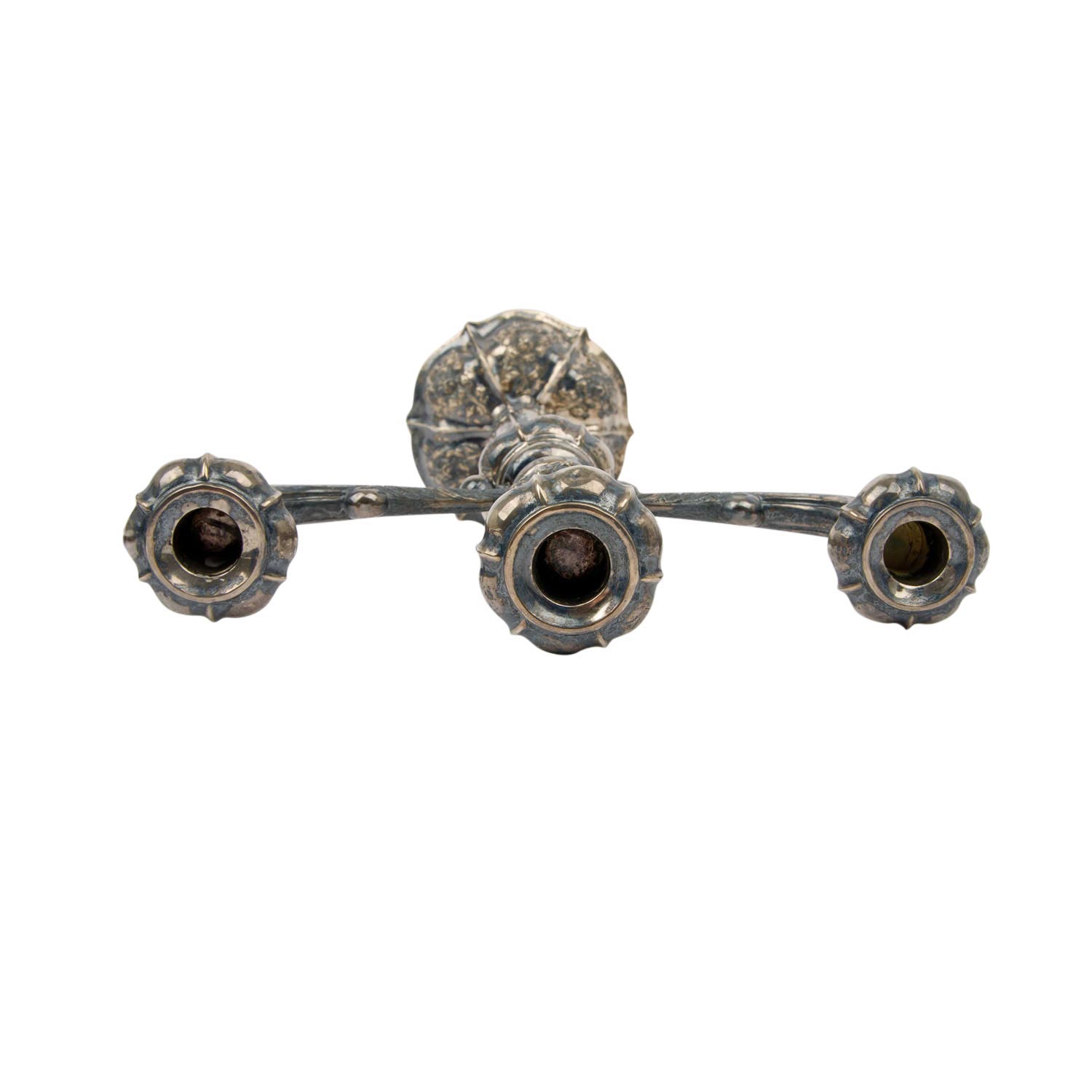 runder Stand, balusterförmiger Schaft, vegetabil gestaltete Leuchterarme, abnehmbar, somit als Kerzenhalter nutzbar, Bodenplatte, unedles Metall, H. ca. 45 cm, Marken: 13 Lot (812), Unebener Stand und besch.. Alters- und Gebrauchsspuren.