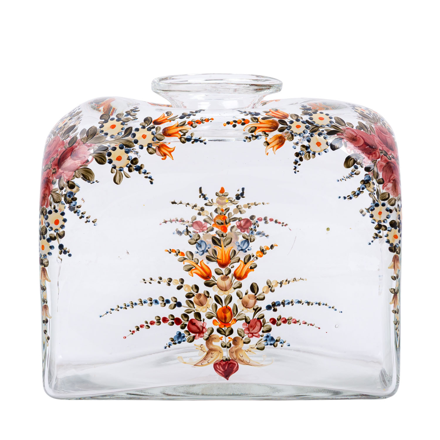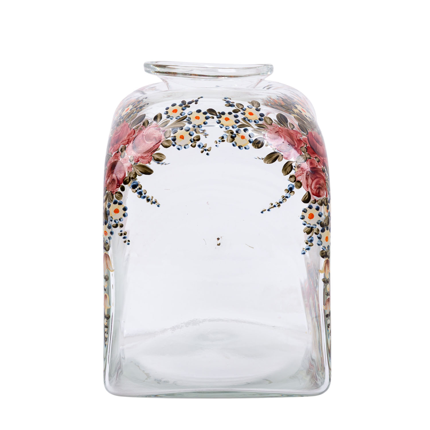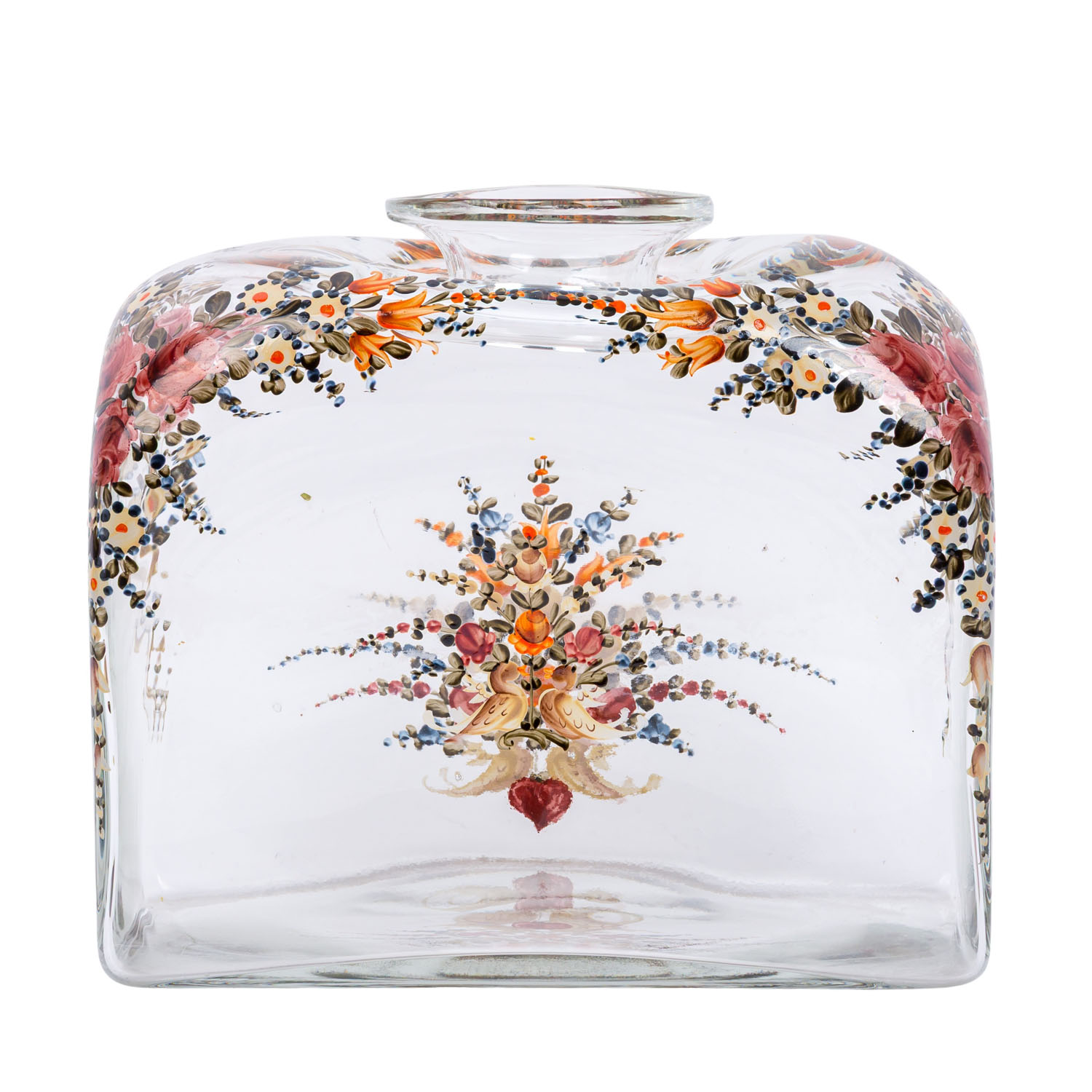 Rechteckige Vase aus farblosem Glas mit eingezogenen Seiten und einer polychromen Emaillemalerei von Blumen und Turteltauben, ca. 23 x 26 x 16 cm. Die Öffnung ist minimal bestoßen, Alters- und Gebrauchsspuren.