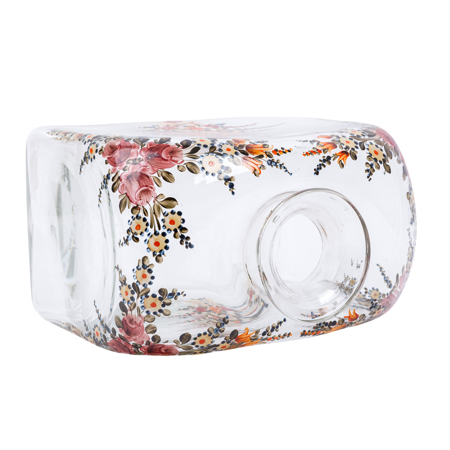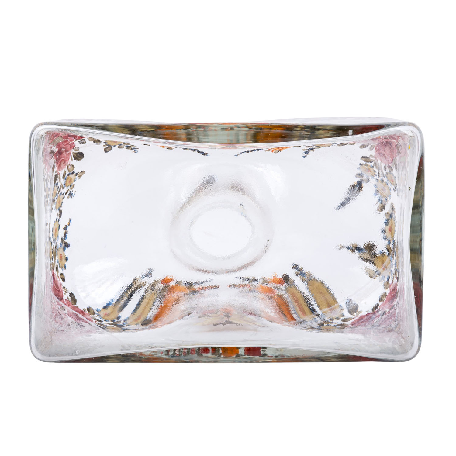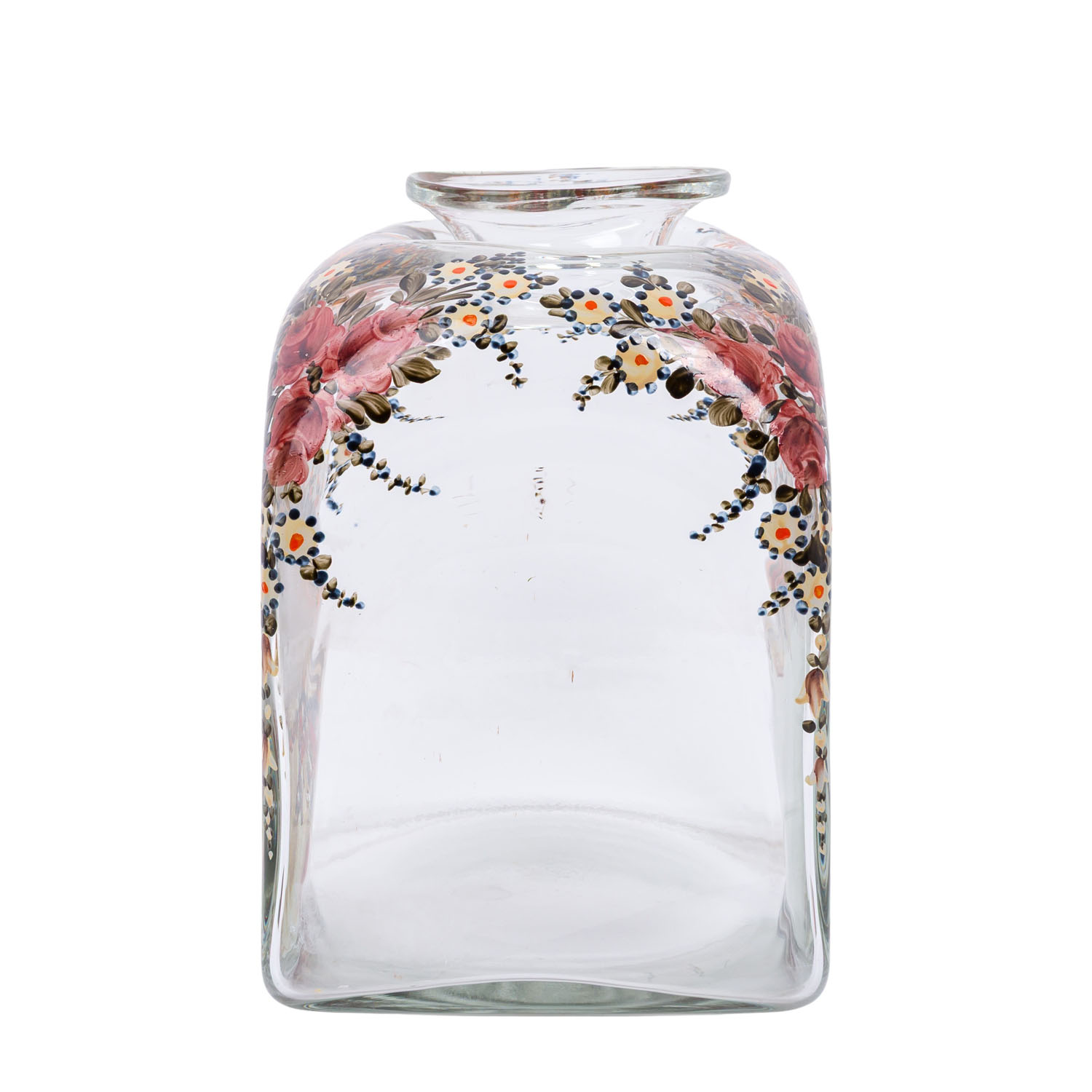Rechteckige Vase aus farblosem Glas mit eingezogenen Seiten und einer polychromen Emaillemalerei von Blumen und Turteltauben, ca. 23 x 26 x 16 cm. Die Öffnung ist minimal bestoßen, Alters- und Gebrauchsspuren.
