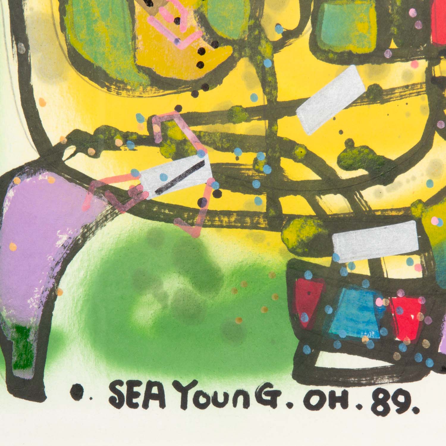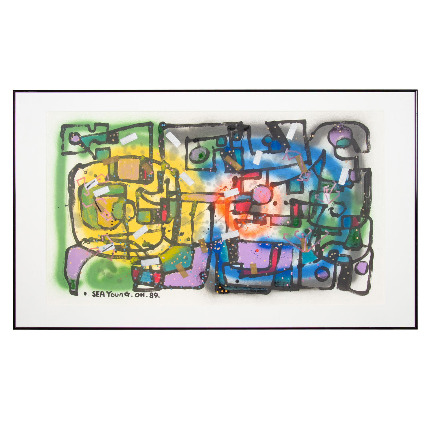 Mischtechnik, u. li. bezeichnet und datiert 'SEA Young.OH.89.', HxB: Passepartout-Ausschnitt ca. 48,5x85 cm (60,5x102 cm mit Rahmen). Altersspuren, leicht gebräunt. Im Passepartout hinter Glas gerahmt (Alters- und Beriebspuren).