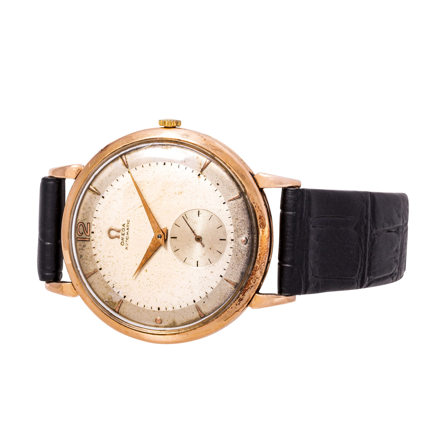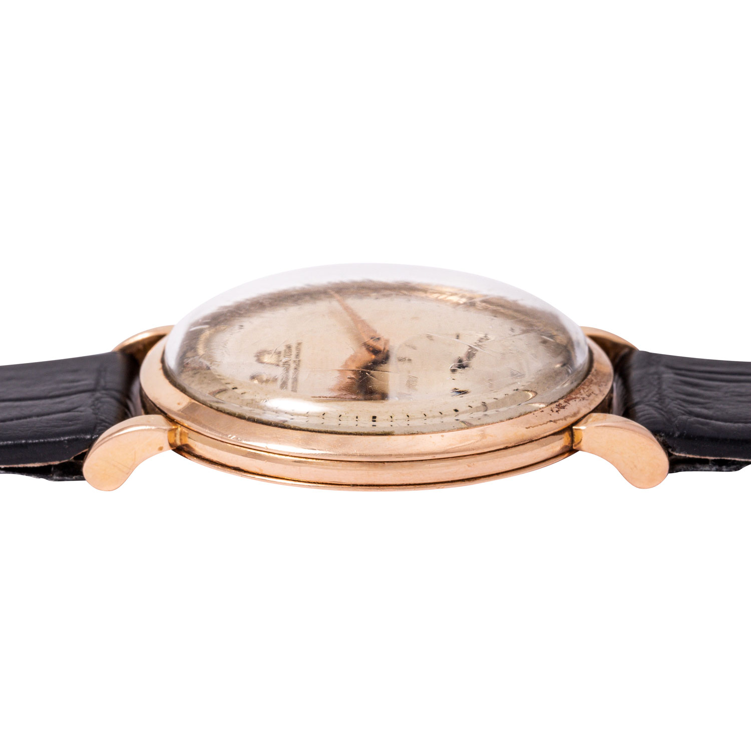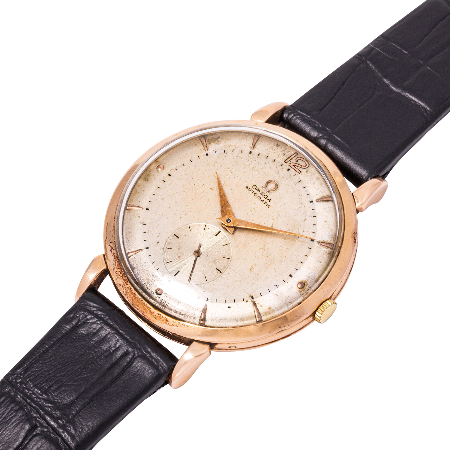 OMEGA Classic Vintage Ref. 2482 Men´s Wristwatch approx. 1947. 18K rose gold. New leather strap with pin buckle. Hammer automatic movement cal. 332 in working condition. Dial with applied indices and small seconds. Used, age-appropriate condition. Diameter approx. 37 mm without crown. Fits up to approx. 19.5 cm wristsize.
