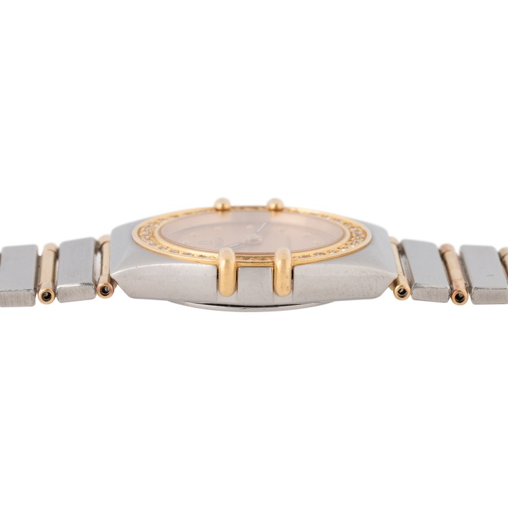 Edelstahl / 18K Gelbgold, Lünette mit Factory Diamantbesatz. Quarzwerk Kal. 1455 mit neuer Batterie. Champagnerfarbenes Zifferblatt mit aufgesetzten Punktindizes und Eisenbahnminuterie. Edelstahl Gliederband mit 18K Gelbgold Zwischengliedern und Faltschließe. Gebrauchter Zustand mit Tragespuren. Bedienungsanleitung und Garantiezertifikat (nicht ausgefüllt) anbei. Durchmesser ca. 23,5 mm gemessen ohne Krone. Passend bis zu einem Handgelenksumfang von ca. 17,5 cm.