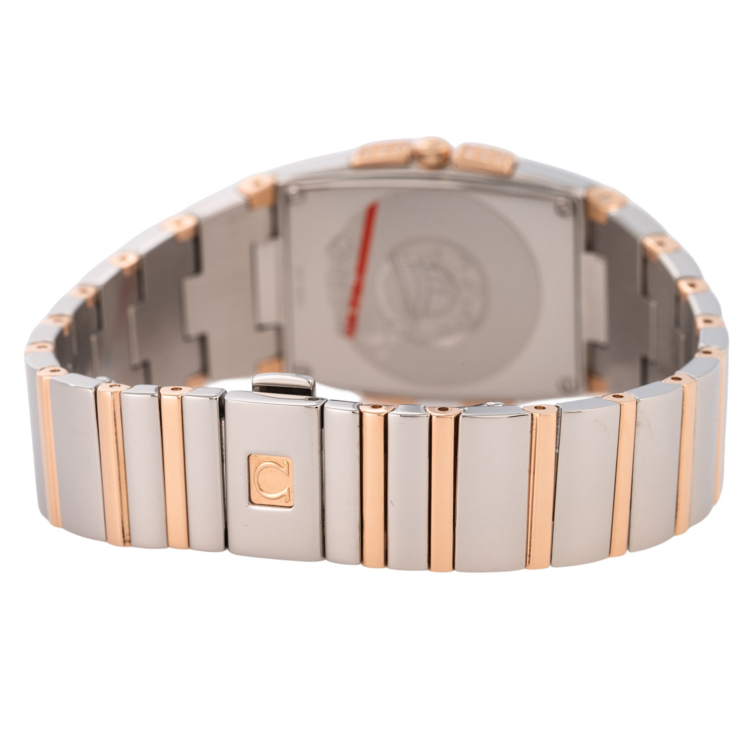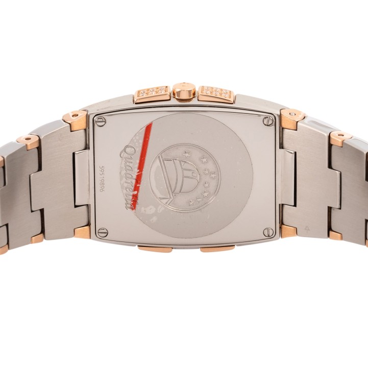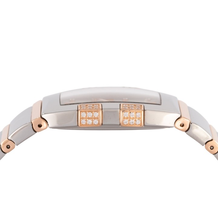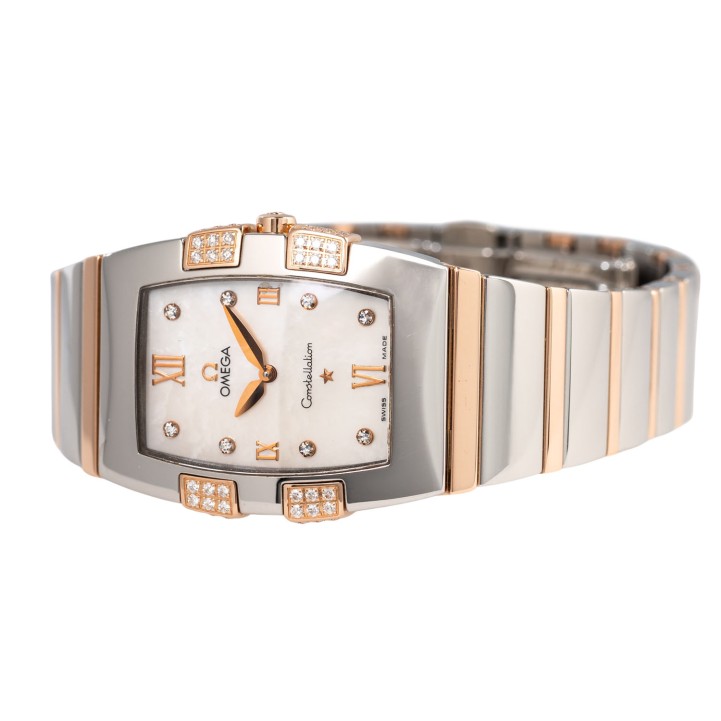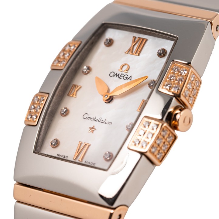 Edelstahl / Rosegold 18K. Seriennummer 59519896. Quarzwerk in funktionsfähigem Zustand. Die Uhr wurde im Juli 2025 aufgearbeitet und erhielt auch eine neue Batterie. Perlmutt Zifferblatt mit Diamanten Indizes und römischen Ziffern. Die Lünette ist ebenfalls mit Diamanten besetzt. Omega Armband aus Edelstahl / 18K Rosegold mit Faltschließe. Guter Zustand mit Tragespuren. Durchmesser ca. 26 mm (gemessen ohne Krone). Passend bis zu ca. 17,5 cm Handgelenkumfang.