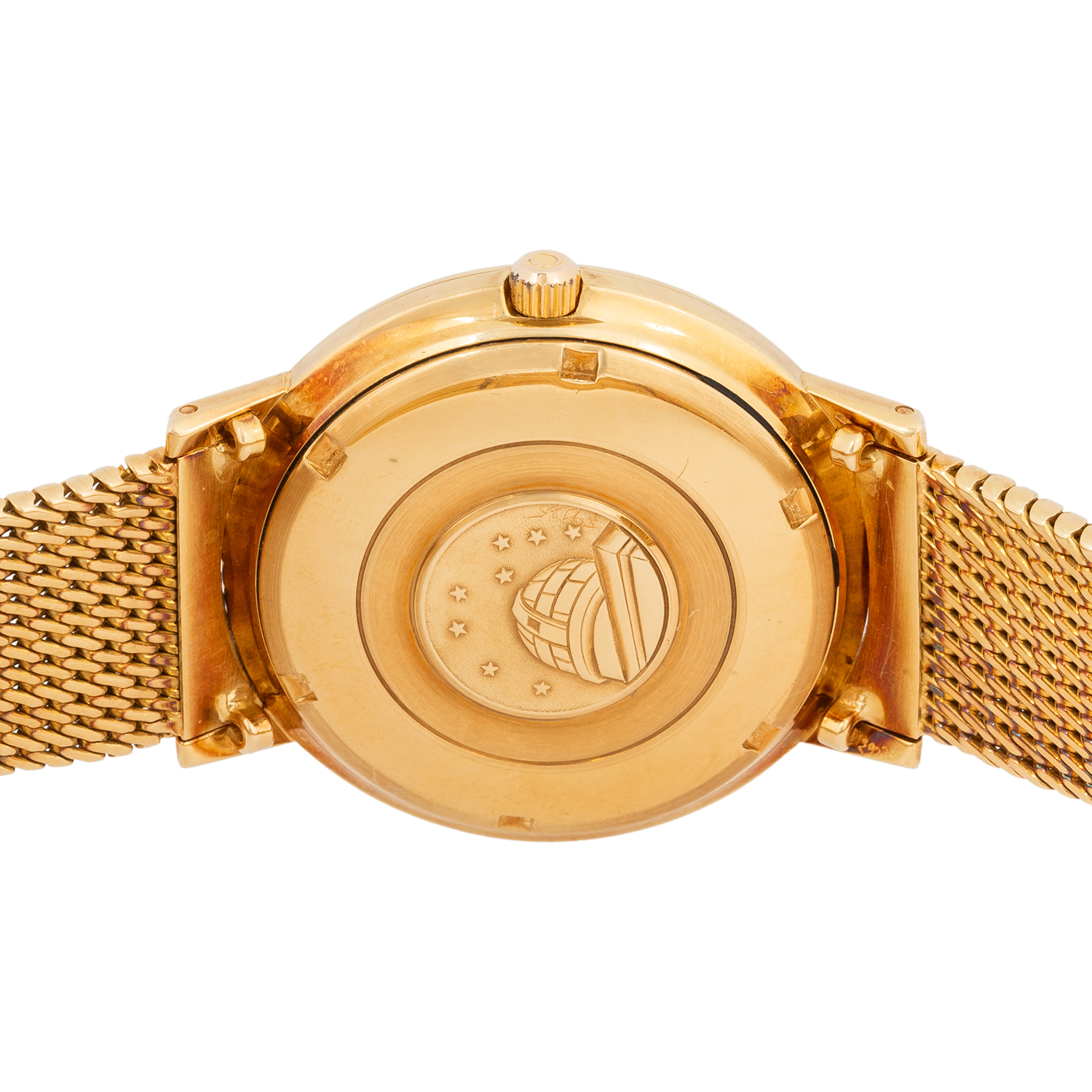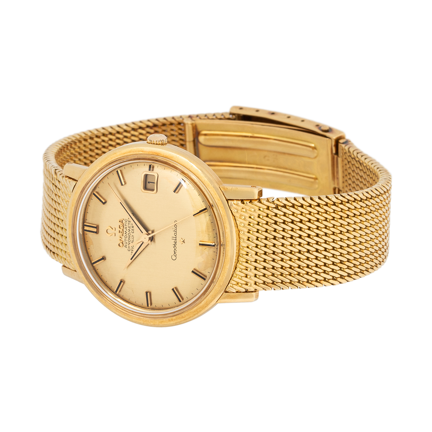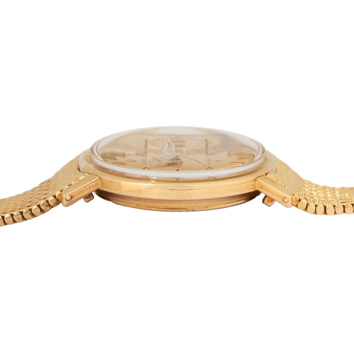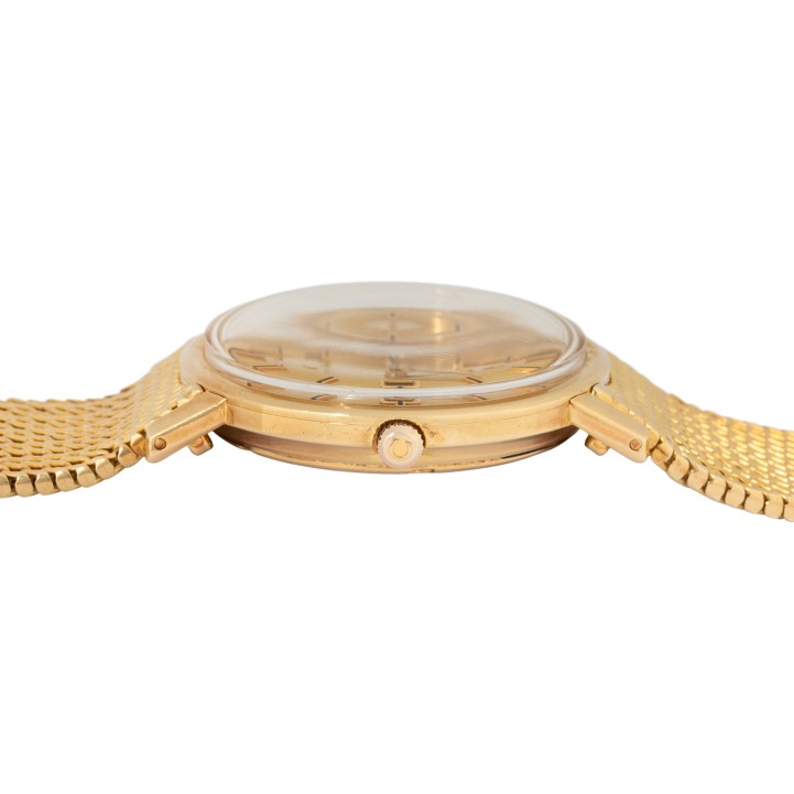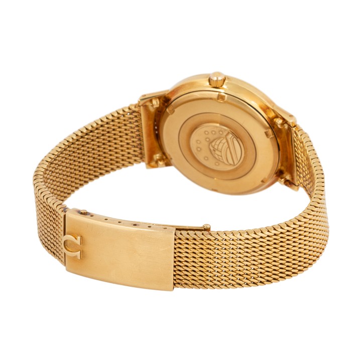 18K Gelbgold. Automatikwerk Kal. 561 in funktionsfähigem Zustand. Honigfarbenes Zifferblatt mit Stabindizes und Datumsanzeige. 18K Gelbgold Milanaise-Armband mit Omega Faltschließe 18K. Gebrauchter Zustand, mit Tragespuren, Zifferblatt bei 6 und 3 Uhr am Rand befleckt. Durchmesser ca. 36 mm gemessen ohne Krone. Passend bis zu einem Handgelenksumfang von ca. 19,5 cm.