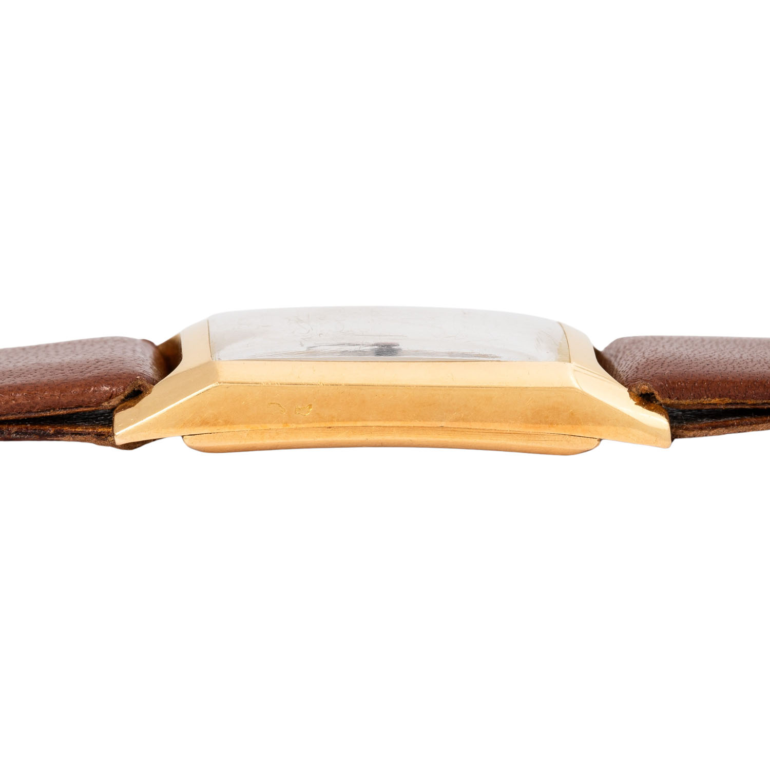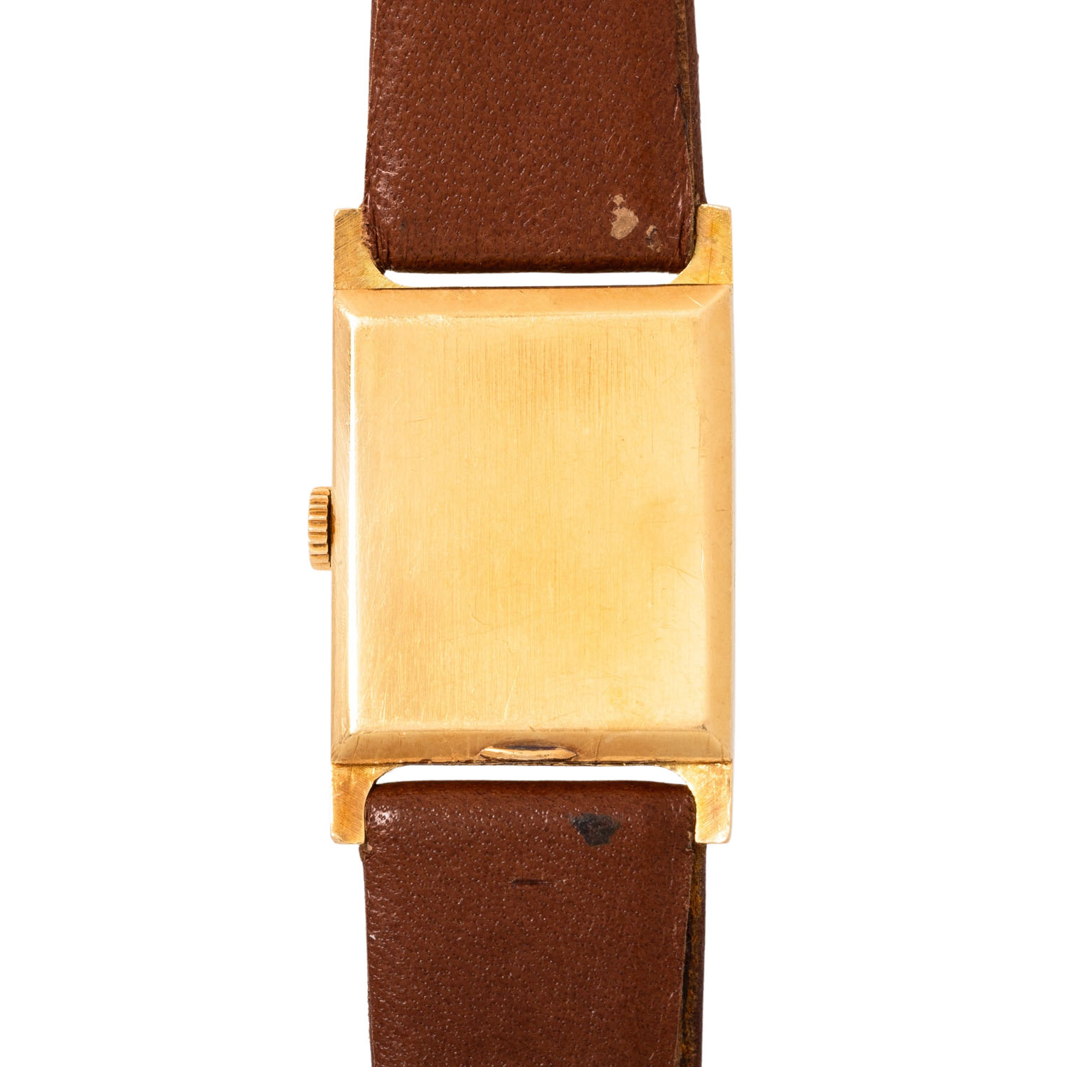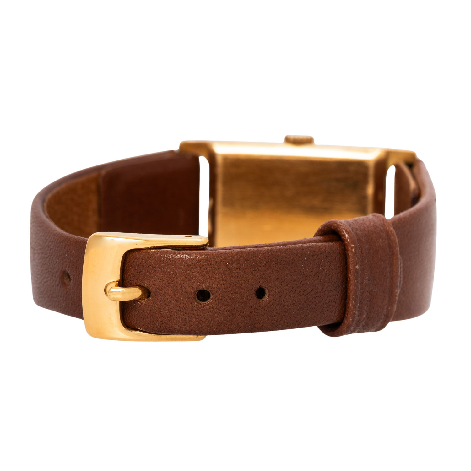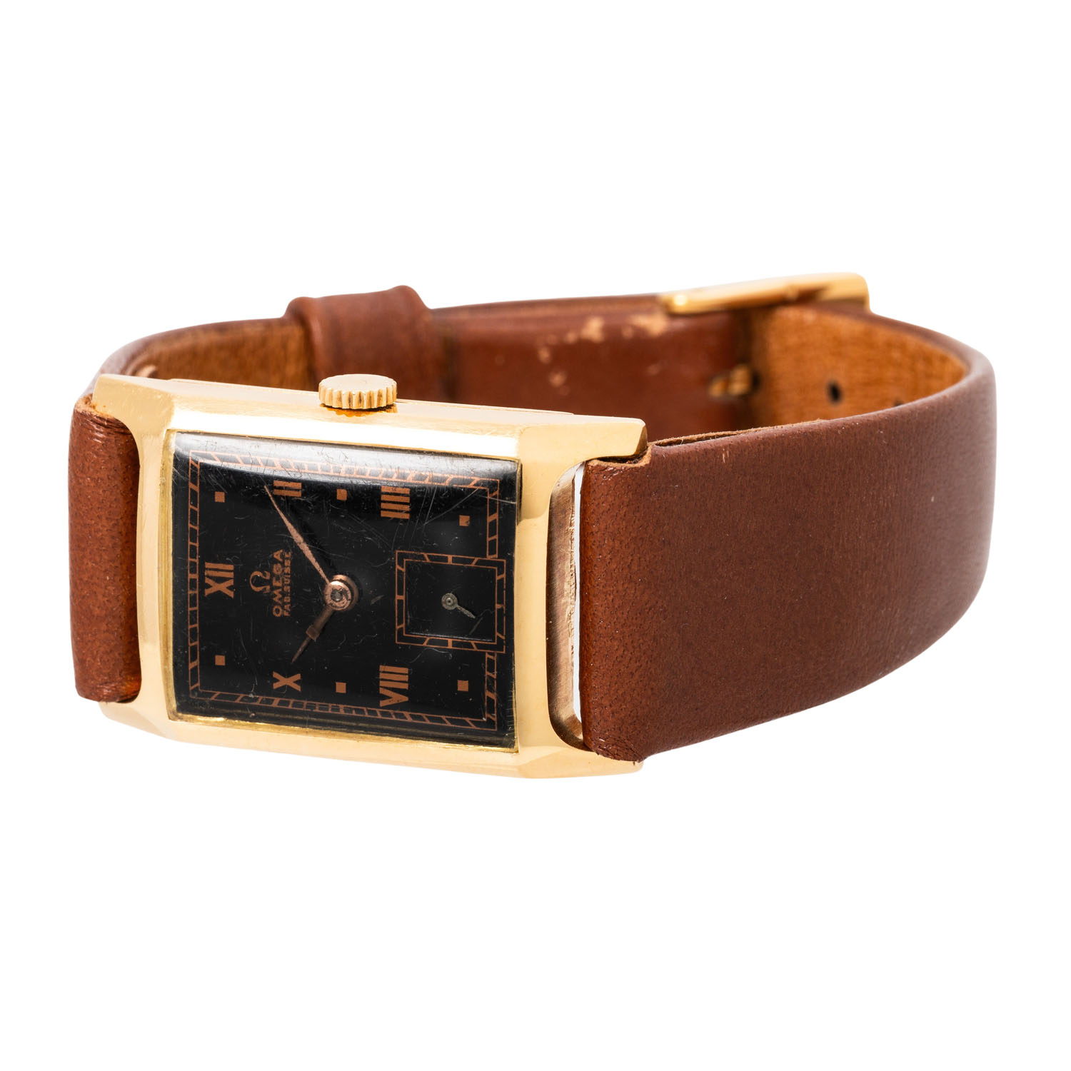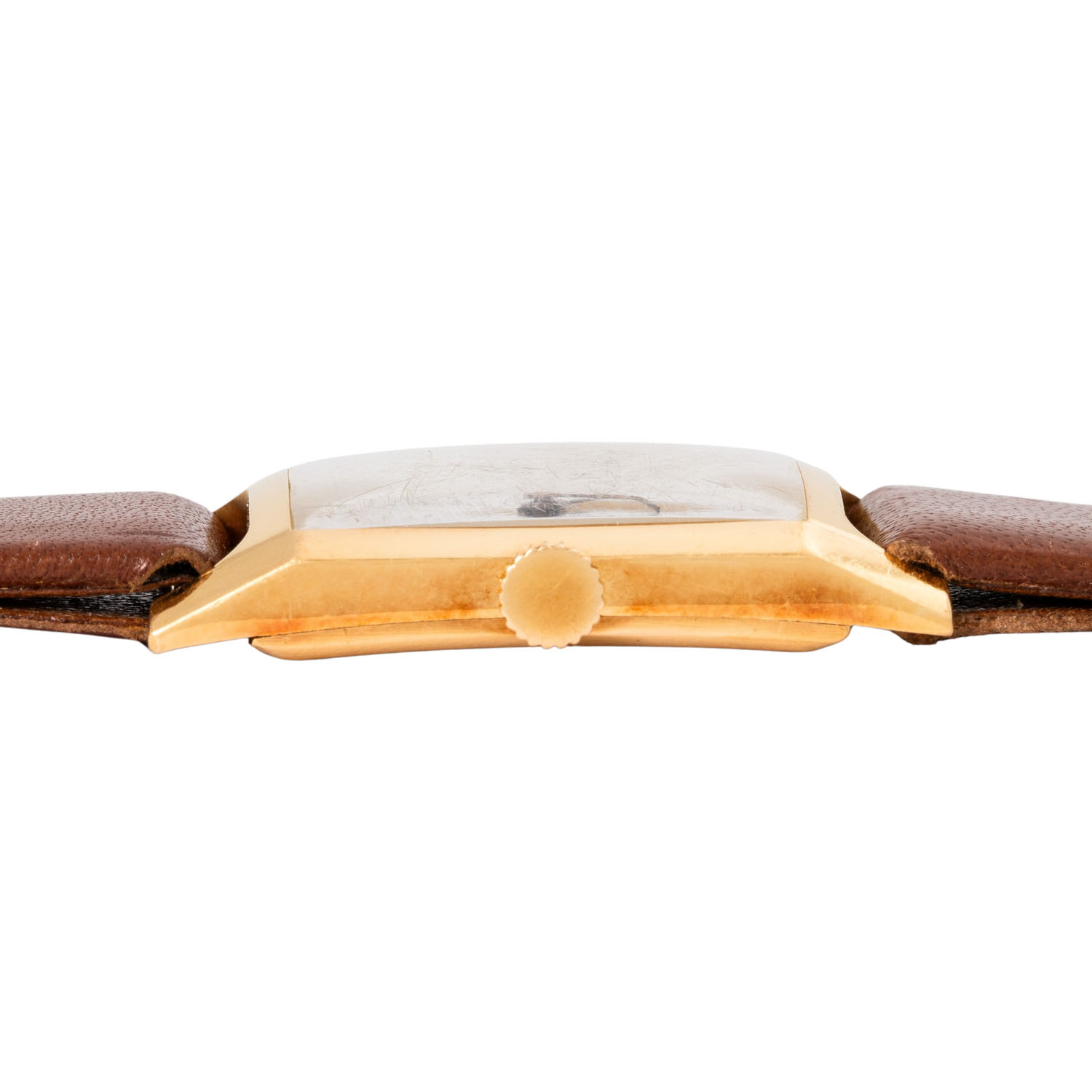 Gelbgold 18K. Handaufzugswerk in funktionsfähigem und revisionsbedürftigem Zustand. Schwarzes Zifferblatt mit römischen Ziffern und Fab Suisse Signatur. Neues Lederband mit vergoldeter Dornschließe. Die Uhr Ist für ihr Alter in einem guten Vintage Zustand mit sichtbaren Tragespuren. Das Glas hat mehrere feine Kratzer. Durchmesser ca. 22 mm ohne Krone.