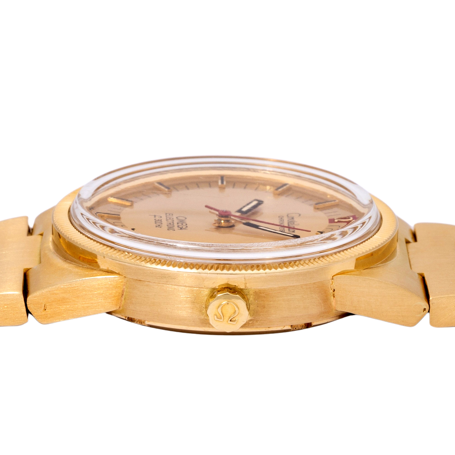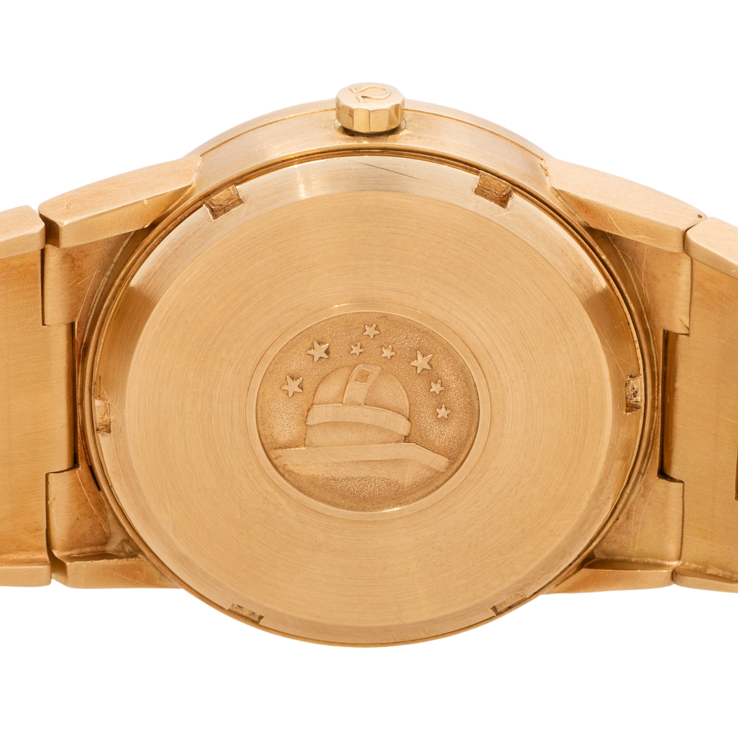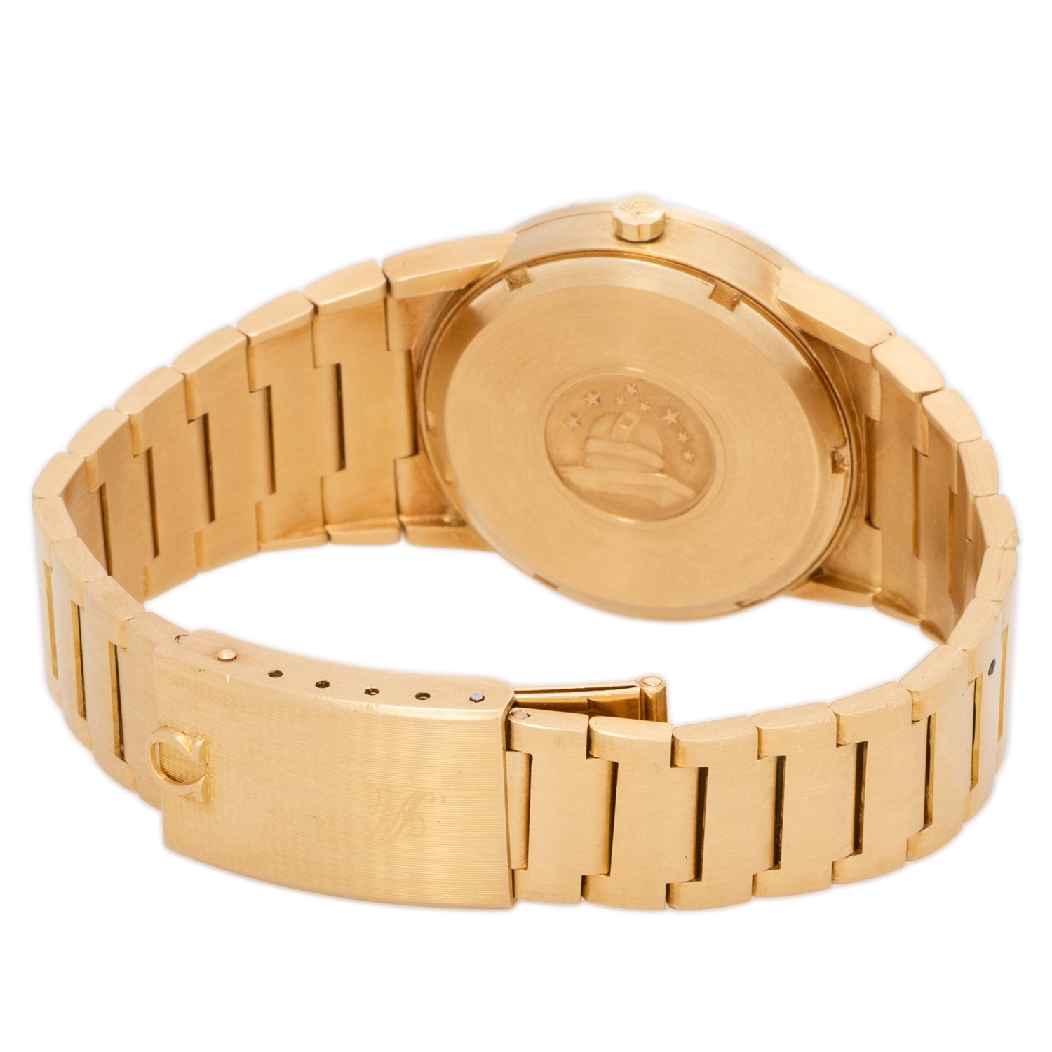 Gelbgold 18K. Stimmgabel-Uhrwerk Kal. 1250, funktionsfähig. Massivgoldenes 'OMEGA OM' Two-Tone Zifferblatt mit applizierten Stabindizes und Datumsanzeige, Tritium-Zeiger. Originales Gliederarmband mit verstellbarer Faltschließe in Gelbgold 18K, Schließe mit Monogramm 'AZ'. Guter Zustand, sichtbare Gebrauchsspuren an Gehäuse und Armband. Durchmesser ca. 35mm ohne Krone, passend bis zu ca. 18cm Handgelenksumfang.