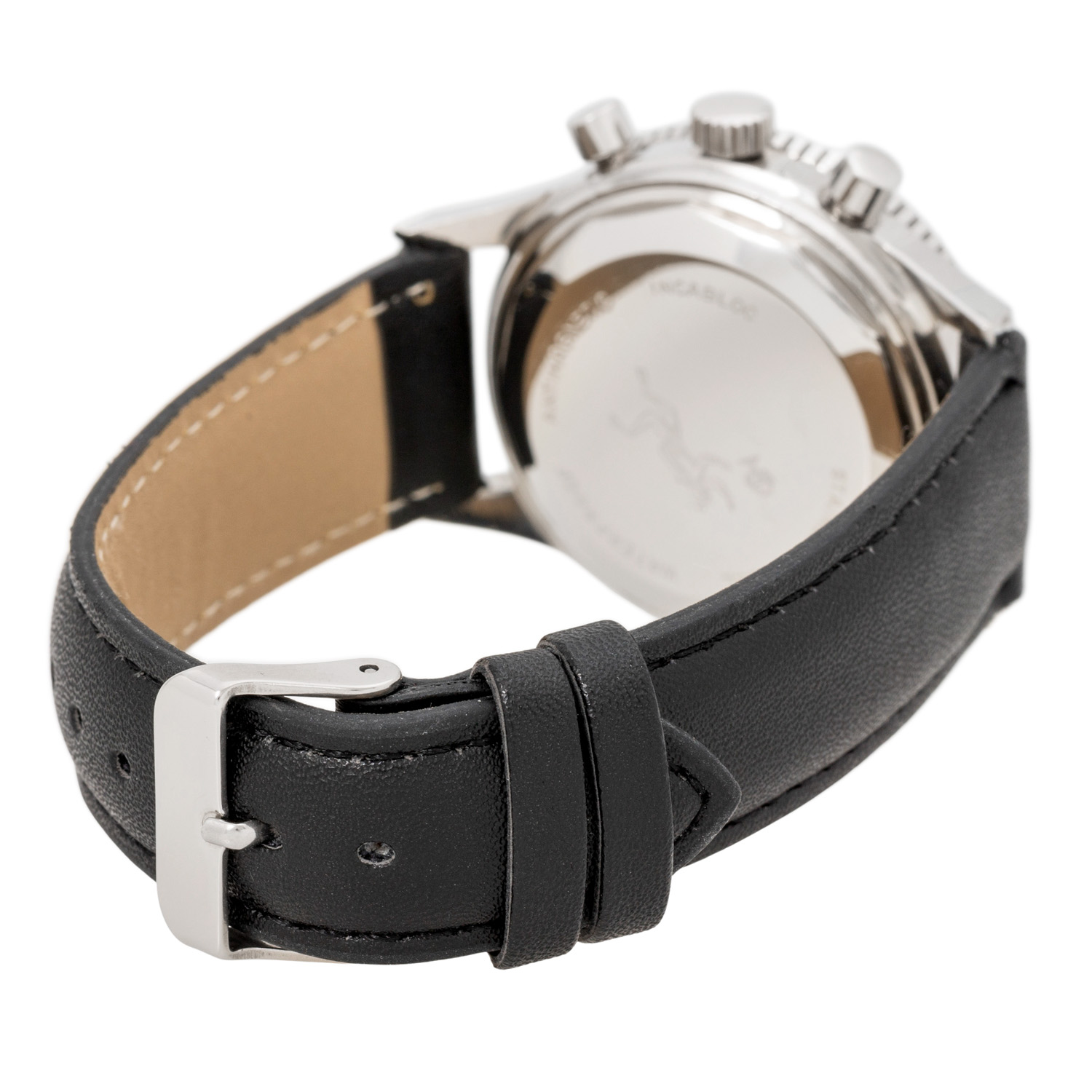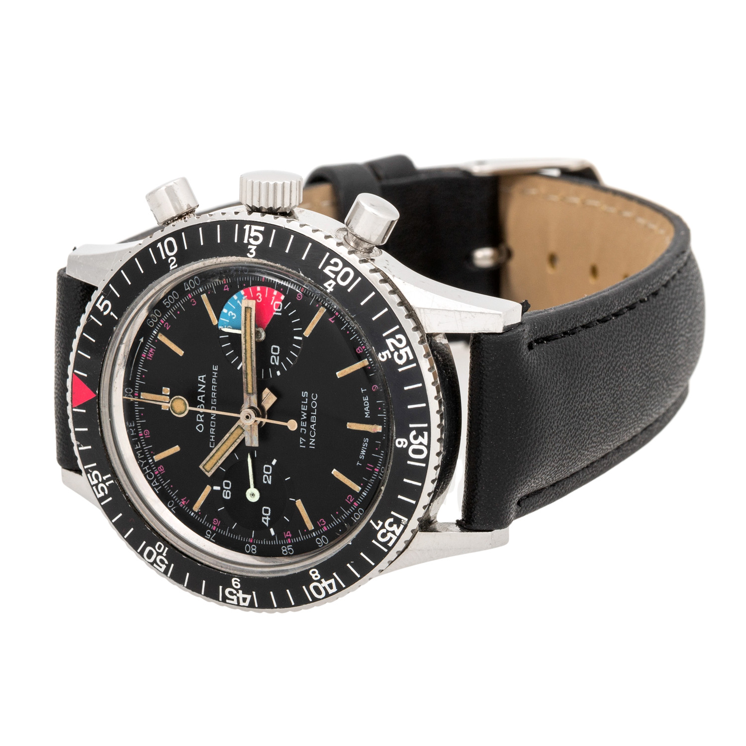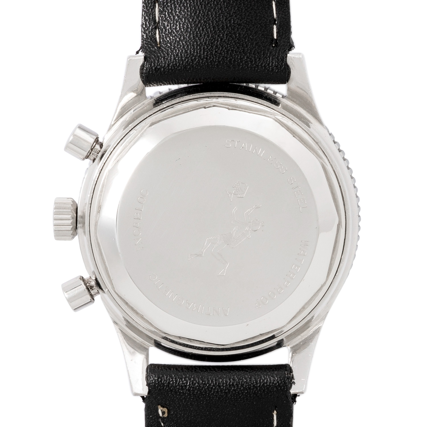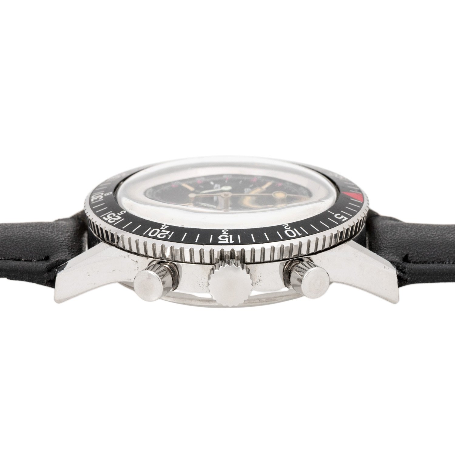 Edelstahl. Handaufzugswerk Landeron 248 mit sehr guten Gangwerten (+4s/d. 324°). Schwarzes Tritium Zifferblatt mit 2 Totalisatoren, kleiner Sekunde und Tachymeter Skala. Beidseitig drehbare Lünette. Neutrales Lederband mit Dornschließe. Guter Vintage Zustand mit sichtbaren Tragespuren am Gehäuse und der Lünette. Durchmesser ca. 38 mm (gemessen ohne Krone).