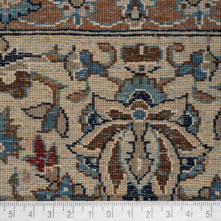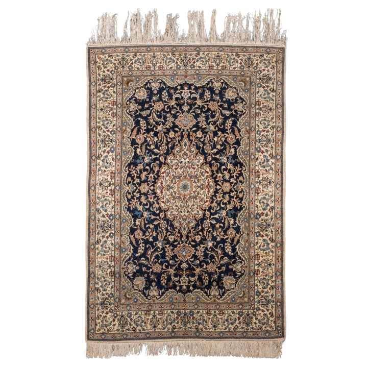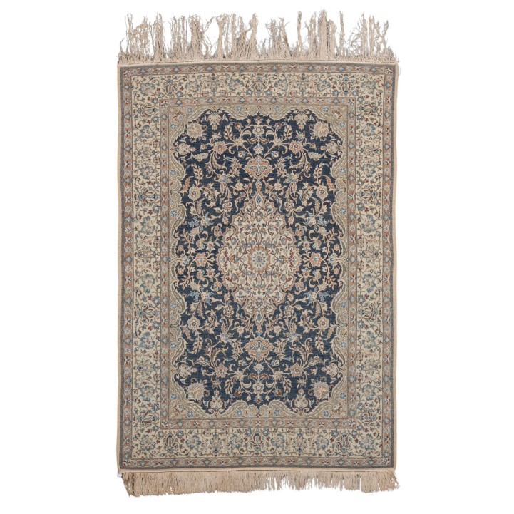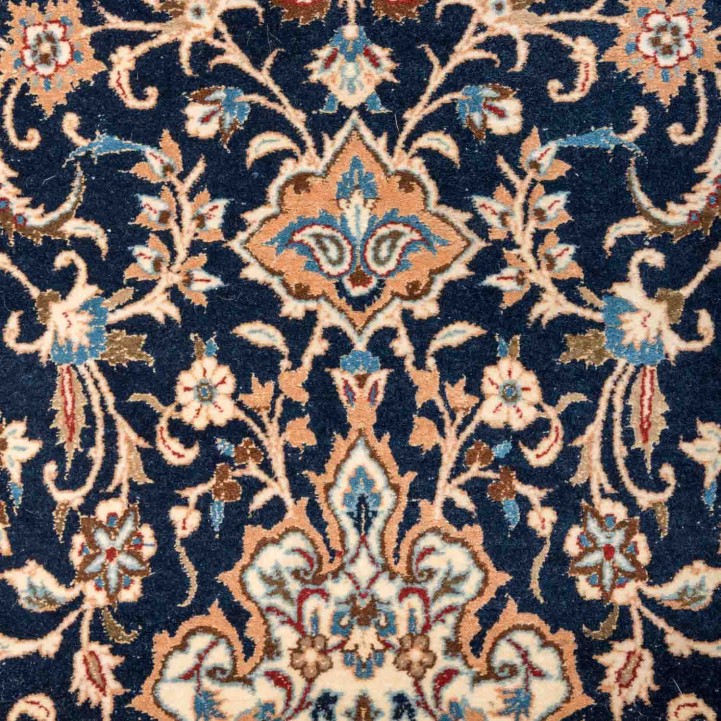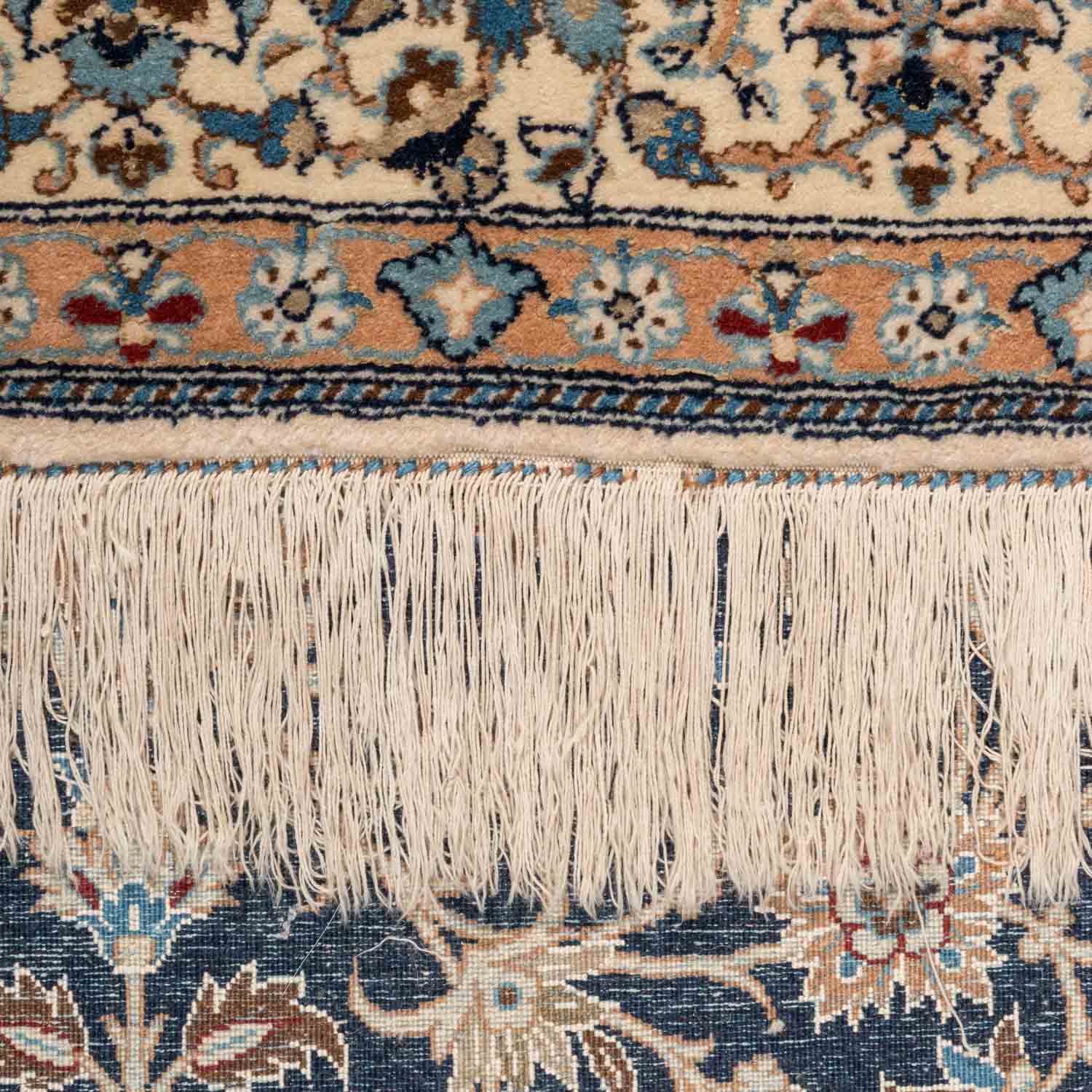 Ein Zentralmedaillon mir Anhängseln ziert den mit Floralrankwerk durchgemusteren dunkelblauen Spiegel. Die hellbeigefarbene Hauptbordüre zeigt ein florales Wellenmuster. Edle Knüpfarbeit aus feiner Korkwolle mit Seide auf Baumwolle, 1.000.000 Knoten pro qm. Alters- und Gebrauchsspuren, besch. im Bereich der Fransen. Original-Zertifikat anbei. KEIN VERSAND IN DIE USA