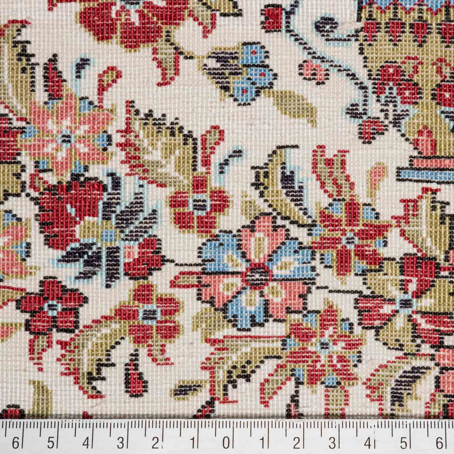 Das cremeweisse Innenfeld zeigt ein ausladendes Vasenmotiv, das von einem ovalen Blüten-Feston eingerahmt ist, auch die Eckenischen sind floral verziert. Die schwarzblaue Hauptbordüre ist mit einem floralen Wellenmuster durchgemustert. Querformatiger Wandteppich aus reiner Seide. Bitte bedenken Sie, daß Sie einen alten und gebrauchten Teppich erwerben, der Gebrauchsspuren und Schäden haben kann. Informieren Sie sich daher genau, auch über die Versandkosten, da der Zuschlag zur Abnahme verpflichtet. KEIN VERSAND IN DIE USA