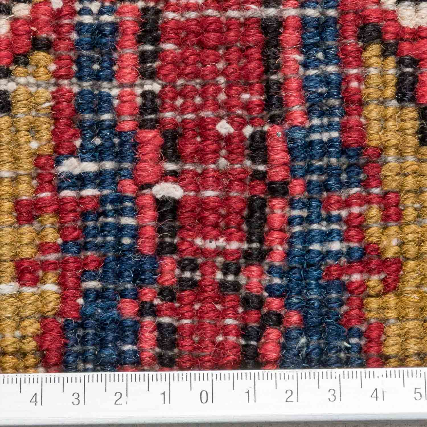Ein monumentales Sternmedaillon mit entsprechenden Eckfüllungen dominiert den roten, mit stilisiertem Rankwerk gemusterten Fond des Innenfeldes. Die breite, dunkelblaue Hauptbordüre ist mit einem floralen Wellenmuster mit großen Palmetten durchgemustert. Schöne leuchtende Farben. Alters- und Gebrauchsspuren, part. dünn und abgelaufen.
