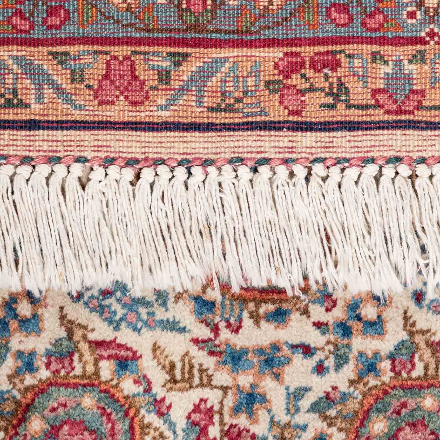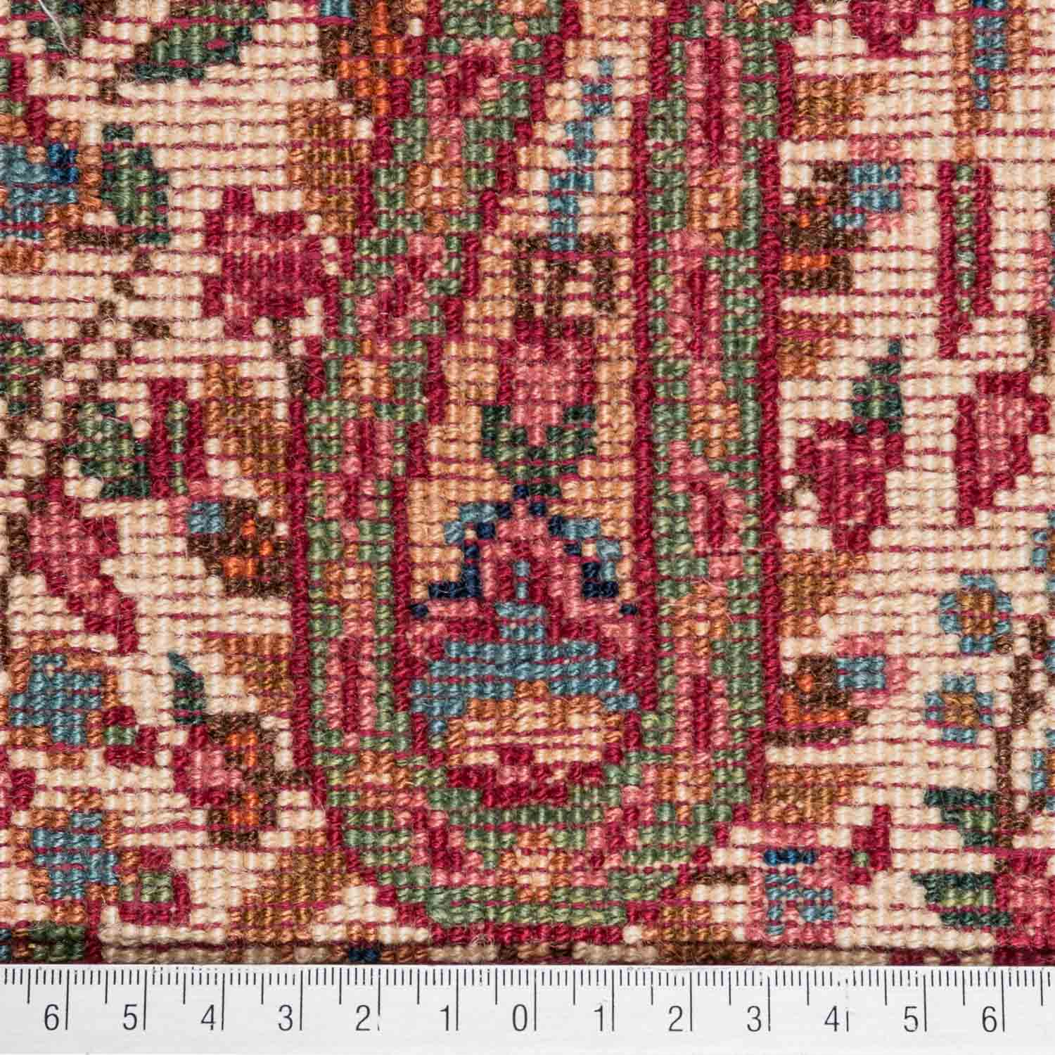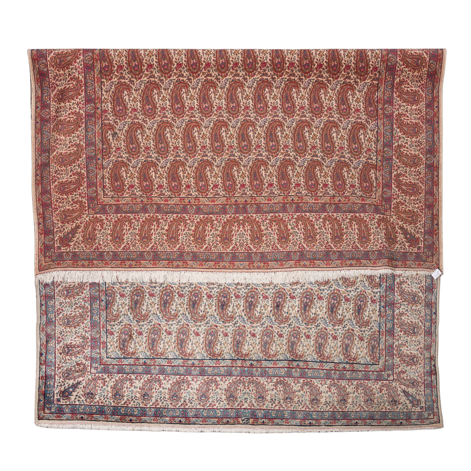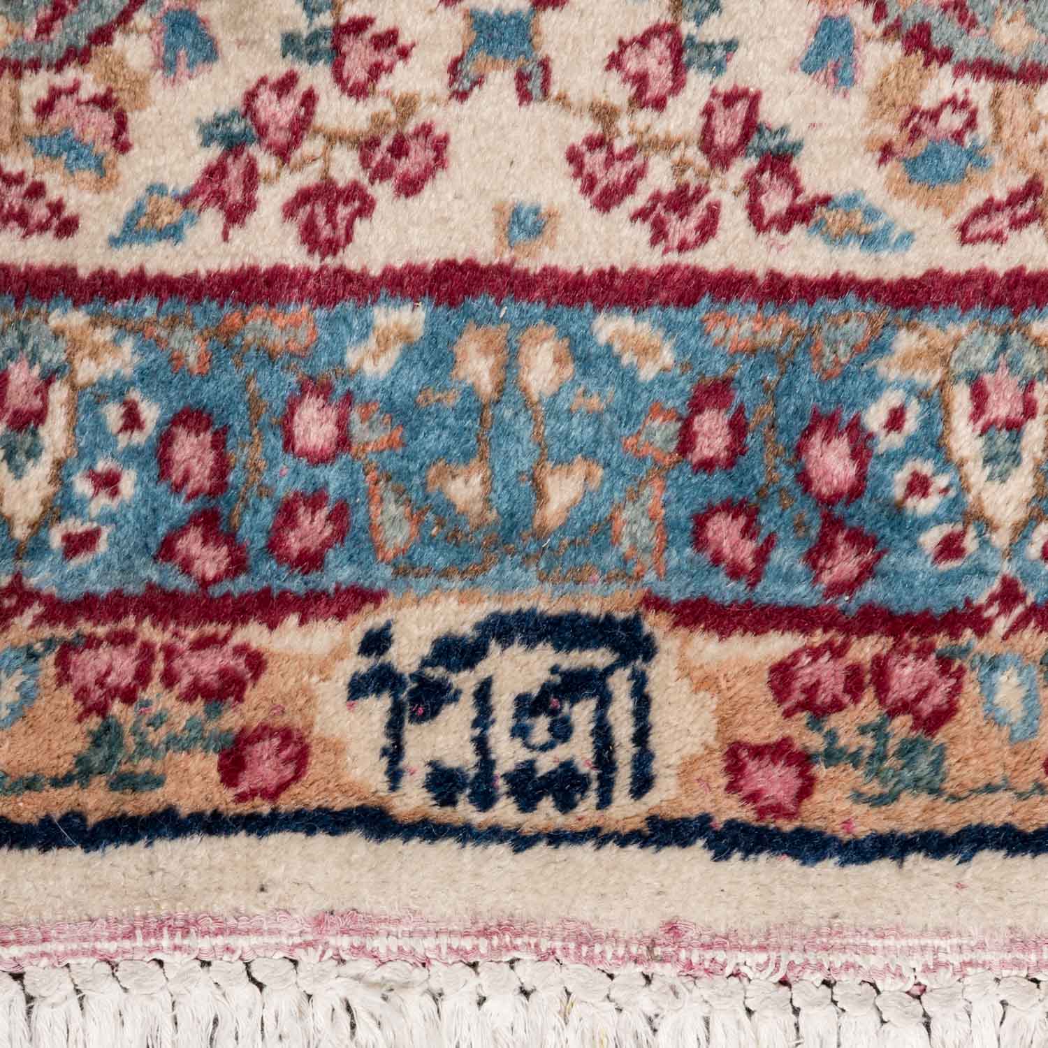 Das hellbeigefarbene Innenfeld und auch die Bordüre sind mit einem Endlos- Paisleymuster durchgemustert. Signierte Knüpfarbeit. Alters- und Gebrauchsspuren, besch. KEIN VERSAND IN DIE USA