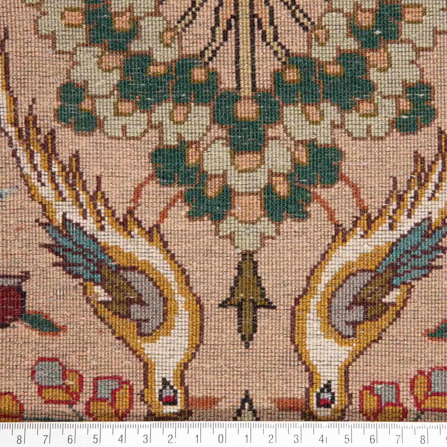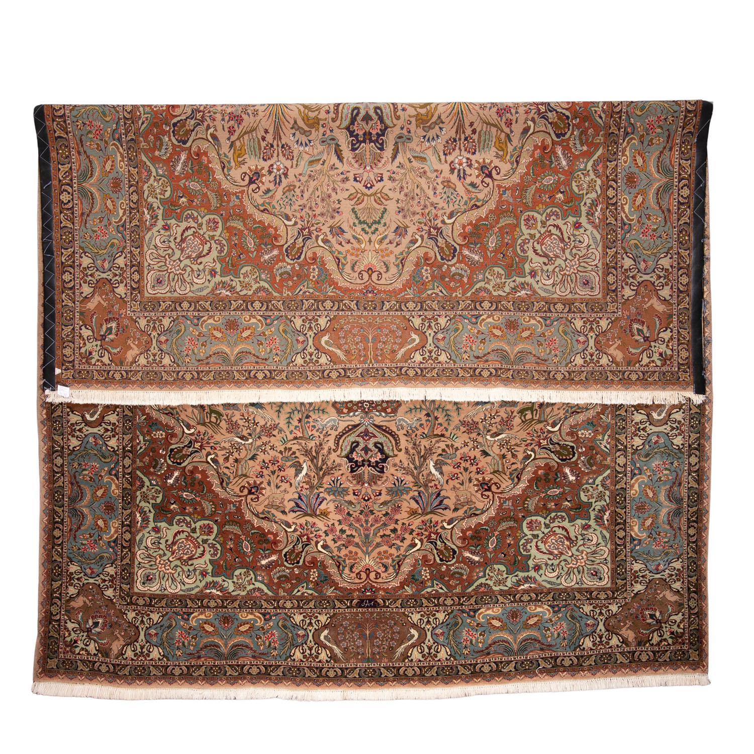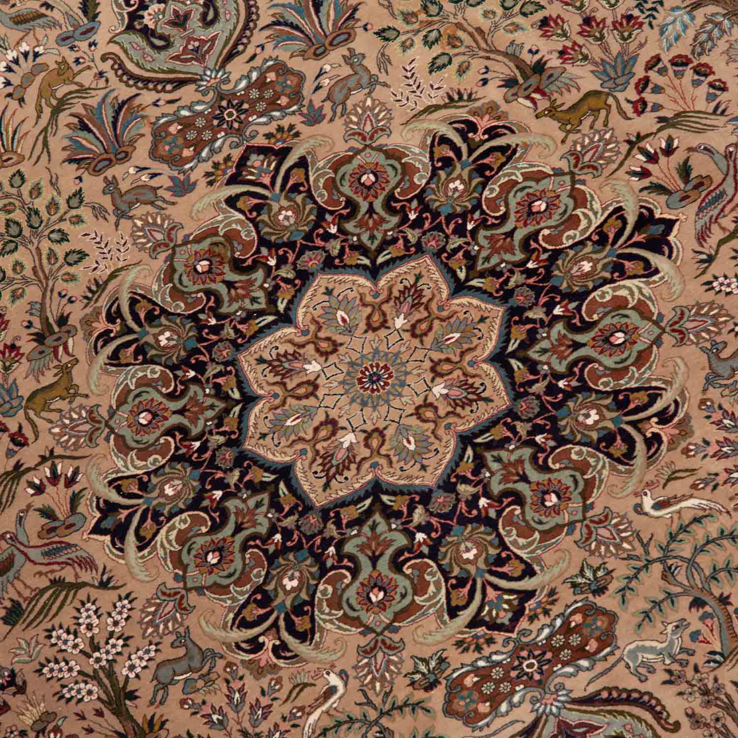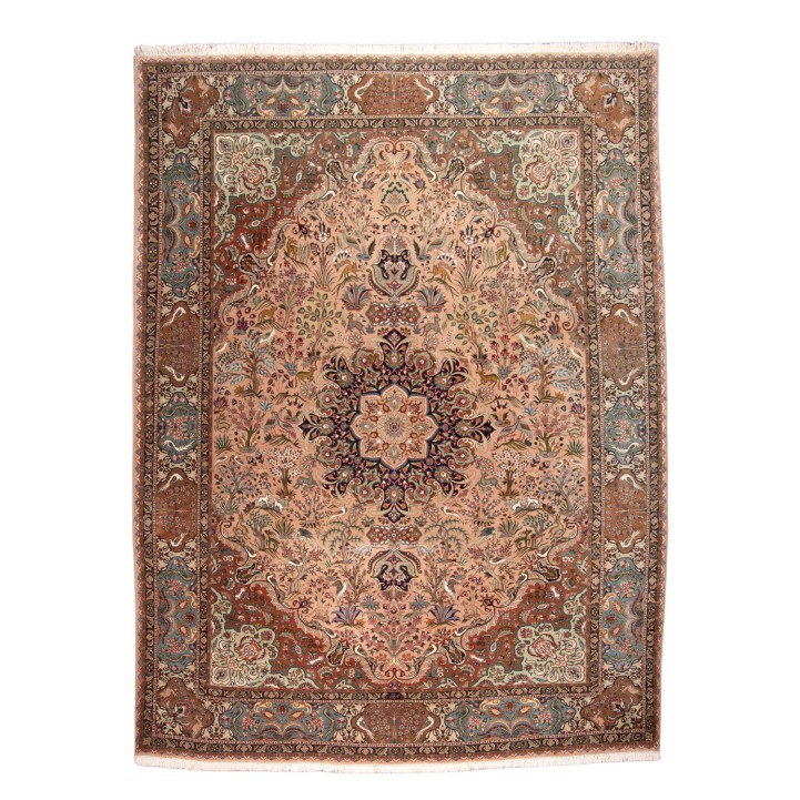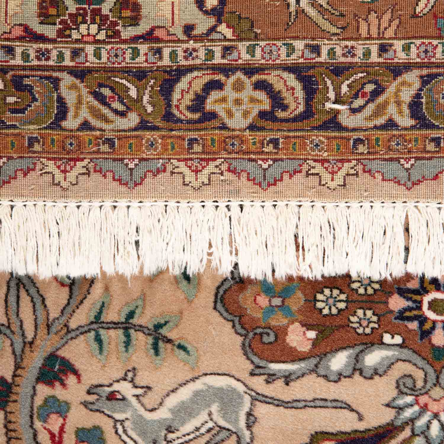 Ein zentrales Sternmedaillon mit Anhängseln und entsprechenden Eckfüllungen ziert den hellbraunen Fond, der in aufsteigender Anordnung Paradiesgartenmotive, wie blühende Bäume und eine Vielzahl verschiederner Tiere zeigt. Die Hauptbordüre ist mit braunen und stahlblauen Kartuschen durchgemustert, die mit blühenden Pflanzen und Tierpaaren verziert sind. Mit Signum der Manufaktur 'Behbodi' (farsisch). Normale Gebrauchsspuren, eine Hälfte mit etwas verblassten Farben. Erworben 1975 für umgerechnet 17.500.-€ in Schwäbisch Hall bei 'Teppich Klein'. KEIN VERSAND IN DIE USA