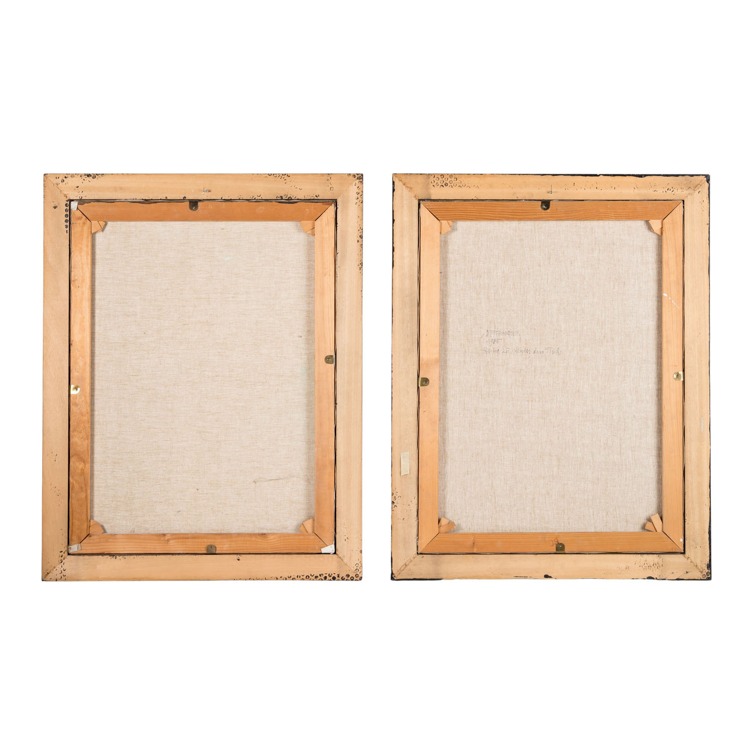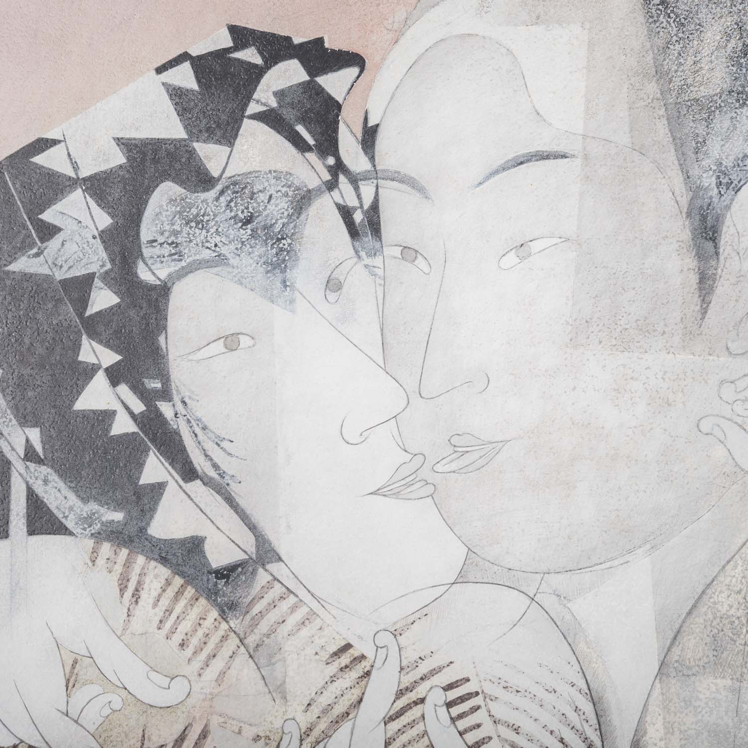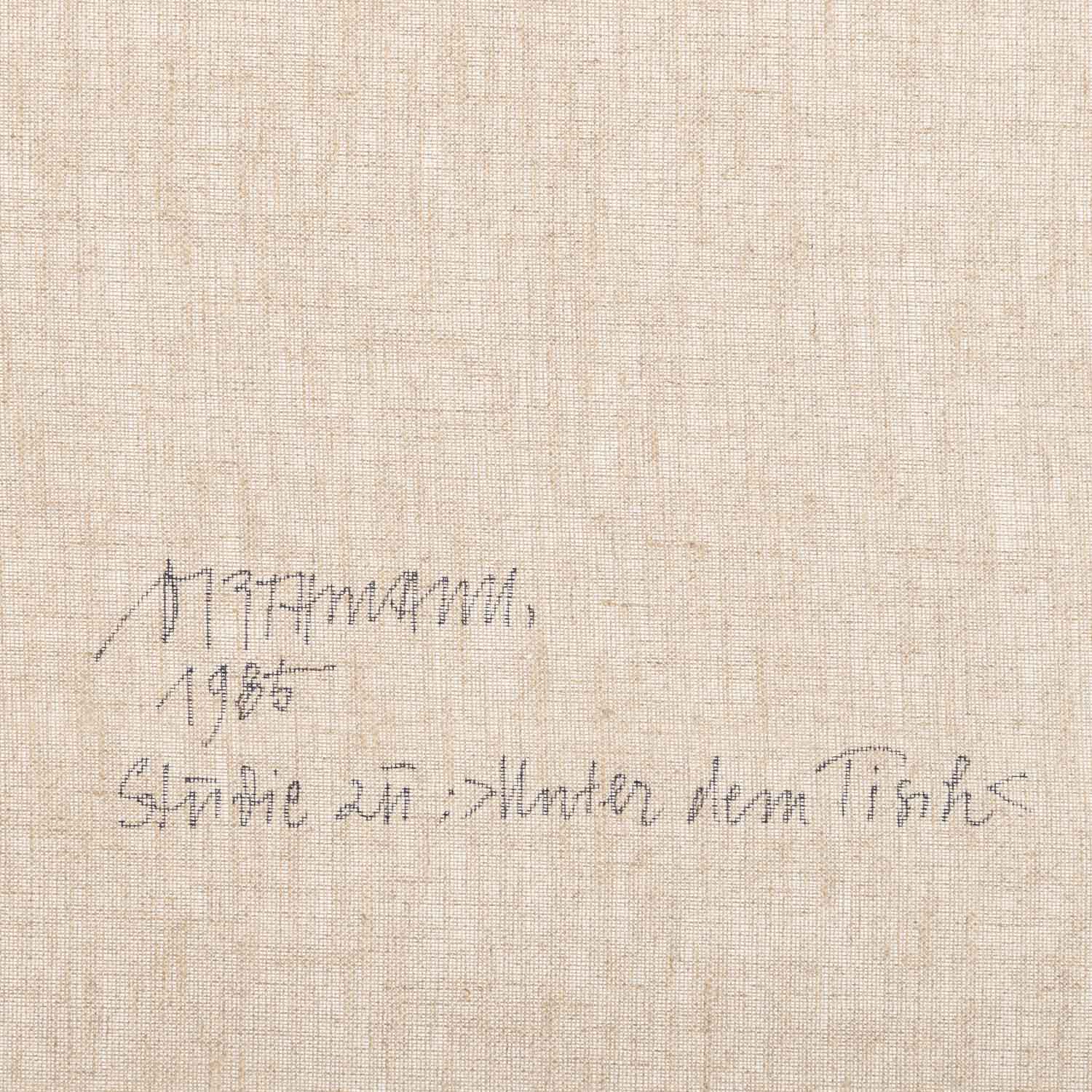 je Mischtechnik/Leinwand, 1) Studie zu 'Unter dem Tisch', 1985, unsign., HxB: ca. 80x60 cm (93x73 cm mit Rahmen). VERSO auf Leinwand bez., dat. und betitelt. 2) 'Küssendes Paar', u.re. sign., HxB: ca. 80x60 cm (93x73 cm mit Rahmen. Je Alters- und Beriebsspuren. Je mit Rahmen (Alters- und Beriebsspuren).