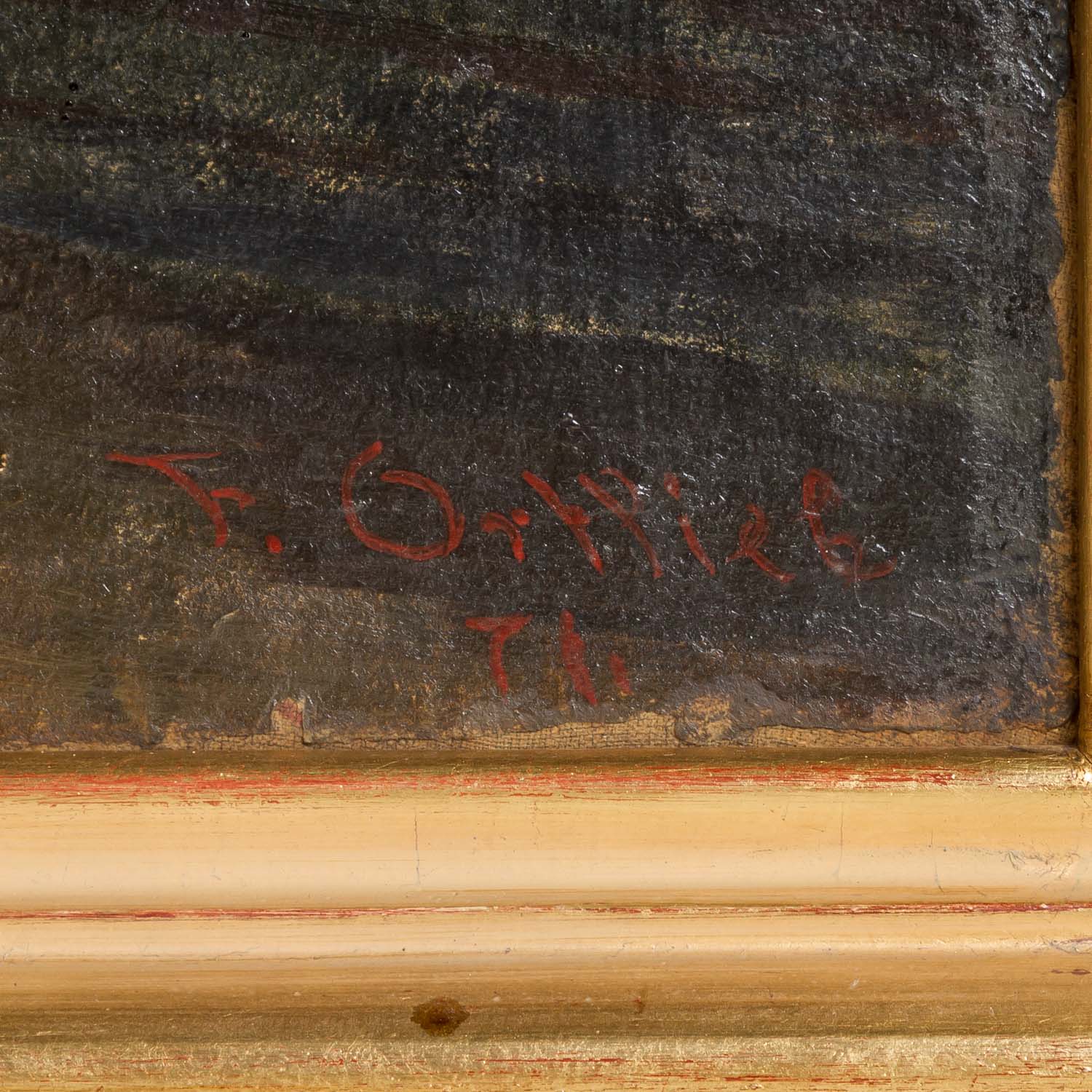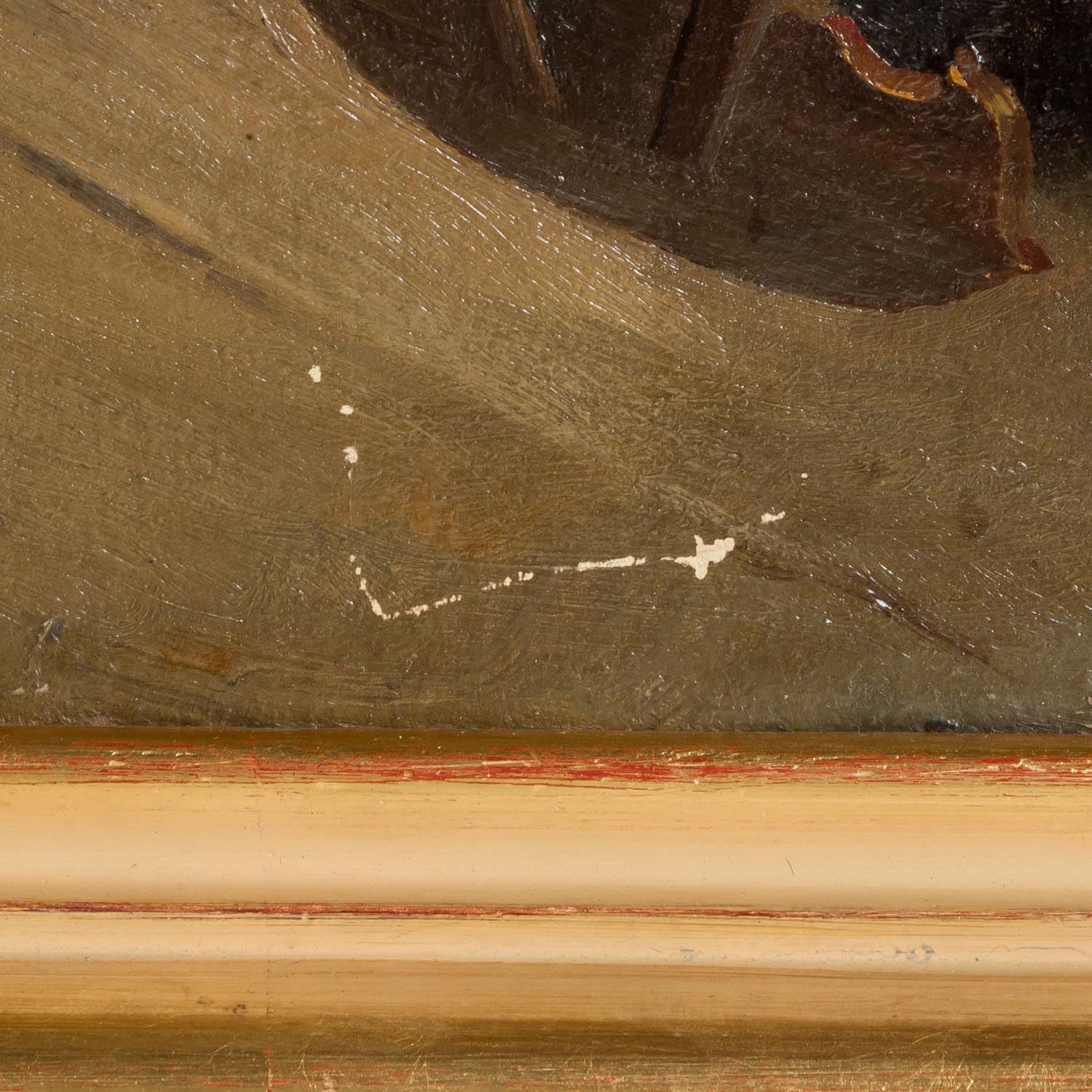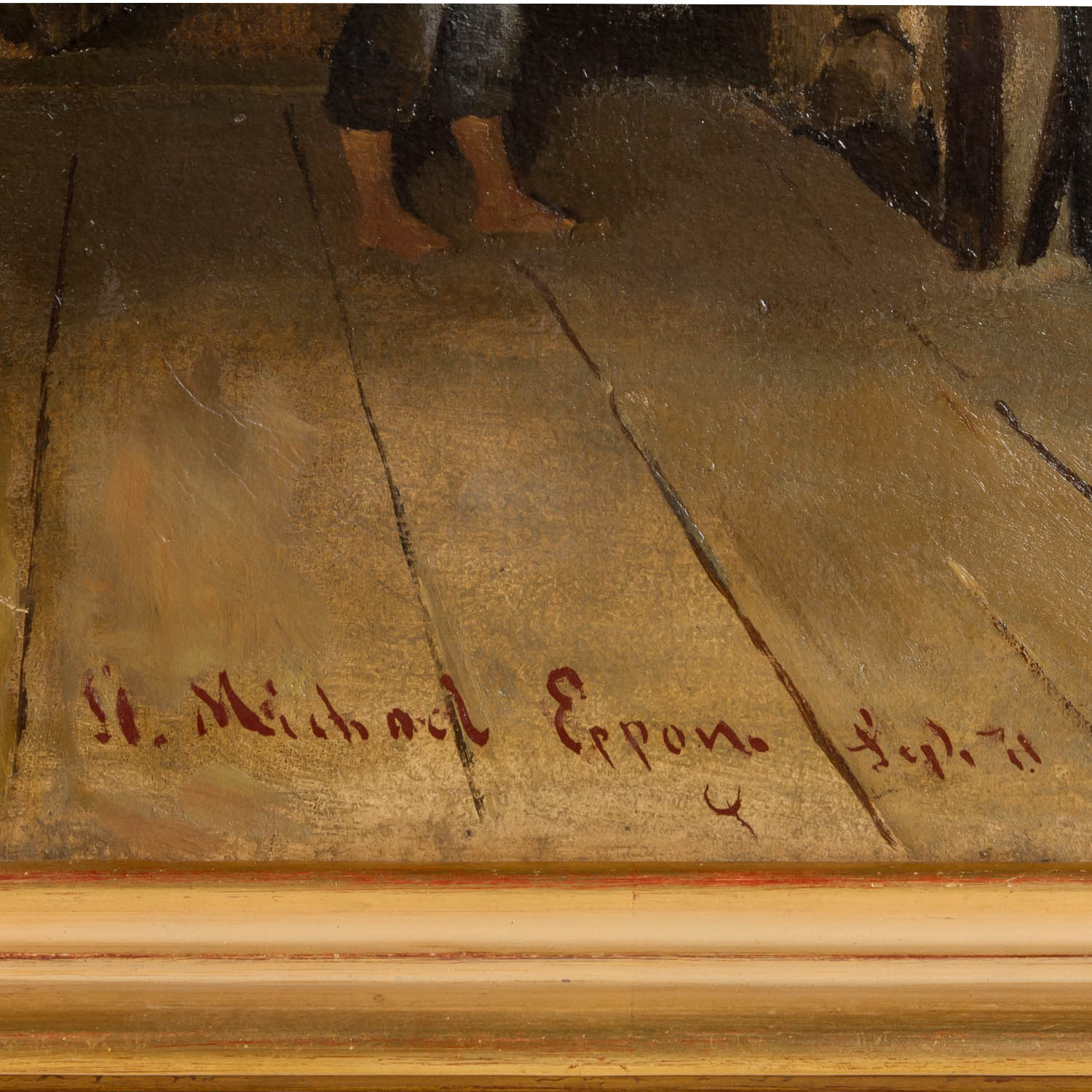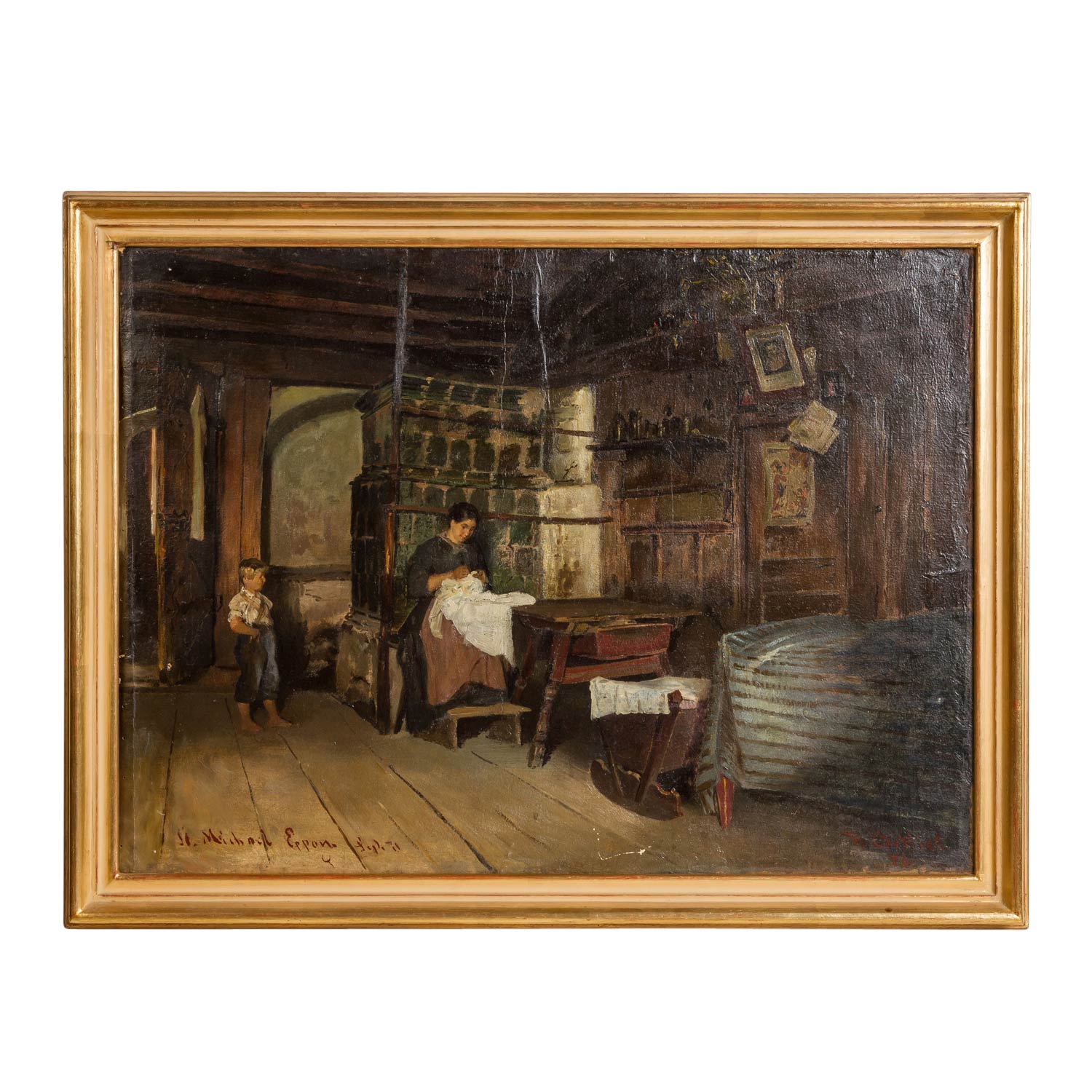 ORTLIEB, FRIEDRICH (Stuttgart 1839-1909 Munich), "Young woman with a boy in the room", She sitting at the handwork at the tiled stove, the boy watching her, below right signed and dated 'F. Ortlieb 71., below left inscribed and dated 'St. Michael Eppan, Sept 71. ', oil / canvas relined, HxW: approx. 56x75 cm (64x84 cm with frame). Scratches, paint flakes, part. slight damage to the edge, restored and retouched. With frame.