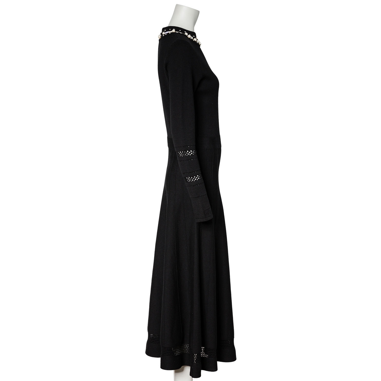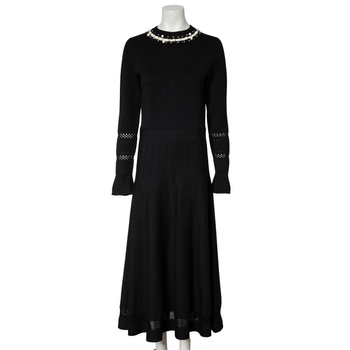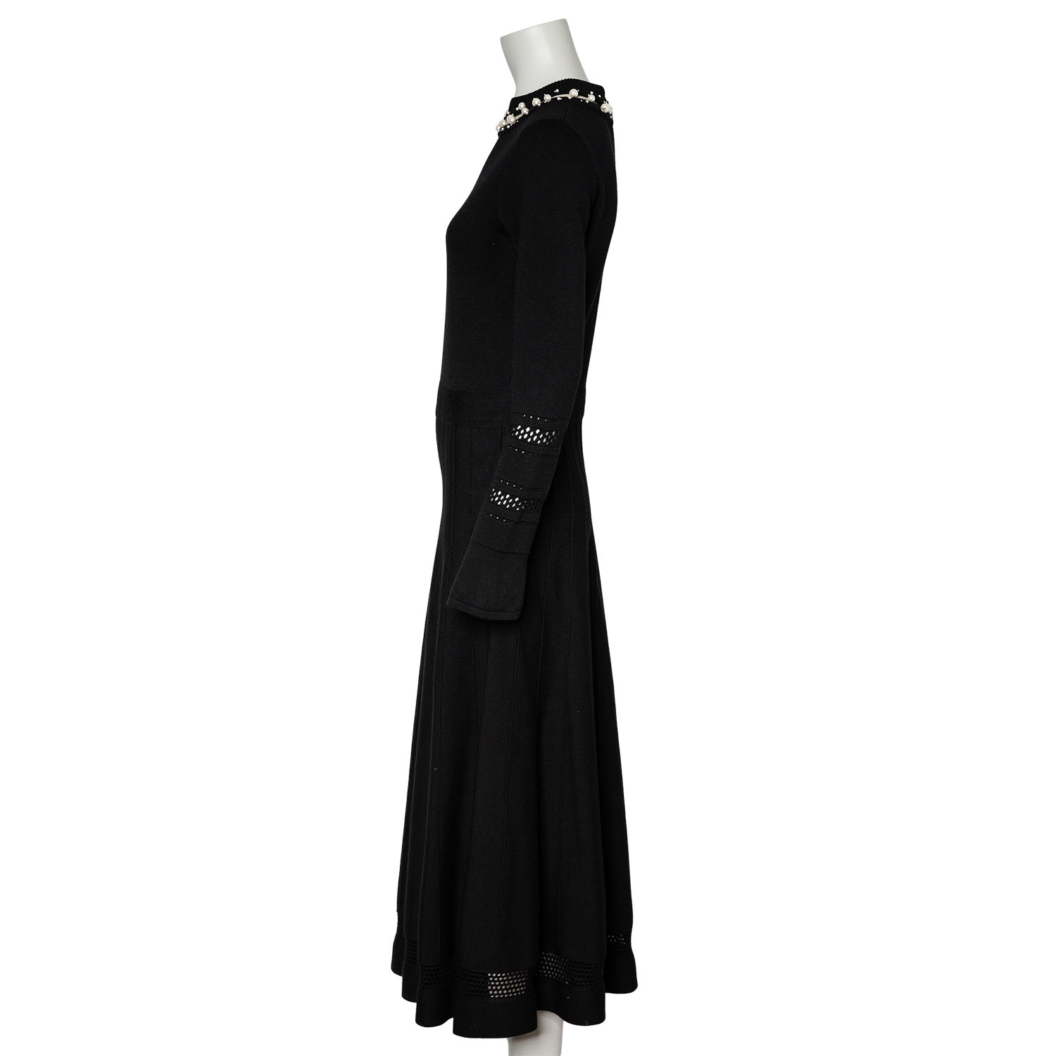 Schwarzes Maximodell mit feinem Mesh- und Perlendekor am Ausschnitt, dekorativem Lochmuster an den Ärmeln und weit schwingendem Rock. Reißverschluss im Rückteil. Leichte Tragespuren vorhanden.