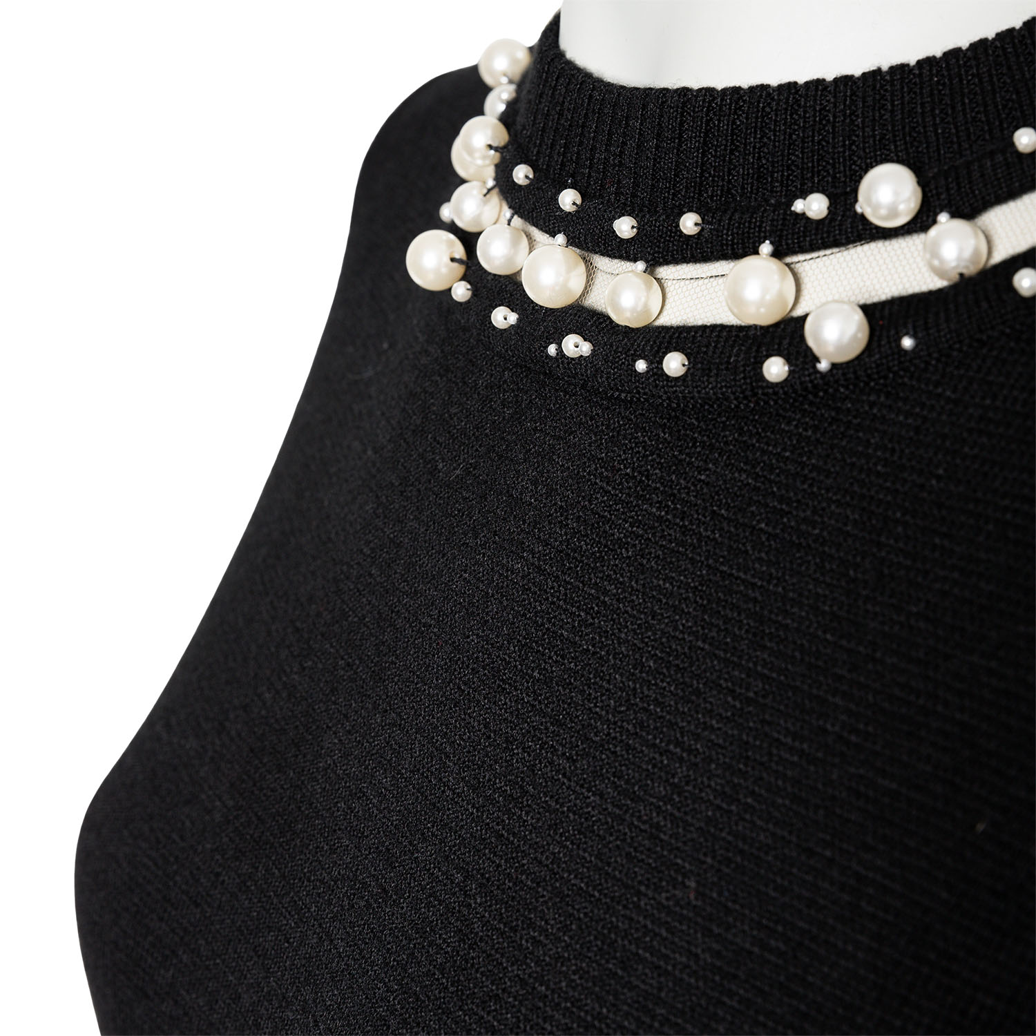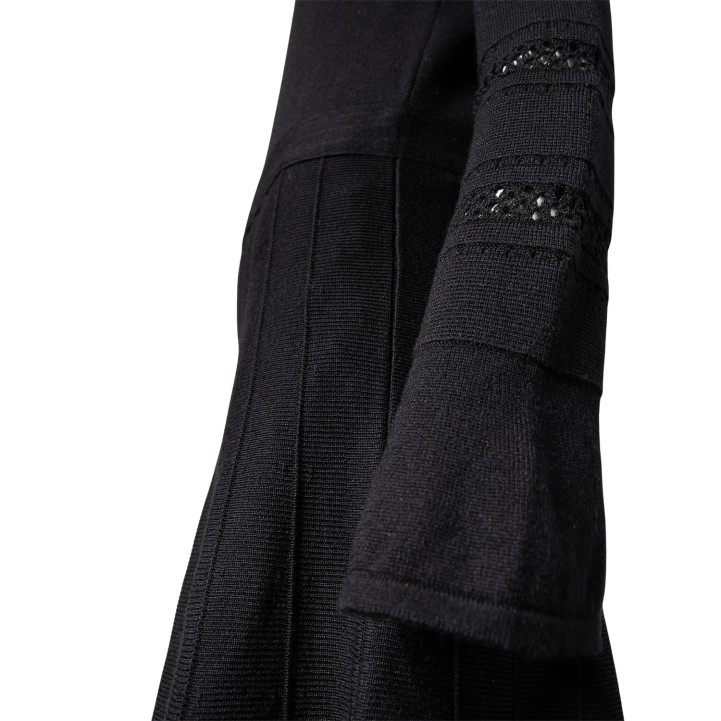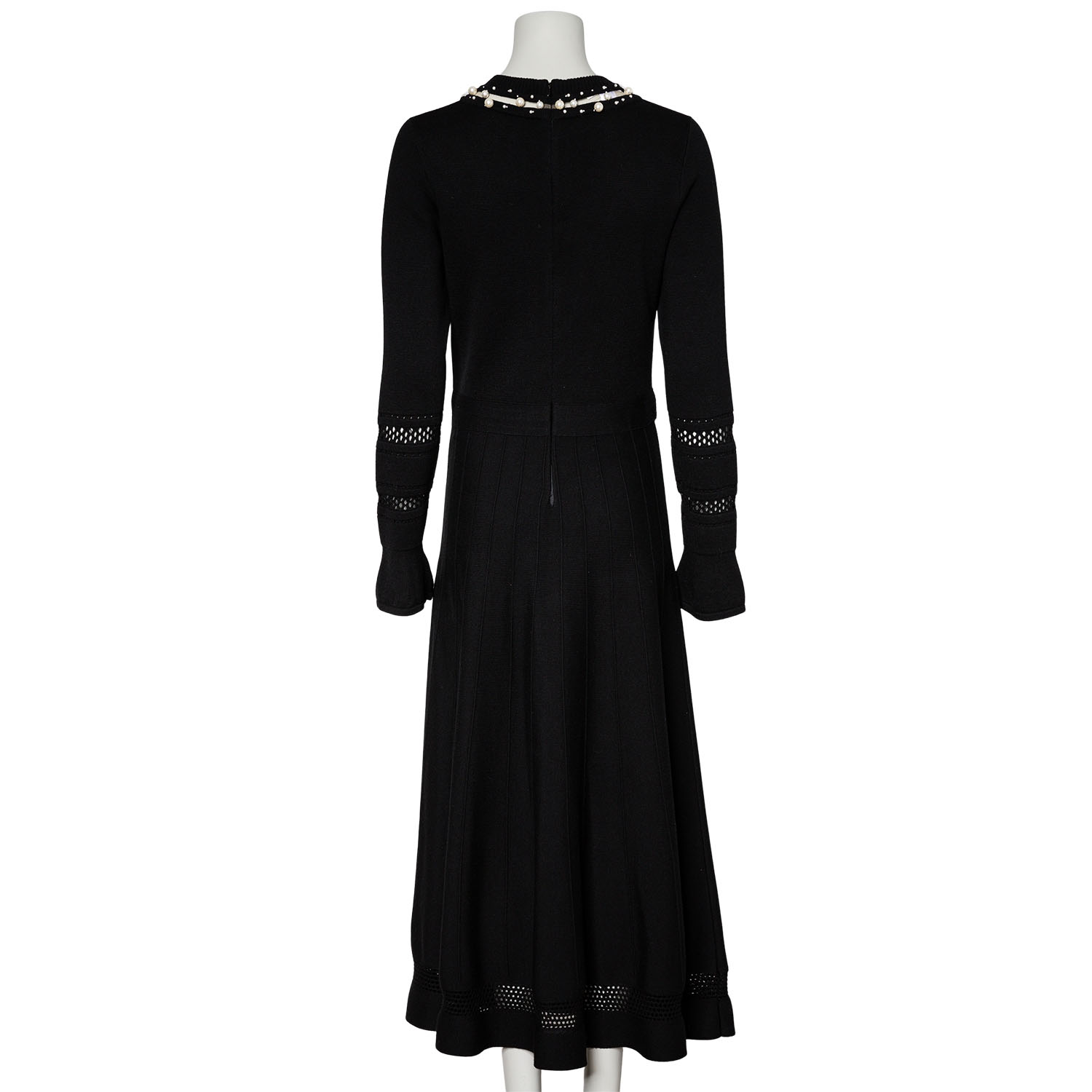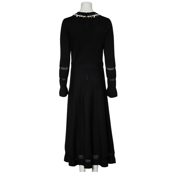Schwarzes Maximodell mit feinem Mesh- und Perlendekor am Ausschnitt, dekorativem Lochmuster an den Ärmeln und weit schwingendem Rock. Reißverschluss im Rückteil. Leichte Tragespuren vorhanden.