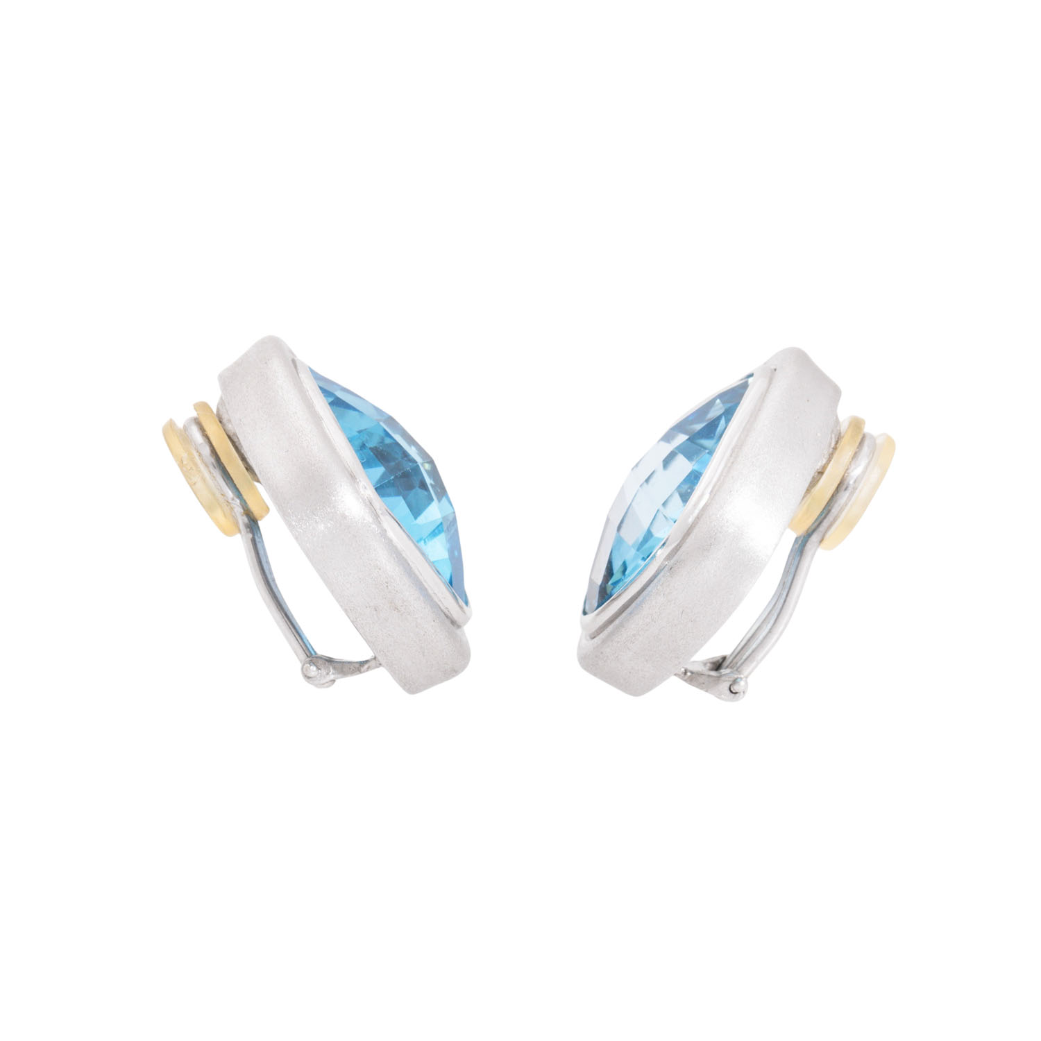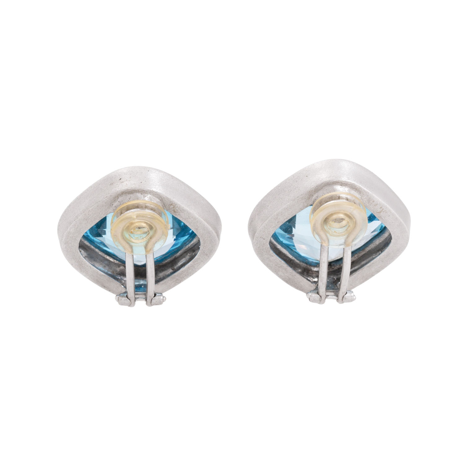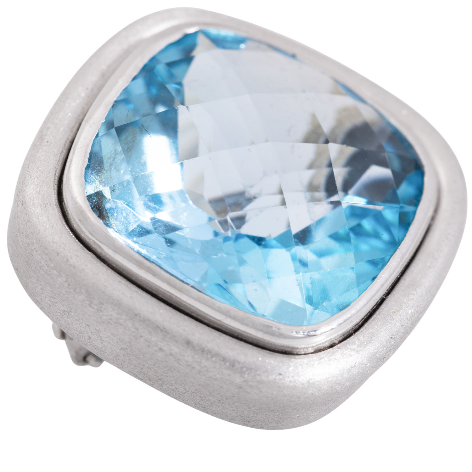 im Brioletteschliff ca. 16 x 16 mm, feiner Farbton, WG 18K, 23,3g, mattiert, L x B: ca. 21,8 x 21,5 mm, 21. Jh., leichte Tragespuren, mit Herstellerpunze 'E.K.', hochwertige Goldschmiedearbeit, 1 Stein fac. leicht besch..