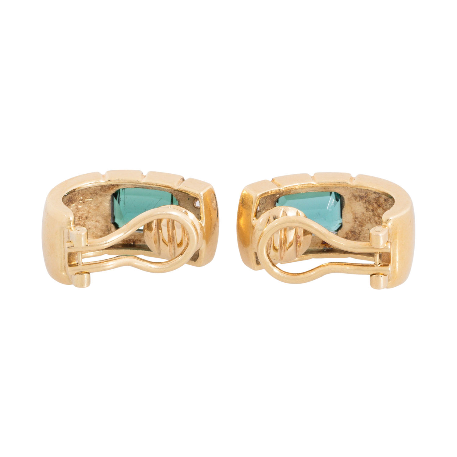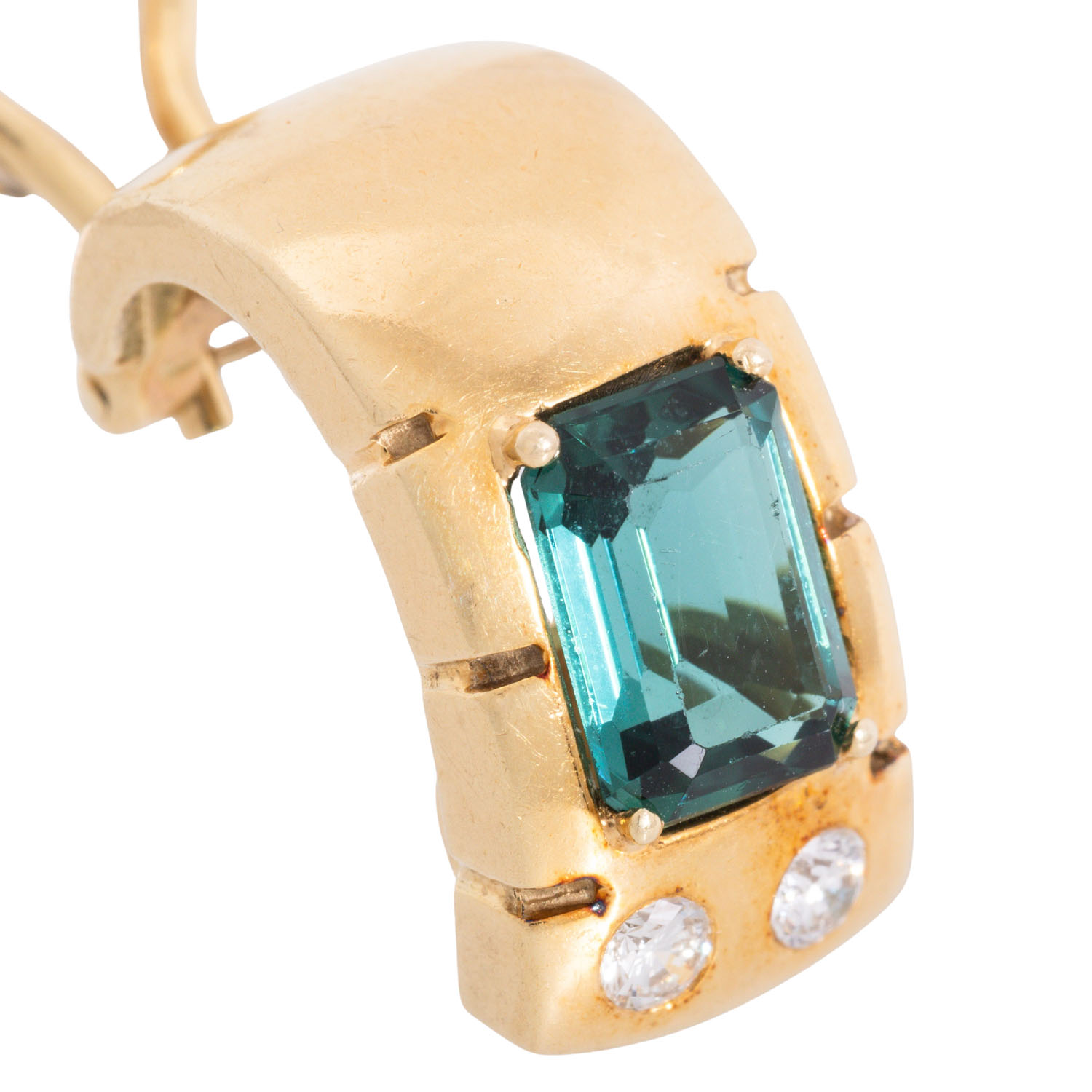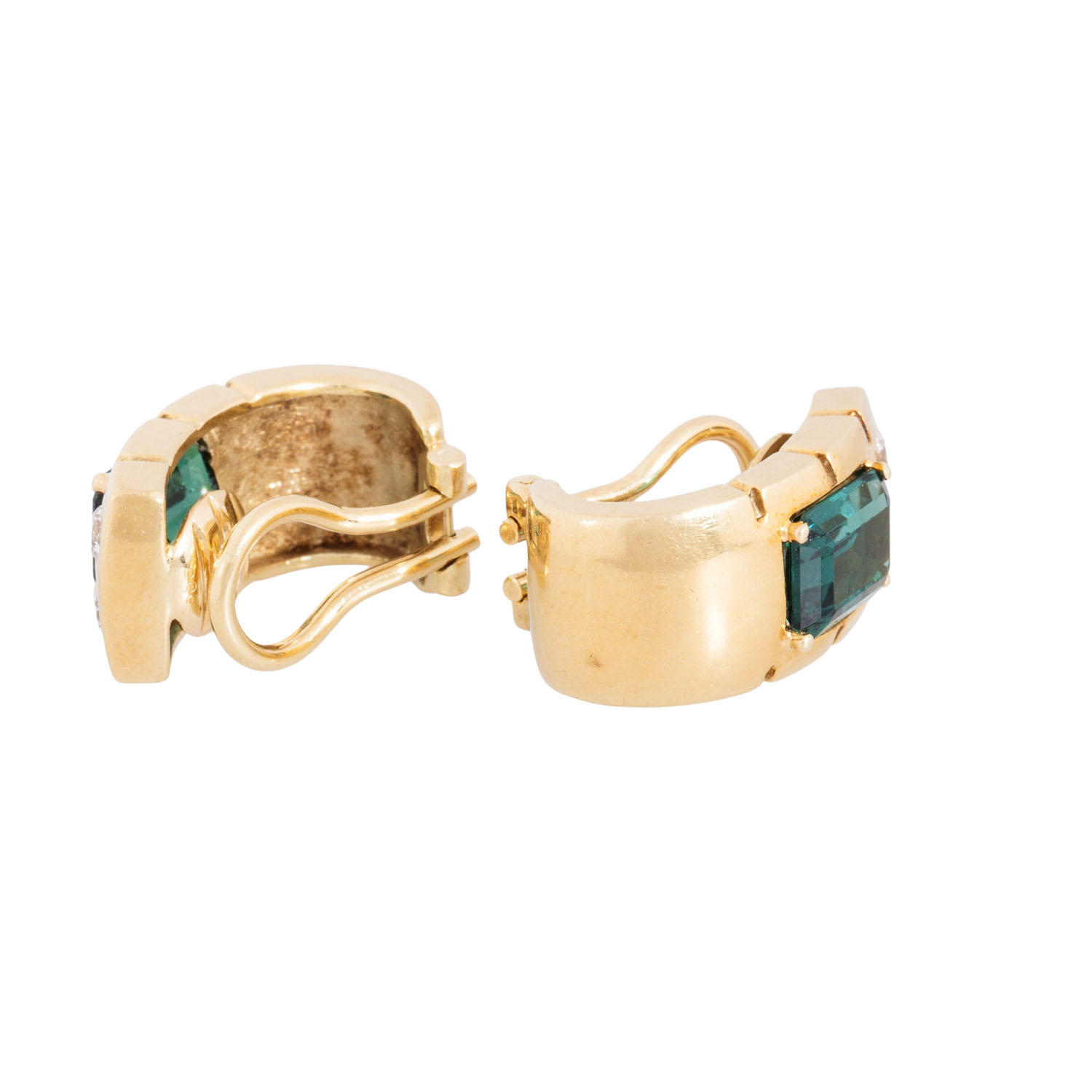 zus. ca. 0,20 ct, WEISS (H)/VS, Turmline im Smaragdschliff, ca. 8 x 6 mm, GG 14K, 9,3 g, L: ca. 18,9 mm, B: ca. 9,5 mm, 2. H. 20. Jh., Tragespuren, Turmaline leicht berieben.