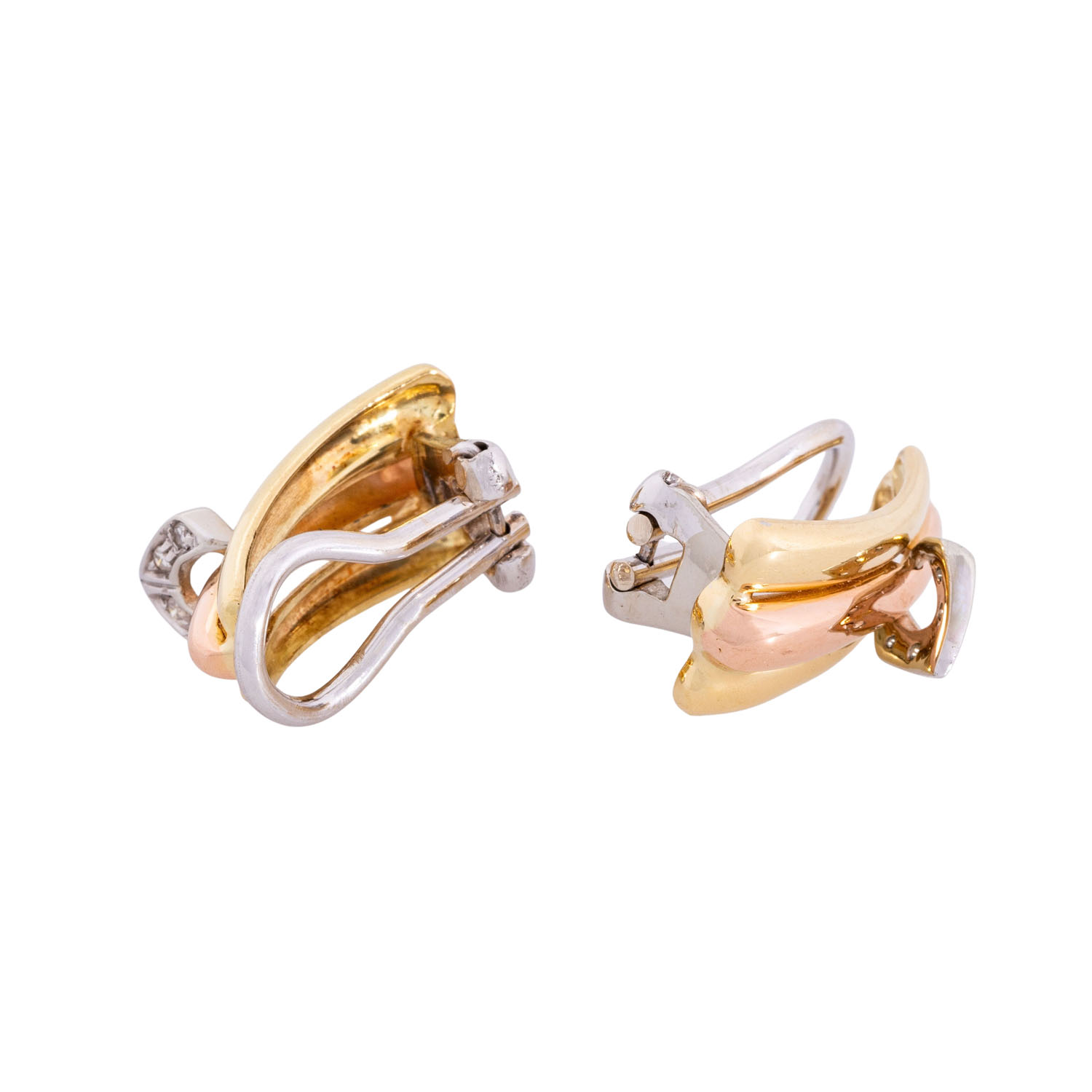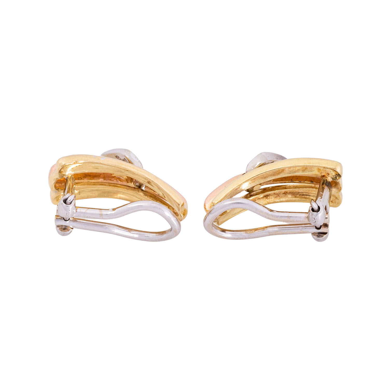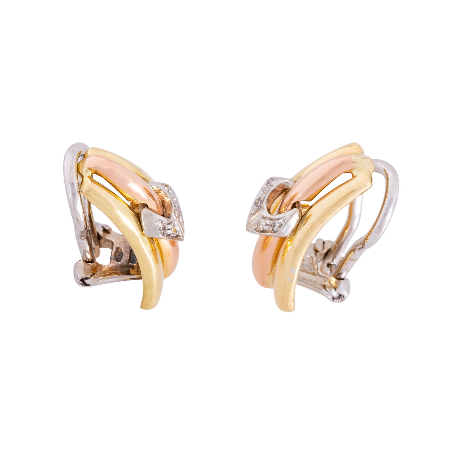 zus. ca. 0,04 ct, gute Farbe und Reinheit, GG/WG/RG 18K, 7,7 g, L: ca. 1,8 cm, B: ca. 1 cm, Ende 20. Jh., minimale Tragespuren.