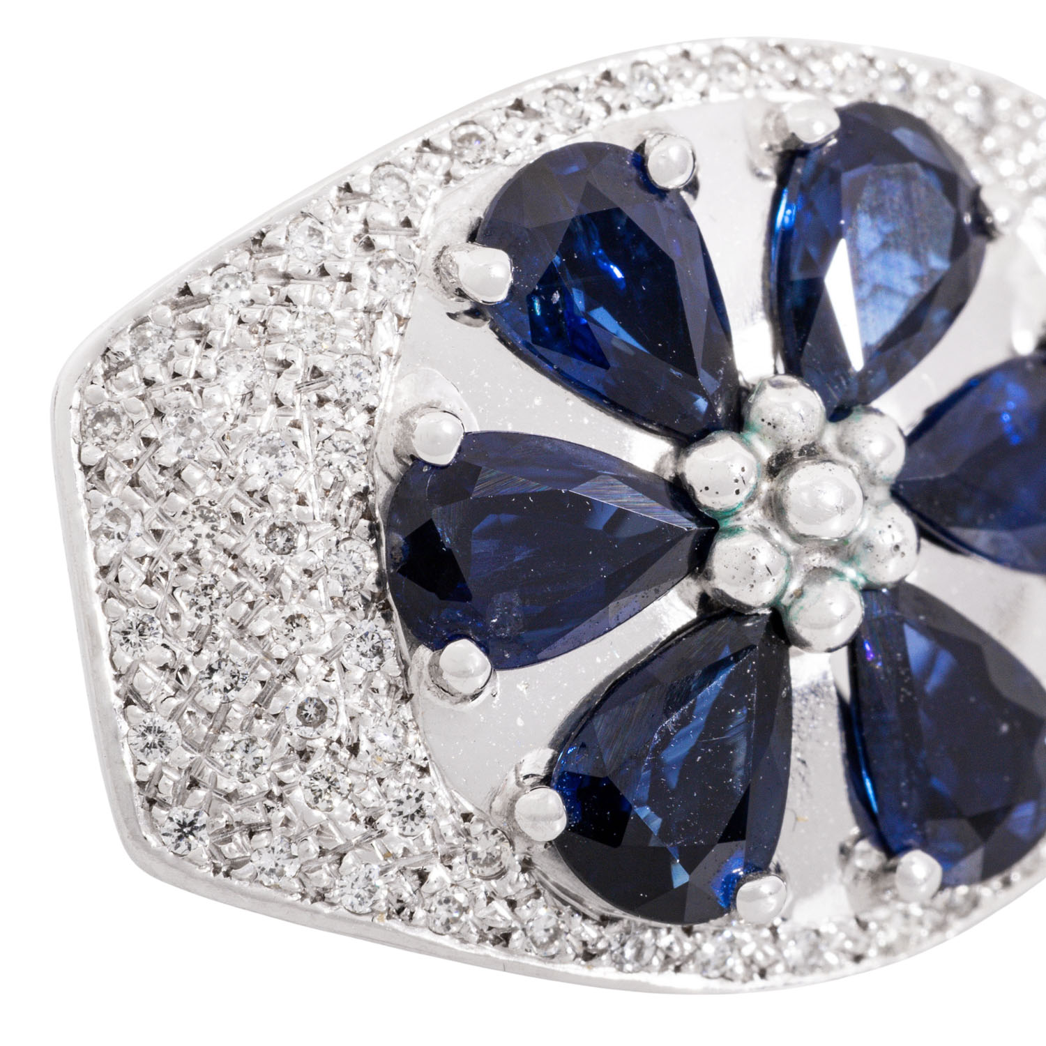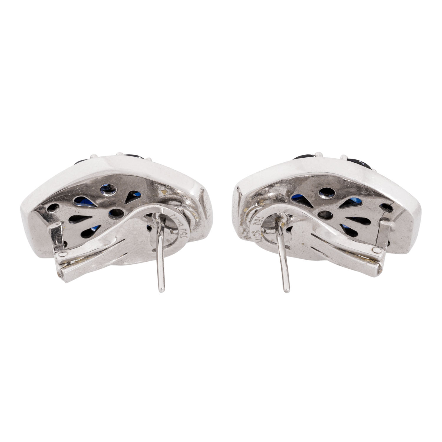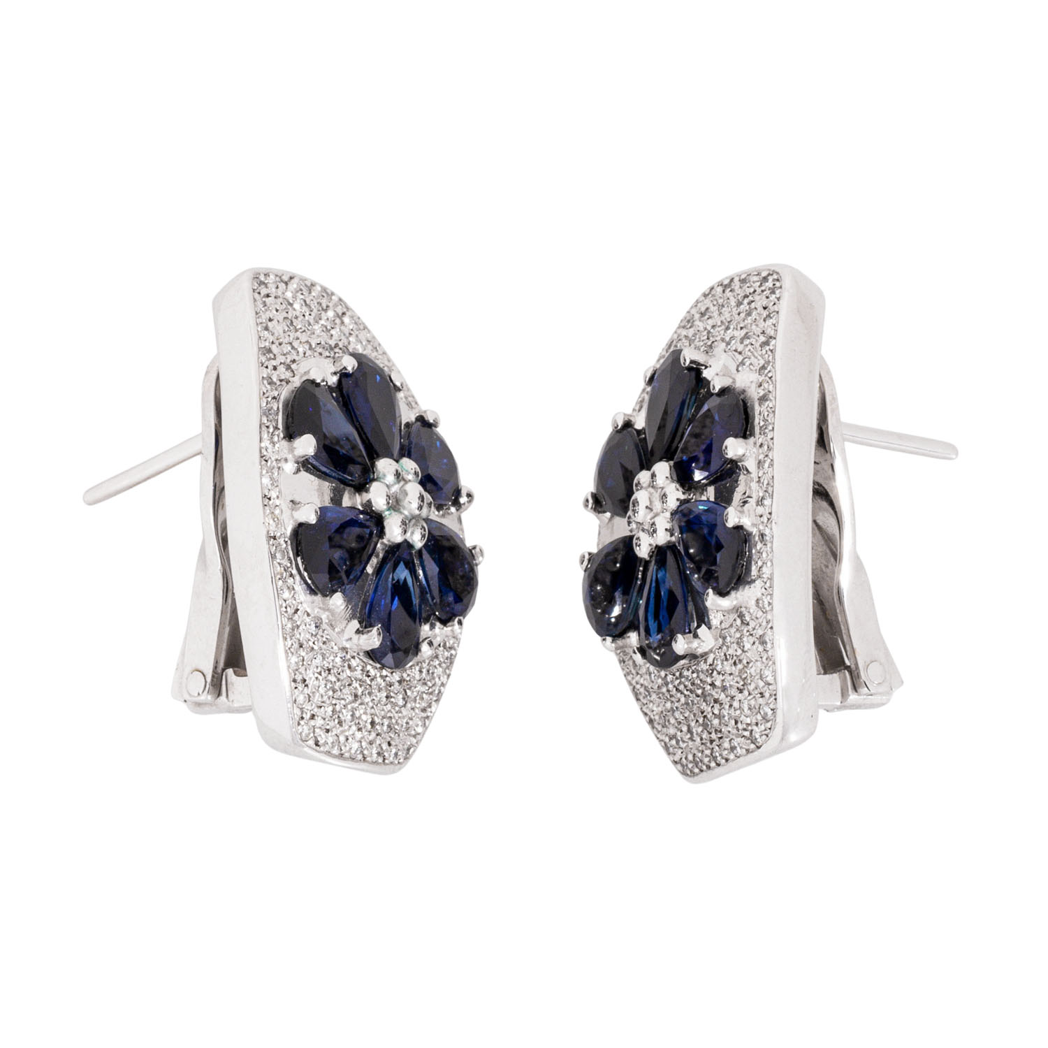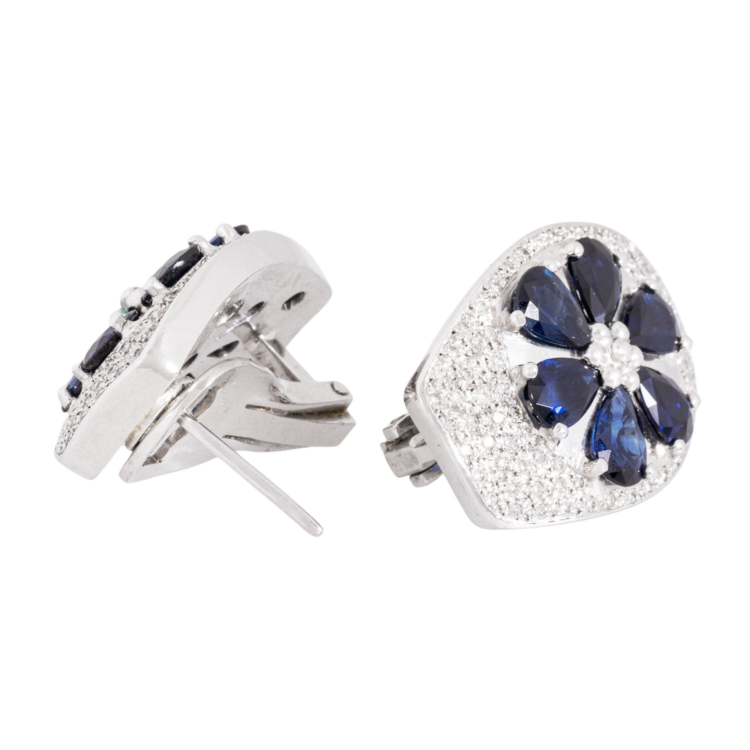 199 Brillanten zus. 4,9 ct, FW (F-G)/VS-SI, 12 tropfenförmige Saphire, WG 18K, 15,6 g, L: ca. 2,5 cm, Ende 20. Jh., leichte Tragespuren, mit Stecker.