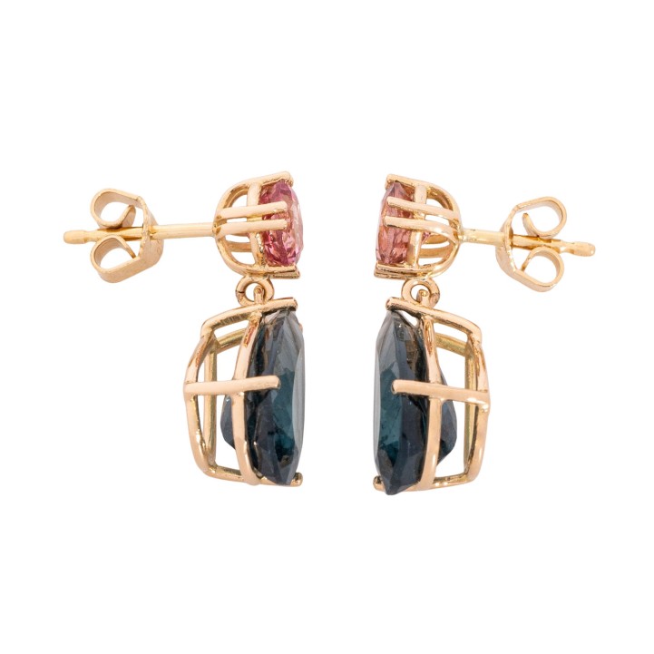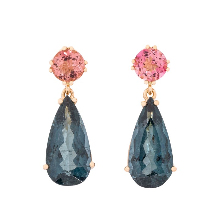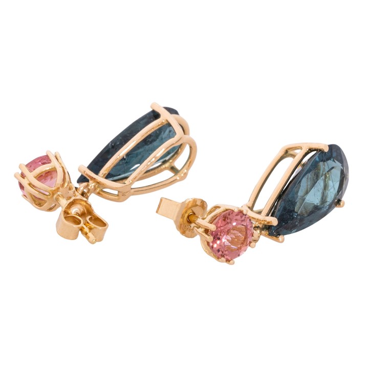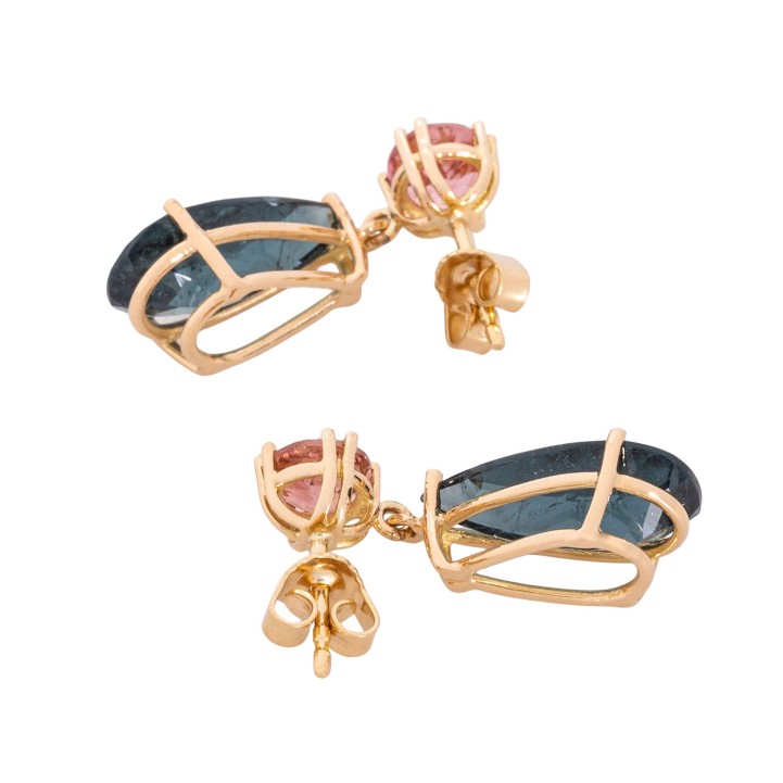 von zus. 1,61 ct und 2 Turmalinen im Tropfenschliff von zus. 8,27 ct, GG 18K, 5,7 g, L: 25 mm, 21. Jh., neuwertiger Zustand.
