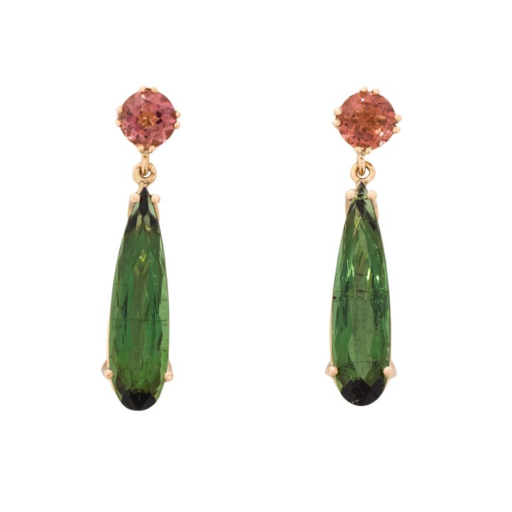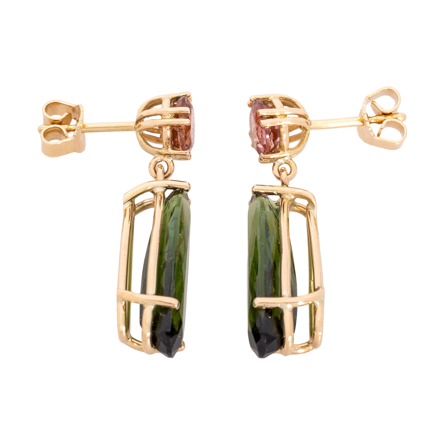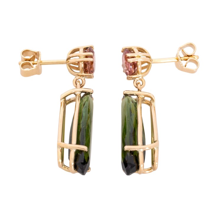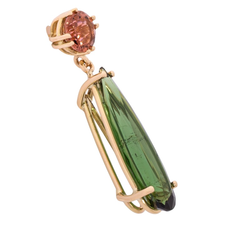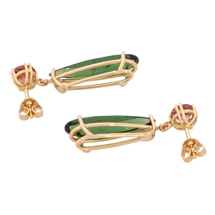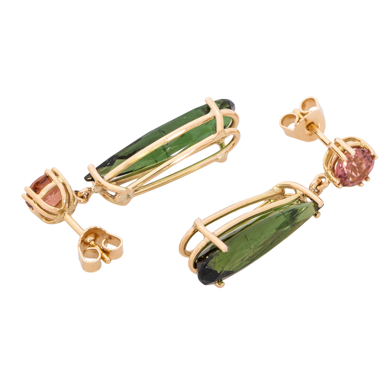 von zus. 1,69 ct und 2 Turmalinen im Tropfenschliff von zus. 9,15 ct, GG 18K, 6,8 g, L: 34 mm, 21. Jh., neuwertiger Zustand.