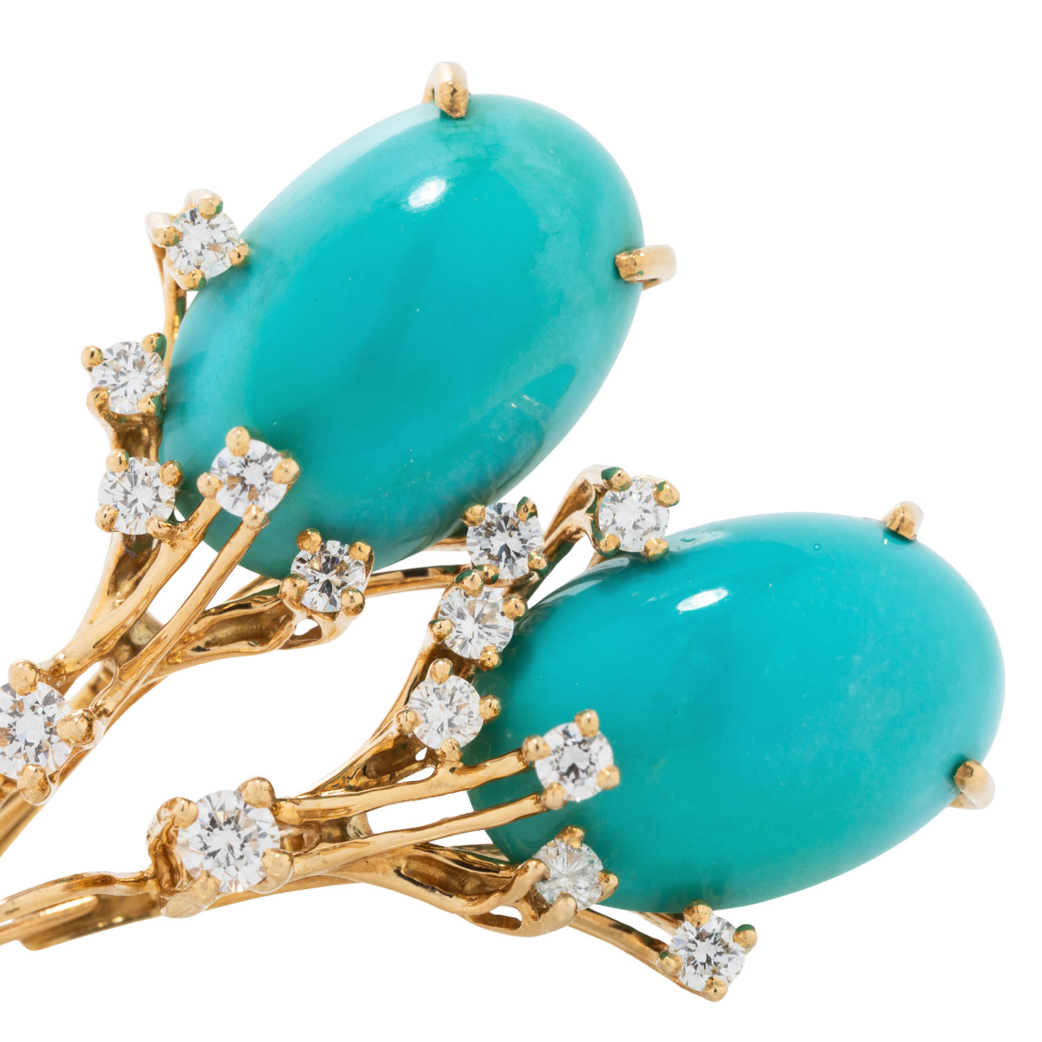 zus. ca. 0,70 ct, FW (F-G)/VS, Türkiscabochons im Ovalschliff ca. 17 x 11 mm, leicht verfärbt durch Öl, GG 18K, 10,4 g, L: ca. 35,5 mm, B: ca. 0,6 - 16 mm, 2. H. 20. Jh., minimale Tragespuren, mit Herstellerpunze 'RB', Handarbeit.