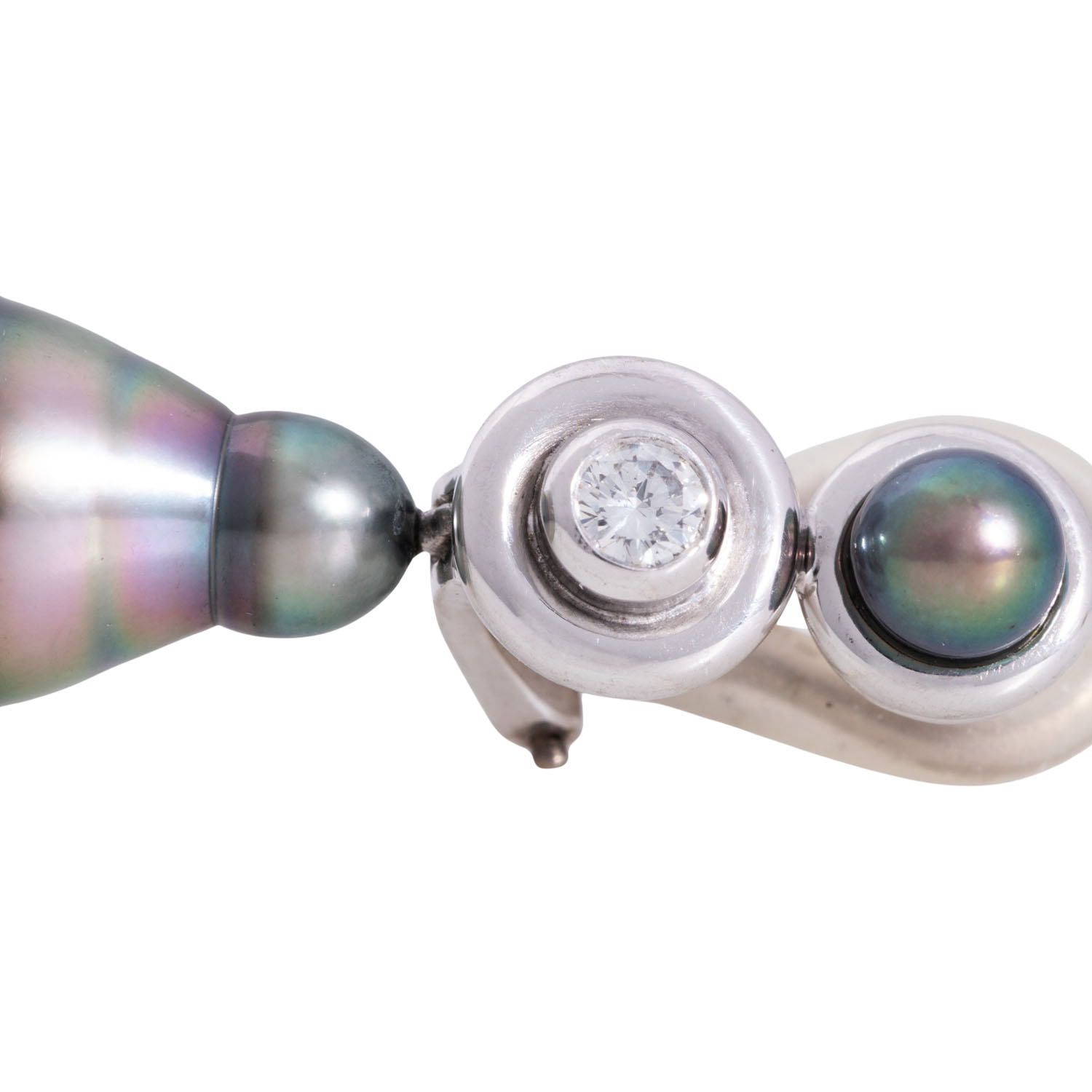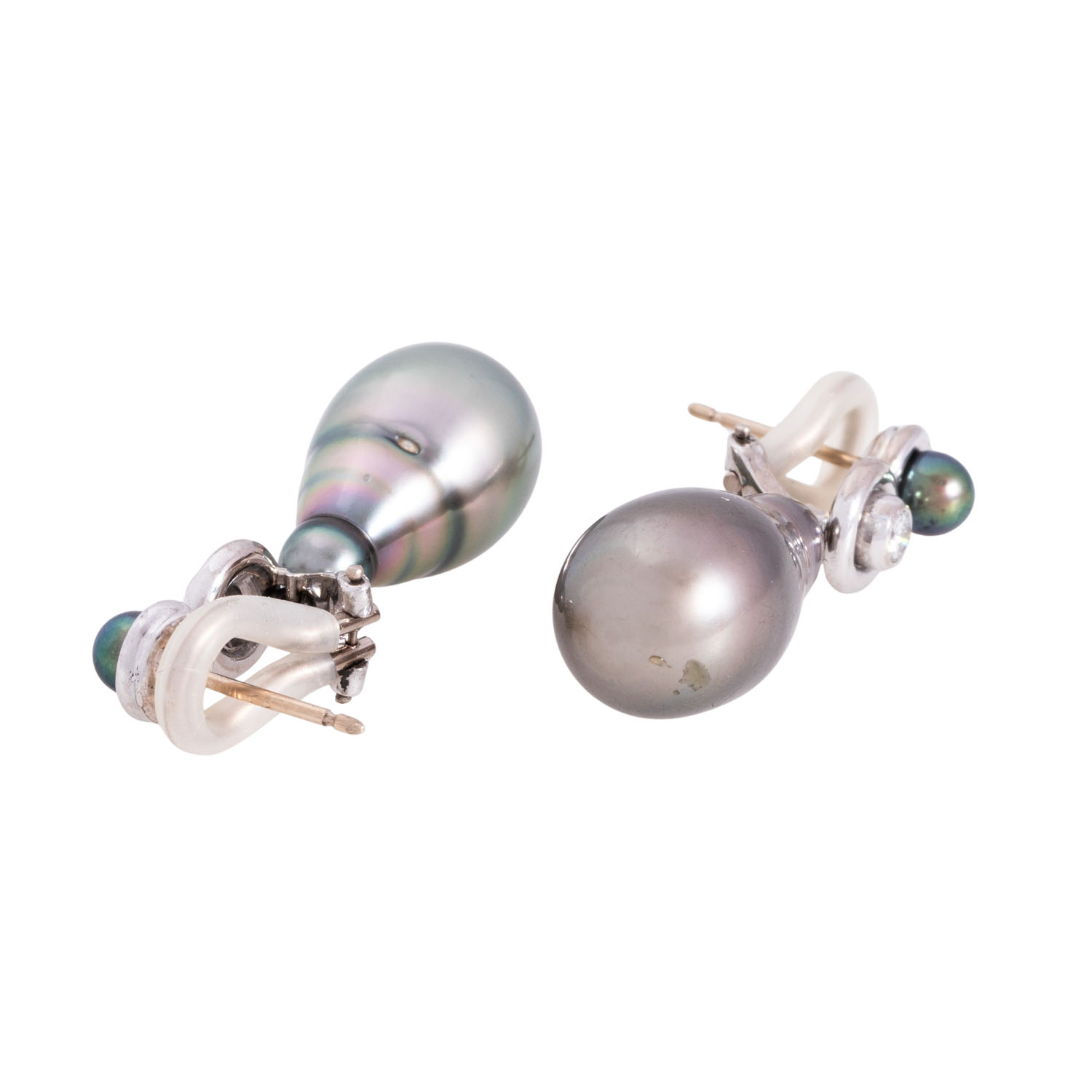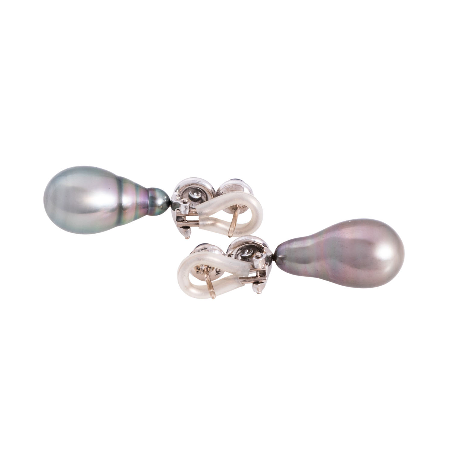2 runde Perlen, D: ca. 4,8 mm, 2 tropfenförmige Perlen, ca. 22 x 12 mm, guter Lüster, 2 Brillanten, ges. ca. 0,2 ct WEISS (H)/VS, WG 18K, 14,2 g, L x B: ca. 36 x 12 mm, Bügel mit Silikonummantelung, Ende 20. Jh., minimale Tragespuren, Handarbeit von von Hofen.