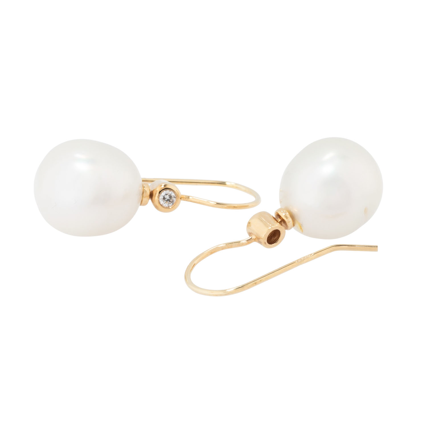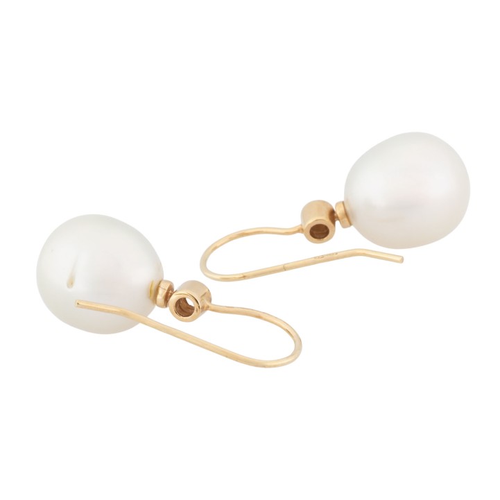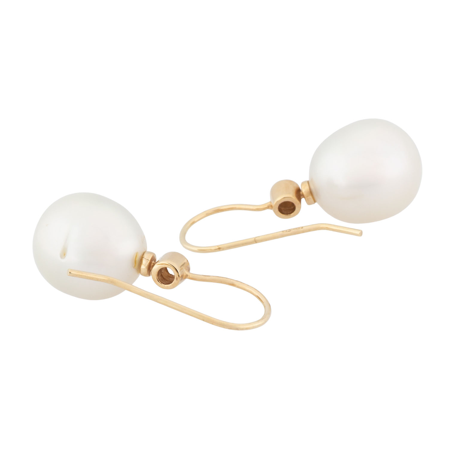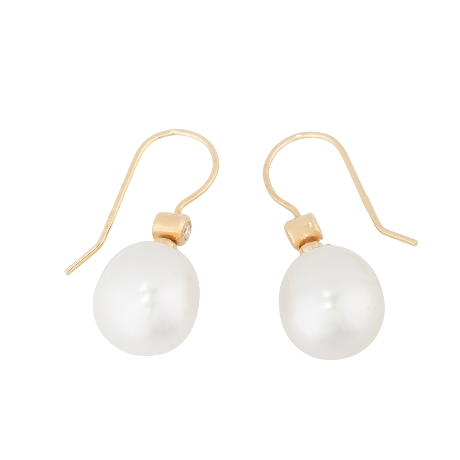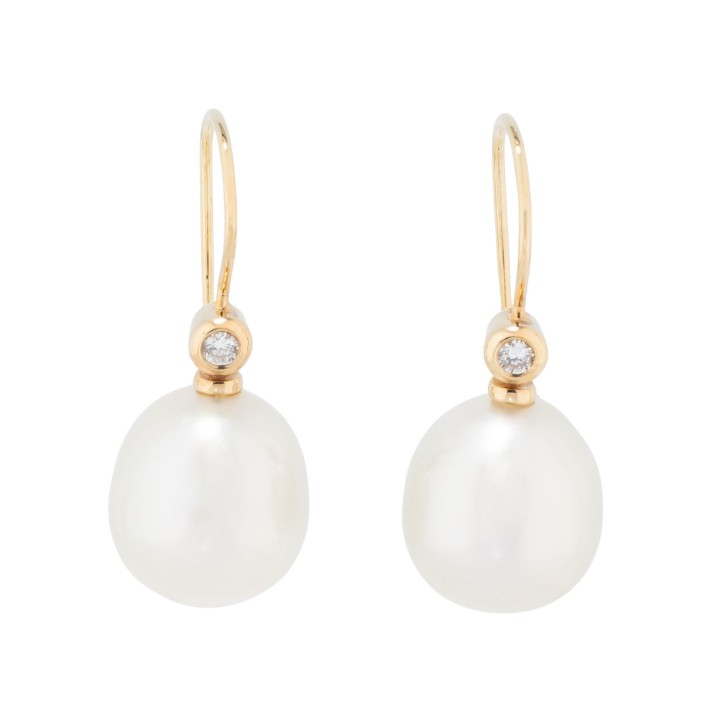 zwei Südseeperlen, tropfenförmig, D.: ca. 12 mm, Farbe: Weiß, geringe Wachstumsmerkmale, 2 Brillanten von zus. ca. 0,15 ct, gute Farbe und Reinheit, GG 18K, 9,7 g, 20./21. Jh., leichte Tragespuren.
