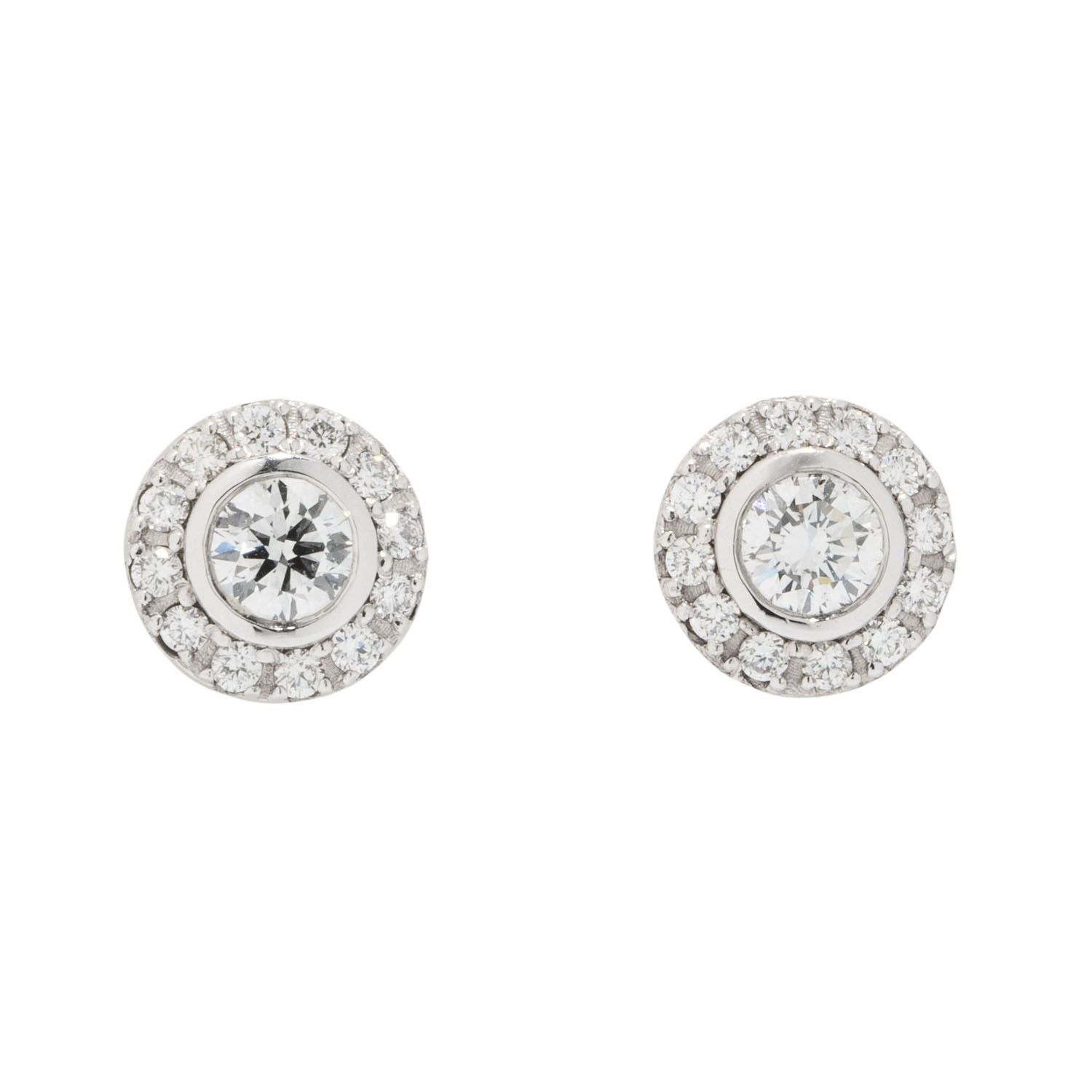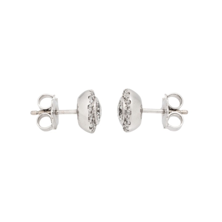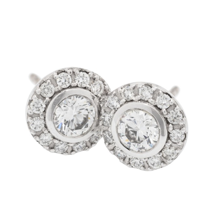 von zus. 0,61 ct, umgeben von 24 Diamanten im Brillantschliff von zus. 0,30 ct, FW (G)/SI, WG 18 K, 4,7 g, D: 8,5 mm, 21. Jh., neuwertiger Zustand. Juwelierqualität.