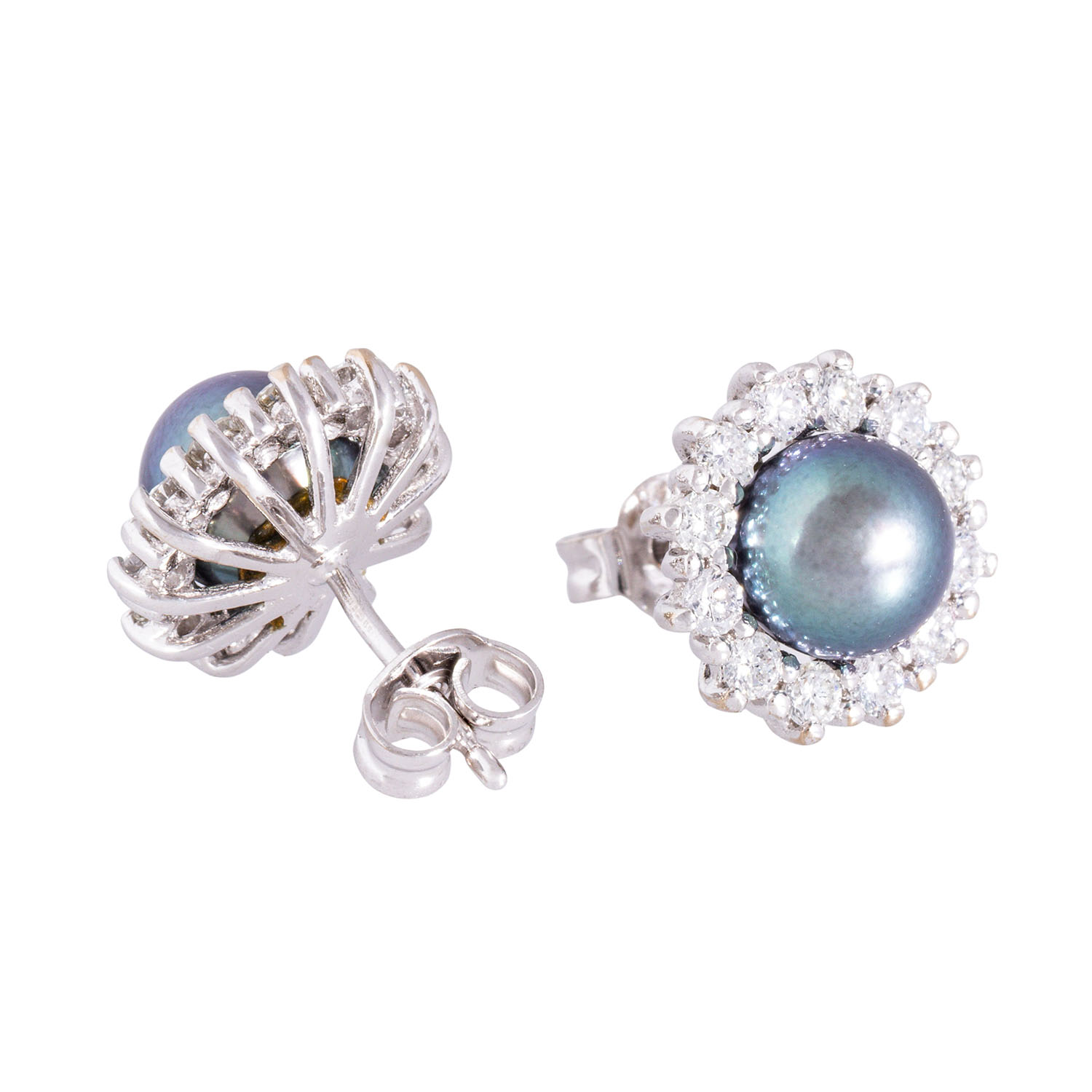 Paar Ohrstecker mit 2 Akoyaperlen entouriert von je 10 Achtkantdiamanten