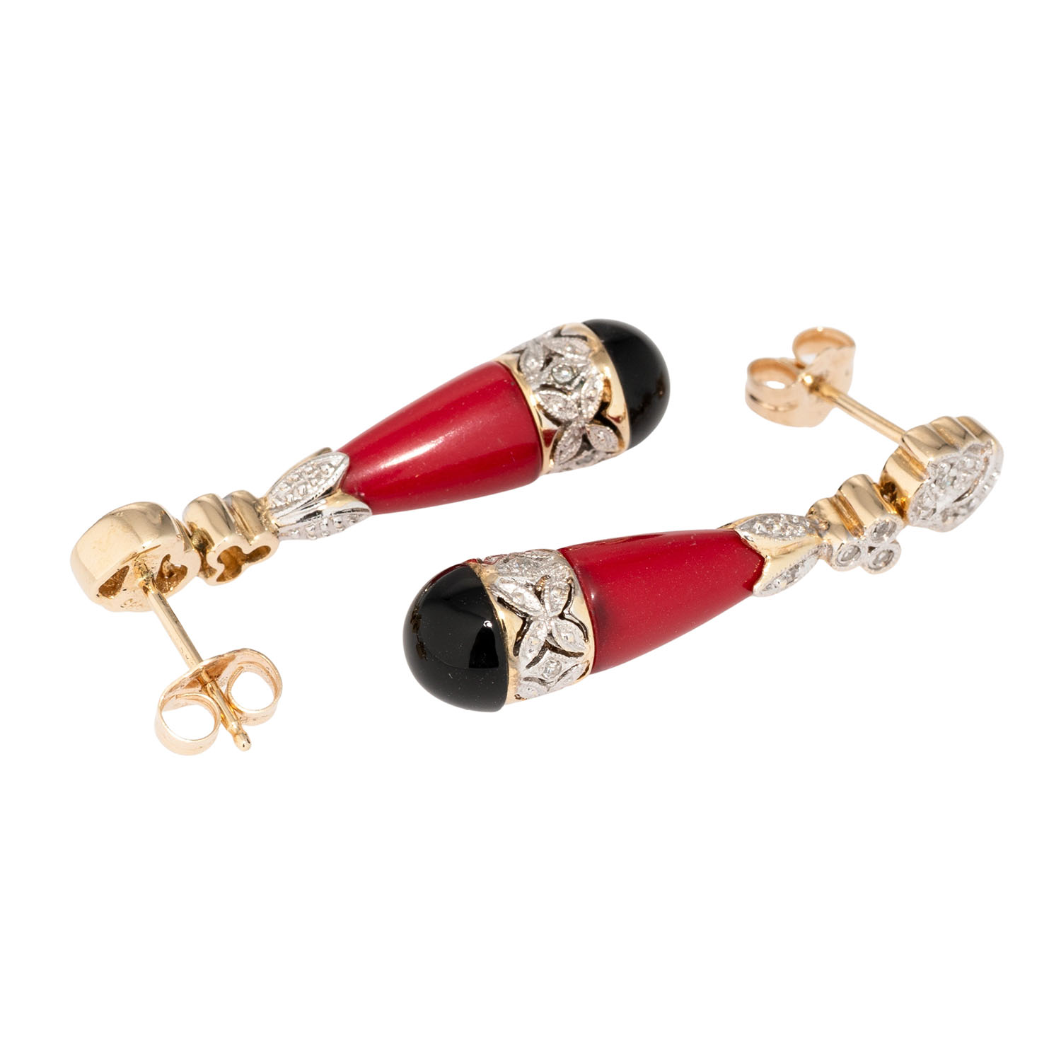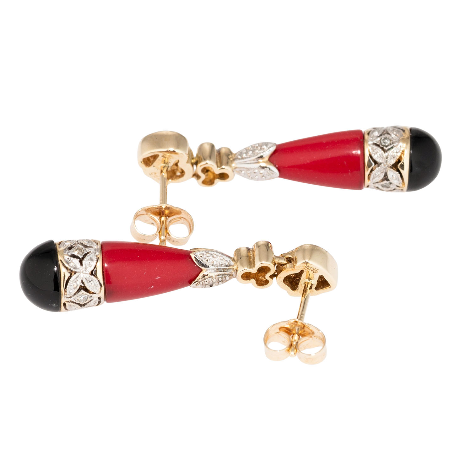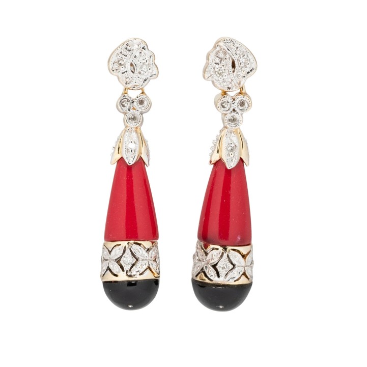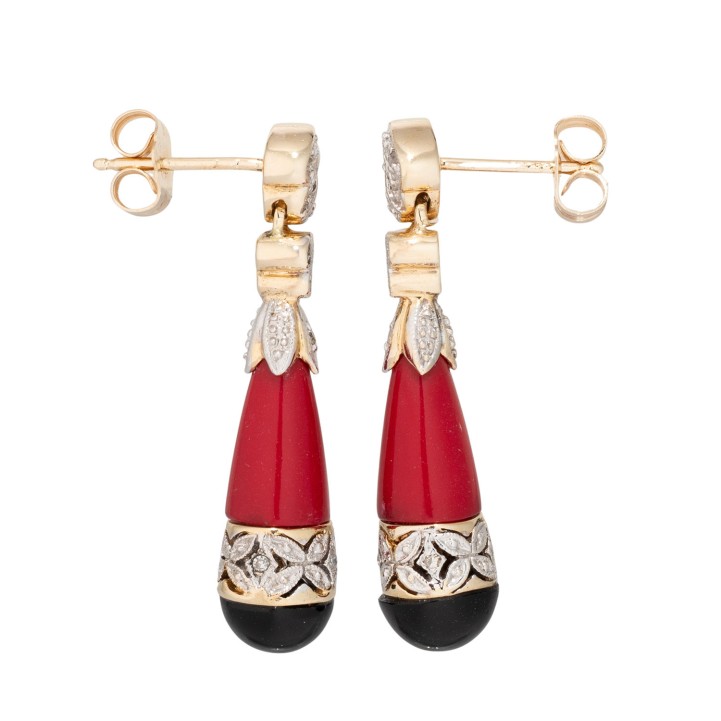 zusammengesetzt mit Onyx, Cabochon, D: 7 mm, und Koralle (Kegelstumpf), 20 Achtkantdiamanten, ges. ca. 0,08 ct, GG 14K, 5,7 g, L x B: 32 x 7 mm, Ende 20. Jh., minimale Tragespuren. Hinweis: Corallium-Arten unterliegen dem Artenschutzabkommen gemäß VO (EG) 3407/2009 Anhang III. Kein Versand außerhalb der EU.