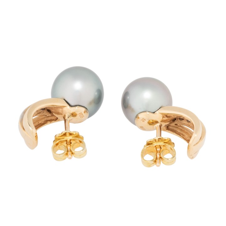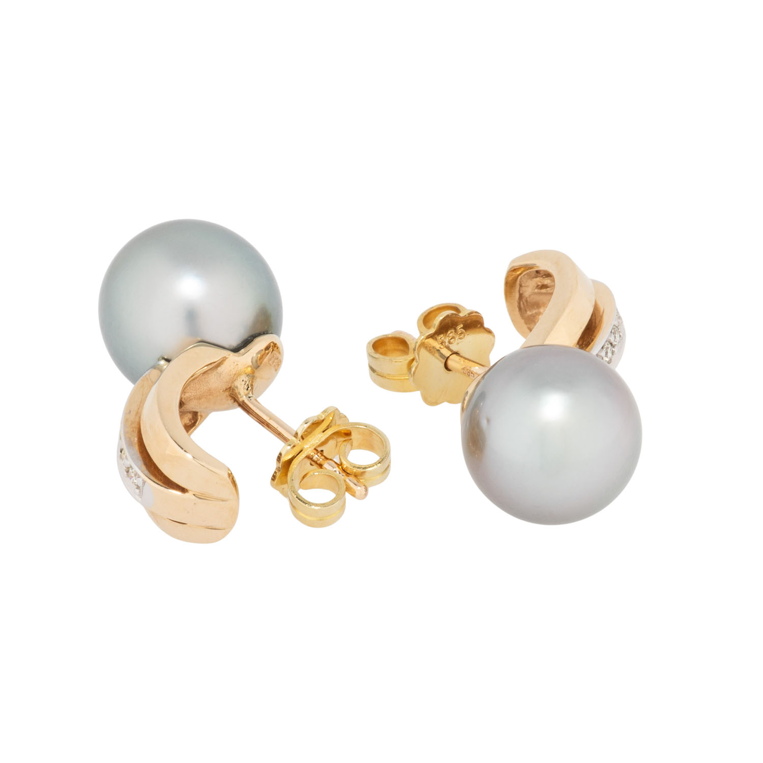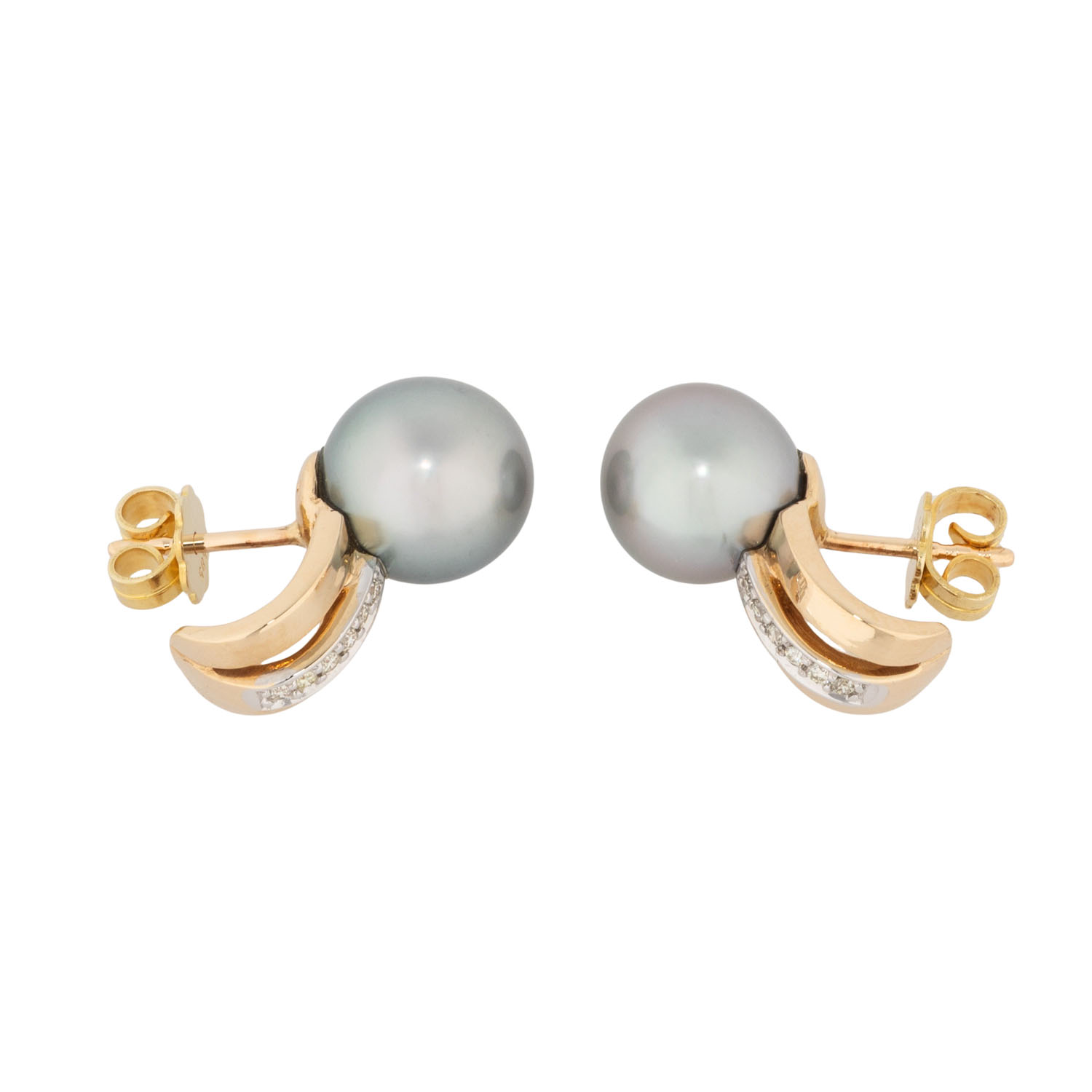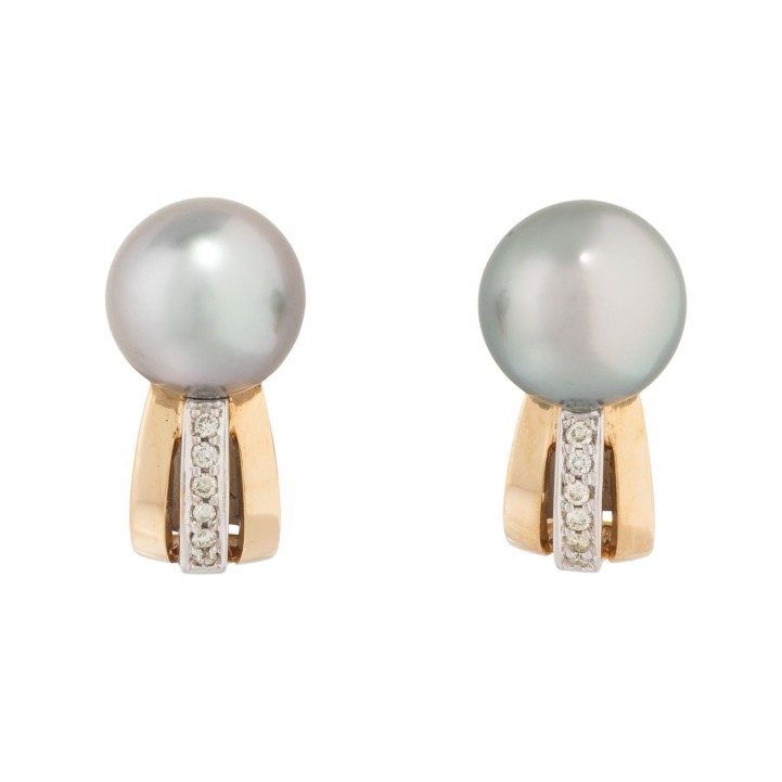 und 12 Diamanten im Brillantschliff von zus. ca. 0,2 ct, mittlere Farbe und gute Reinheit, graufarbene Tahiti-Zuchtperlen 11 und 10 mm, feiner Lüster, GG 14K, 7 g, L x B 20 x 11 mm, 21. Jh., guter Zustand.